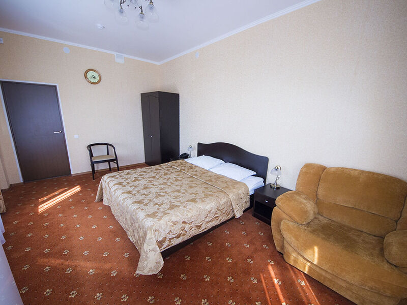 36 кв.м, двуспальная кровать, диван, шкаф, прикроватная тумбочка, сейф, с/у с душем, ТВ, мини-холодильник, столик с необходимым набором посуды, чайник.