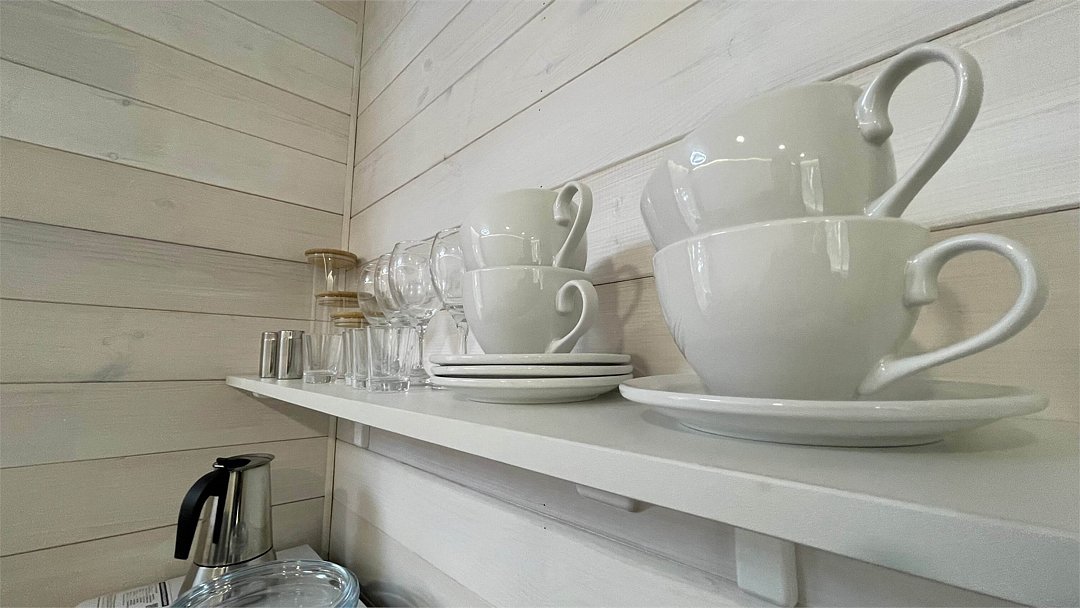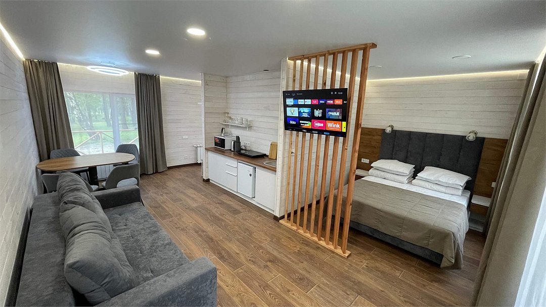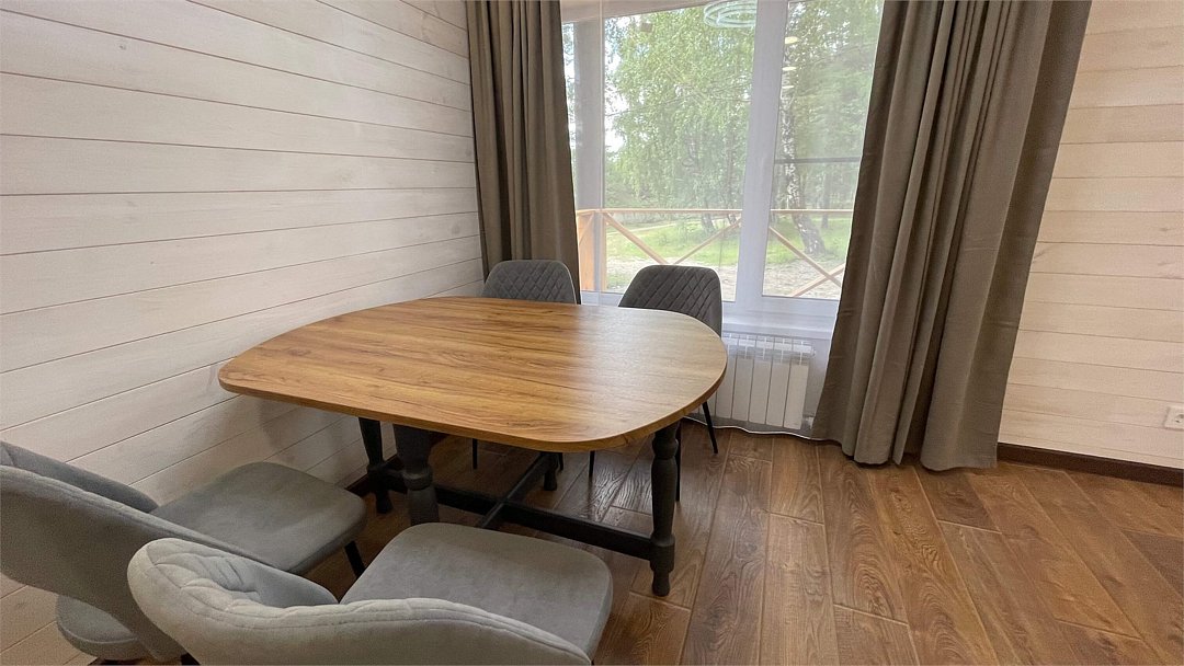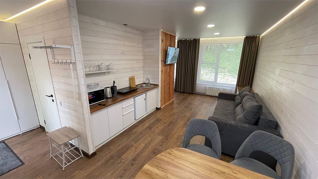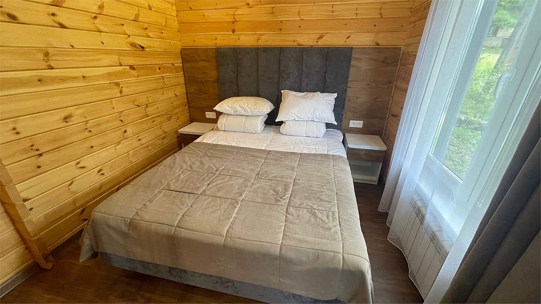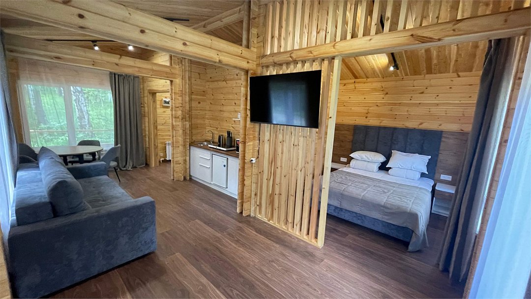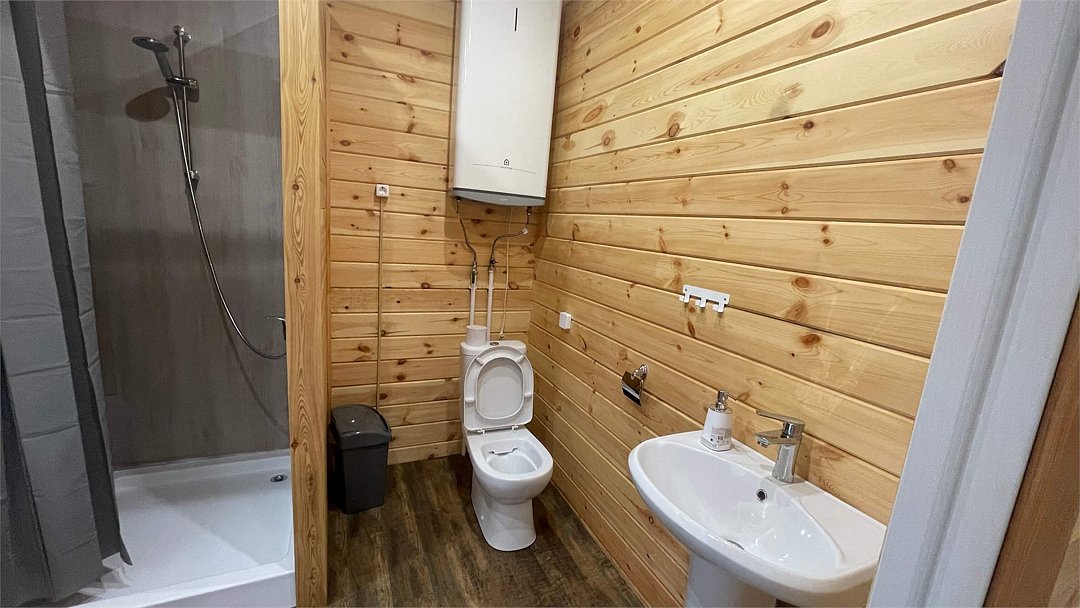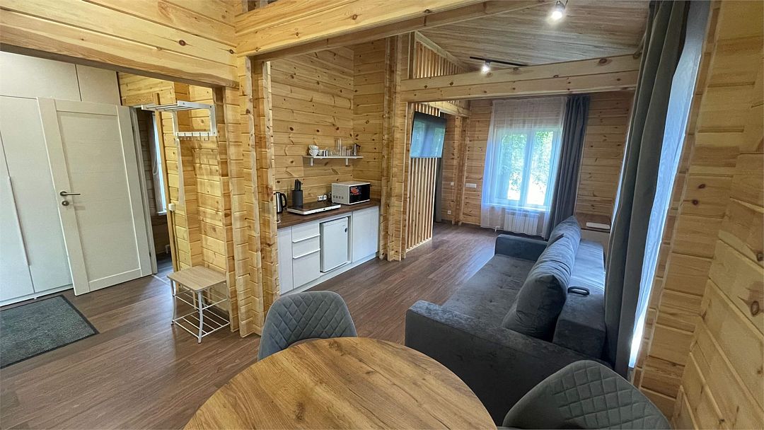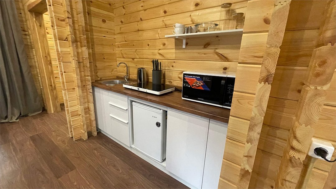 В домике имеется оборудованная кухня, обеденный стол, ванная комната с душевой кабиной, телевизор, Wi-Fi, тёплый пол.