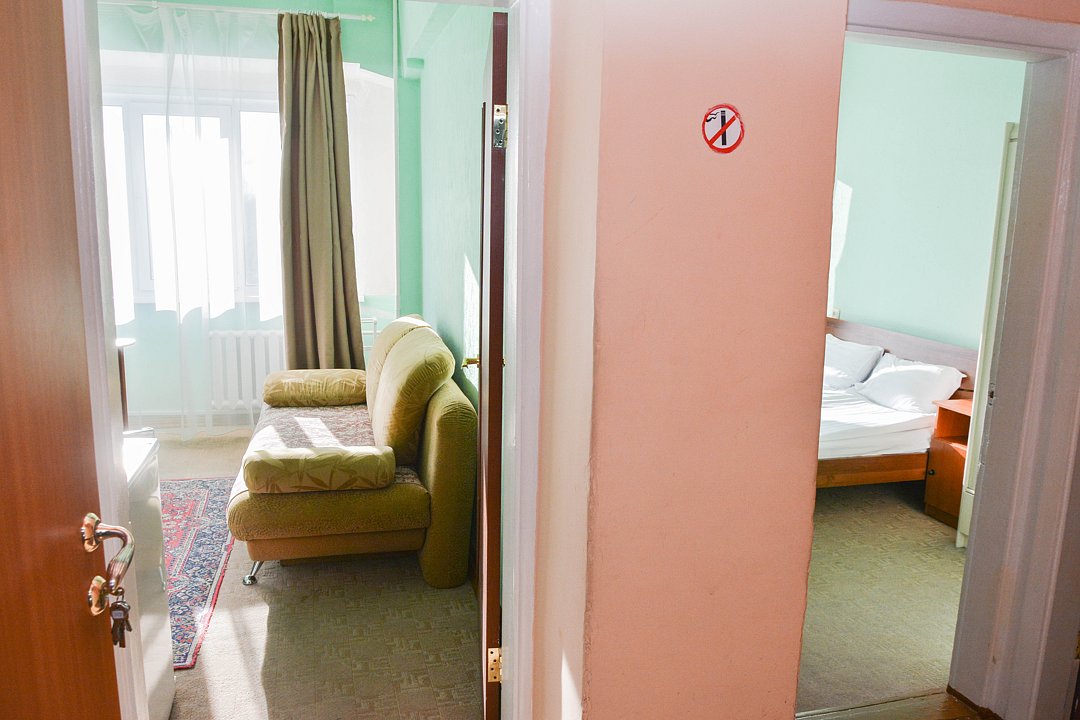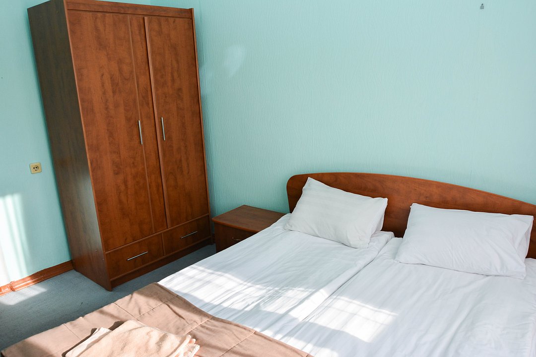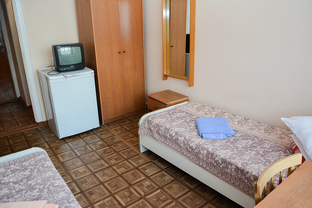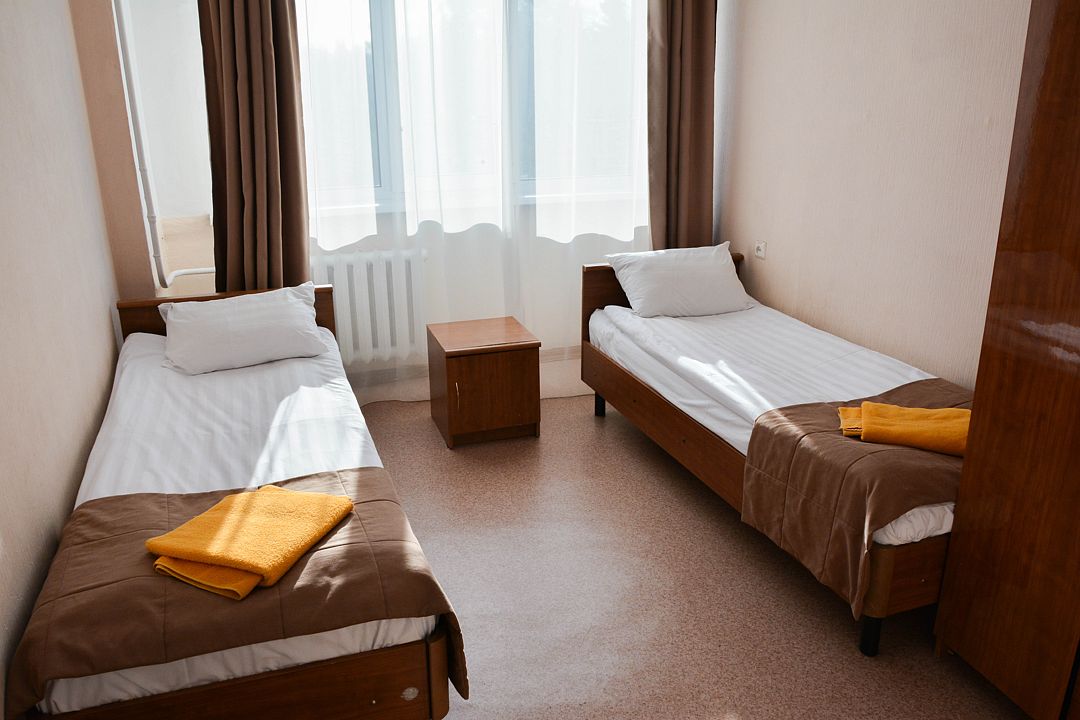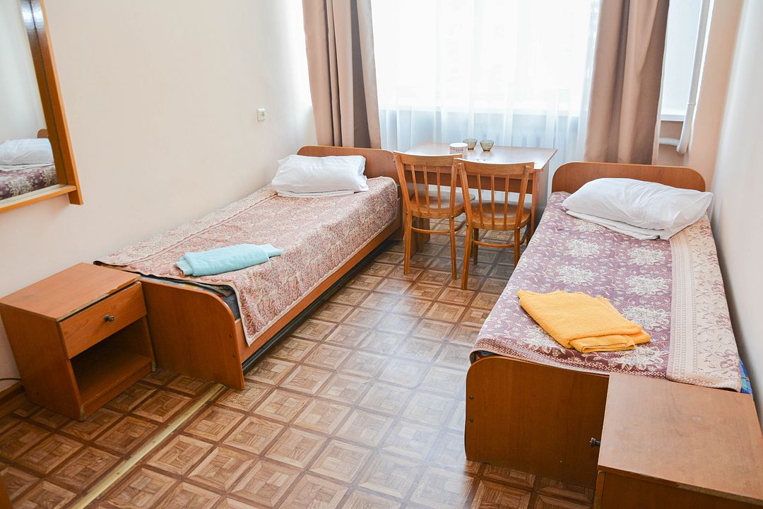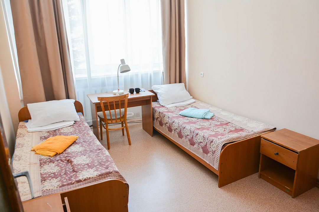 Небольшой удобный номер, состоящий из одной жилой комнаты с двумя односпальными кроватями. Имеется ванная комната в блоке из двух номеров, общий коридор. Номер рассчитан на проживание двух человек с подселением. Расположение: Корпус Саяны.