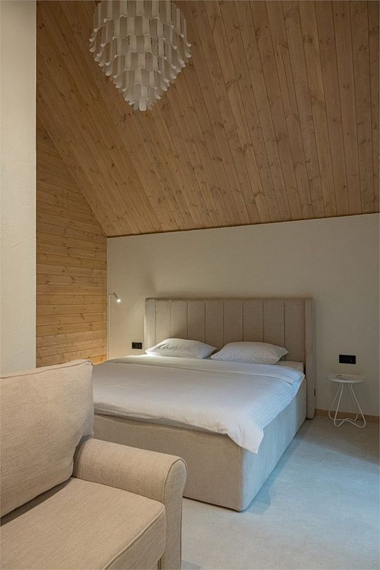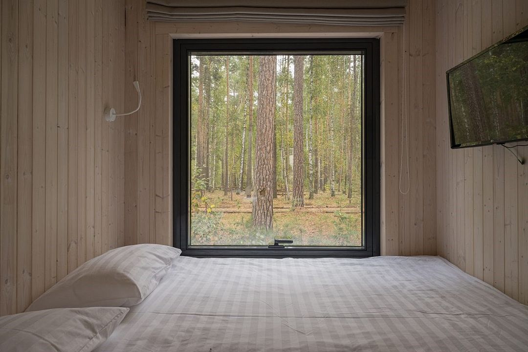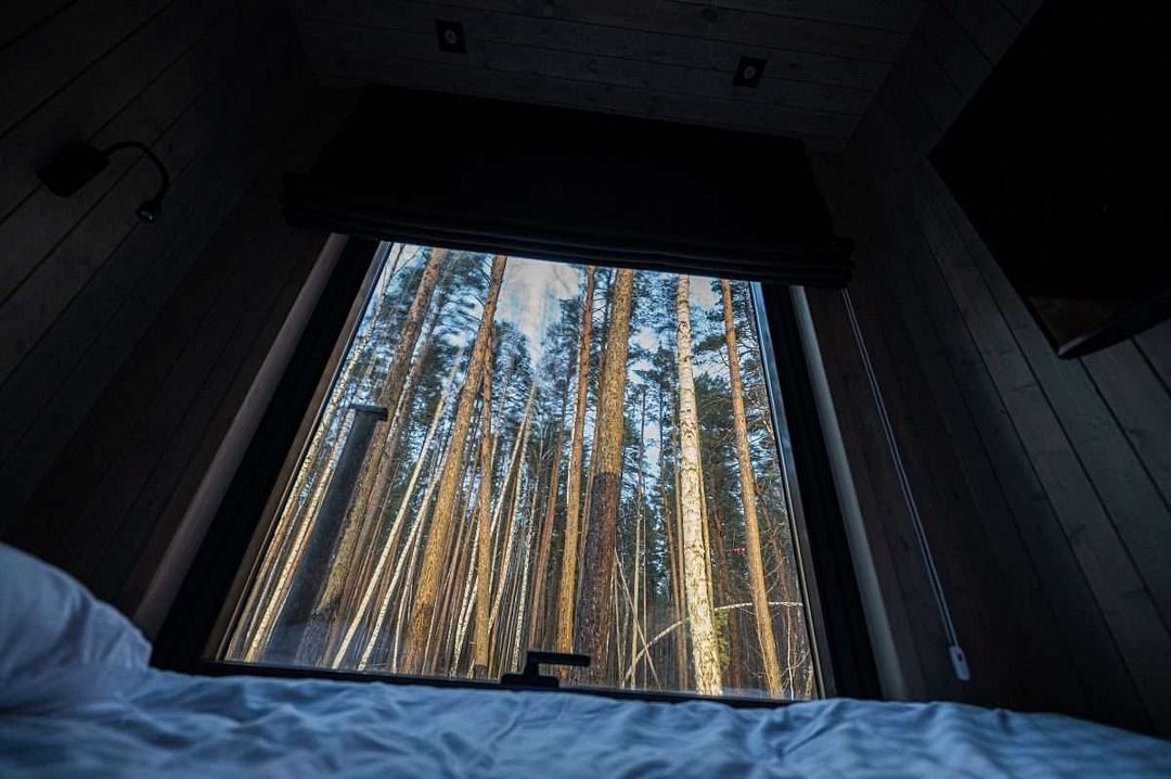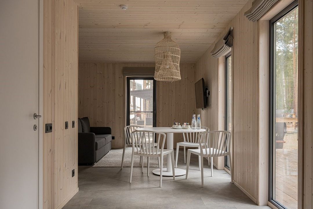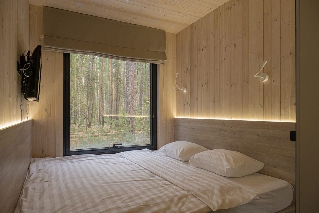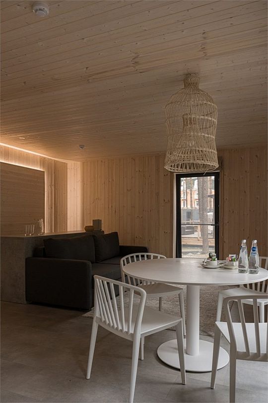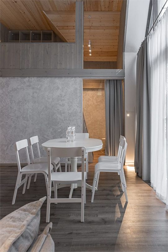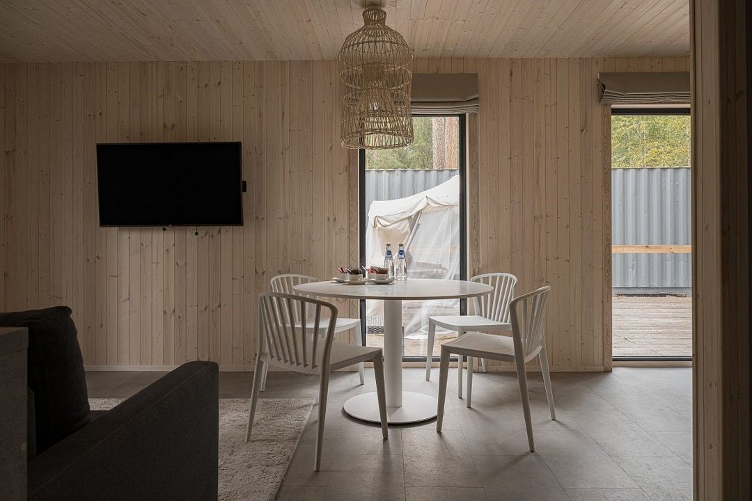 Простота и утонченность интерьера не требуют дополнительных декораций, панорамные окна наполняют зал светом и воздухом, а балкон с потрясающим видом на лес станет отличной площадкой для уникальных фотографий.