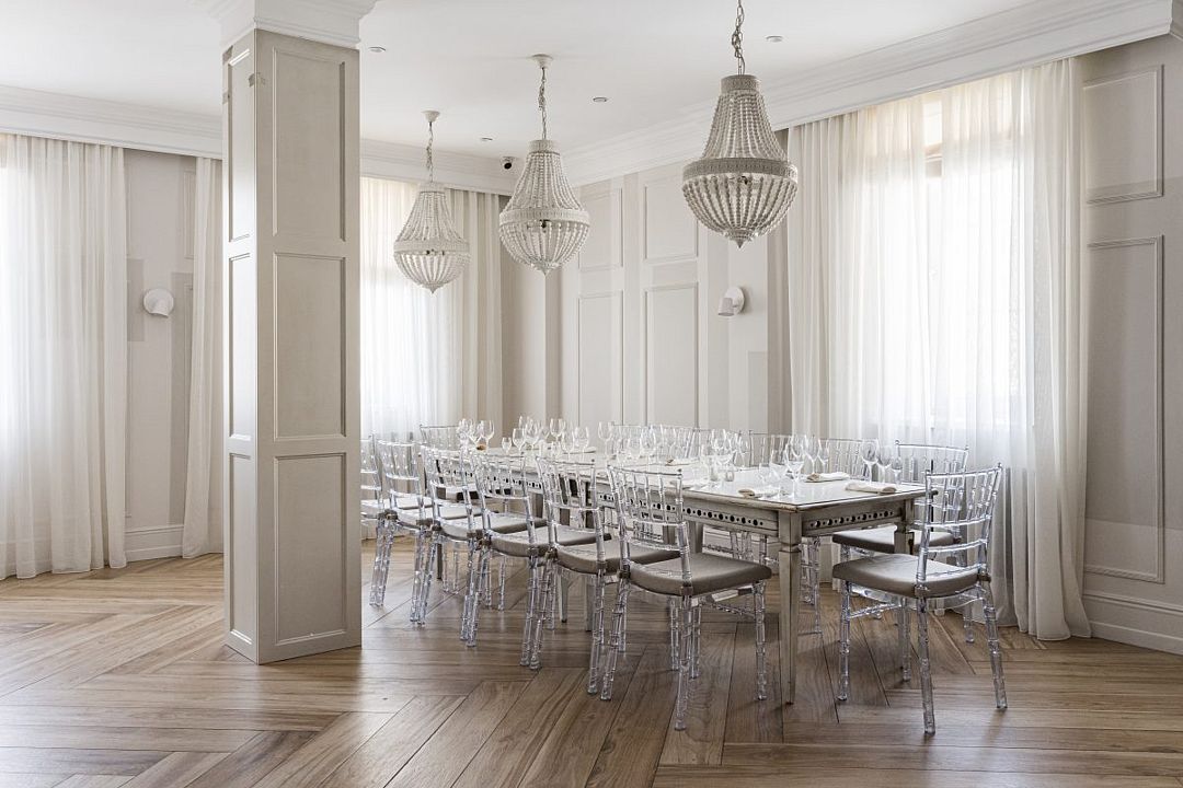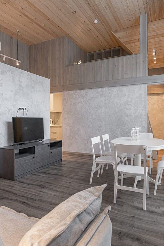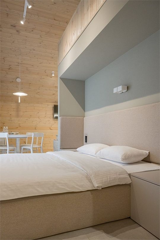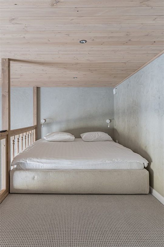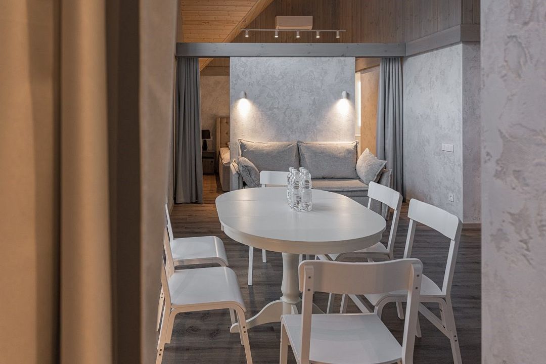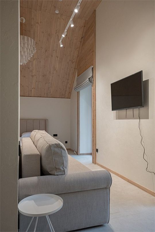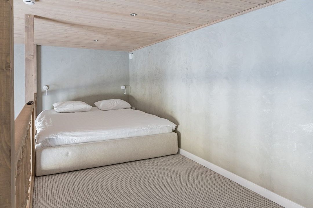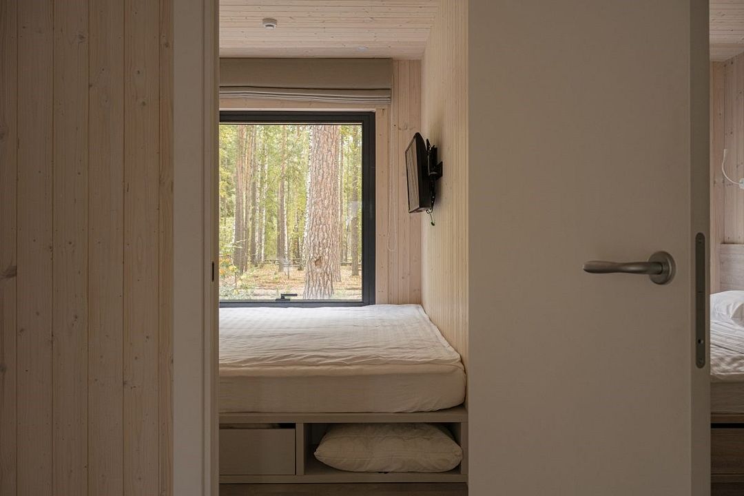 Простота и утонченность интерьера не требуют дополнительных декораций, панорамные окна наполняют зал светом и воздухом, а балкон с потрясающим видом на лес станет отличной площадкой для уникальных фотографий.