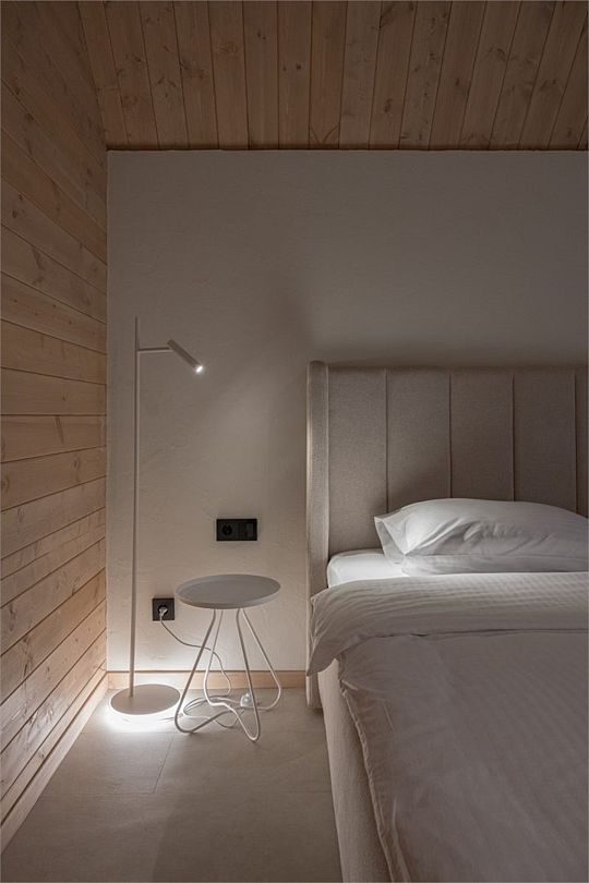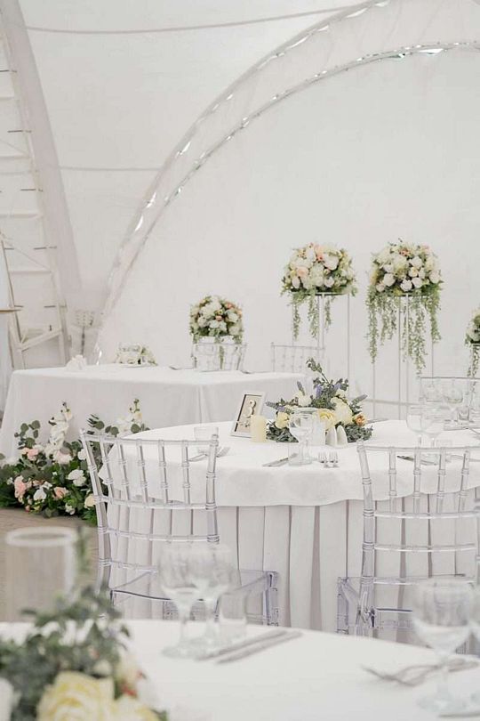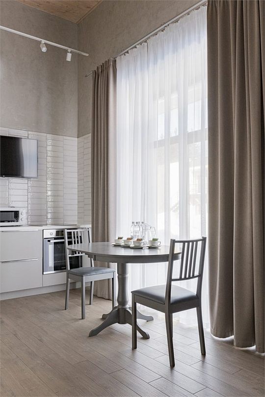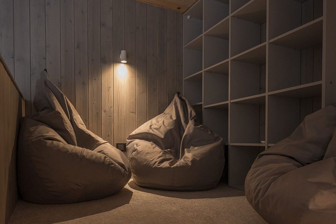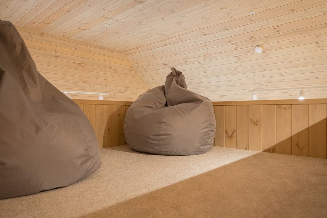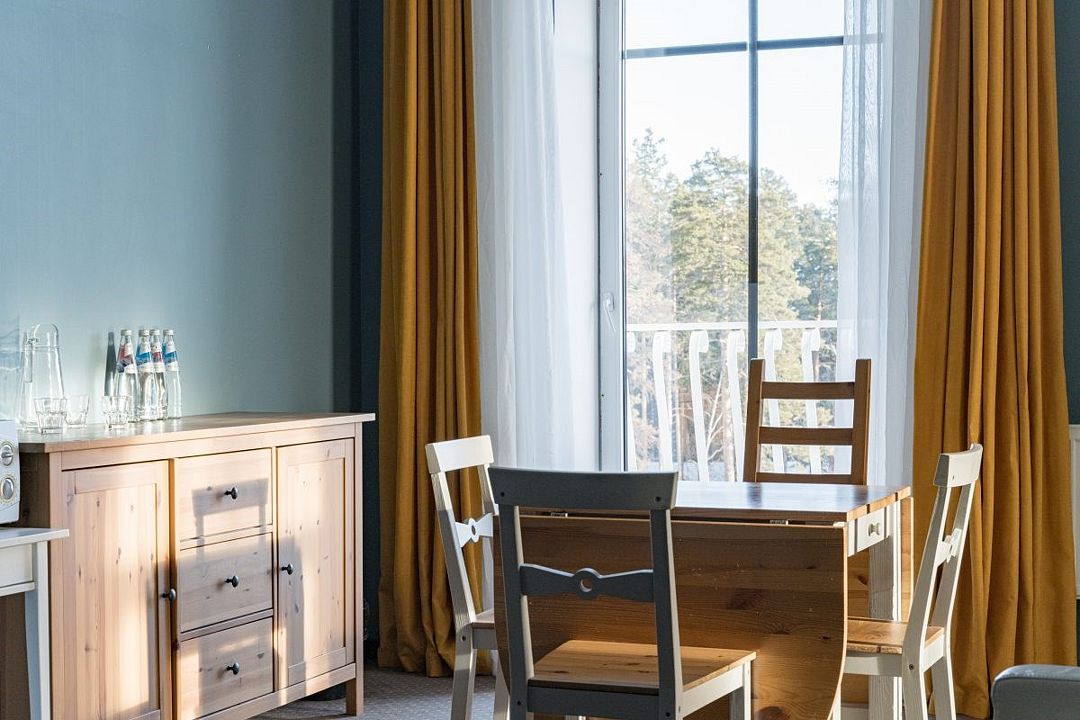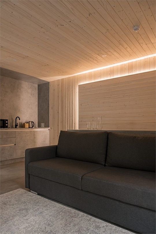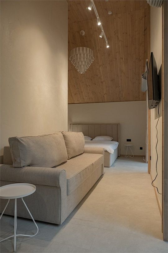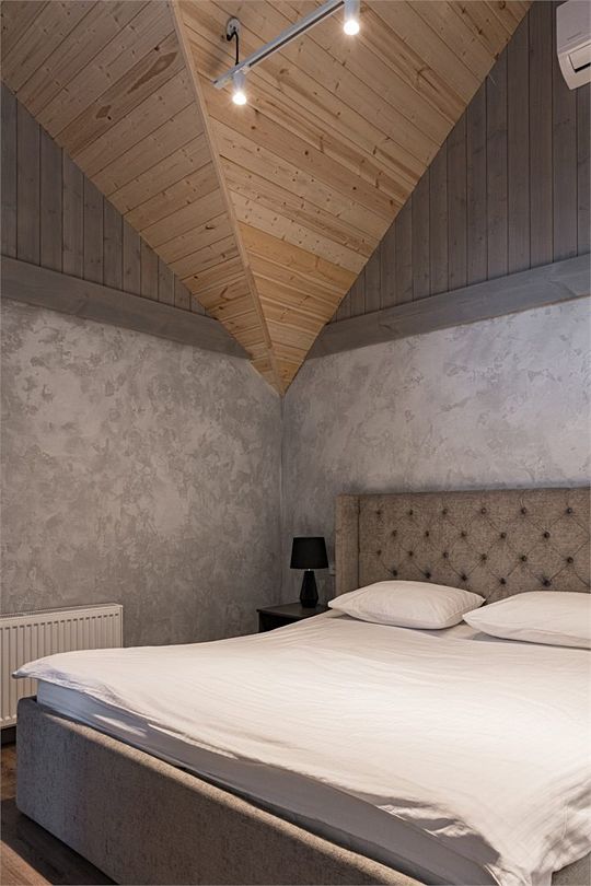 Простота и утонченность интерьера не требуют дополнительных декораций, панорамные окна наполняют зал светом и воздухом, а балкон с потрясающим видом на лес станет отличной площадкой для уникальных фотографий.