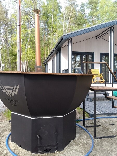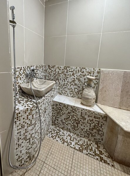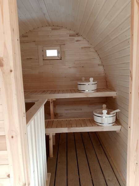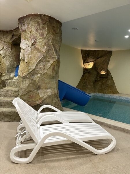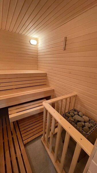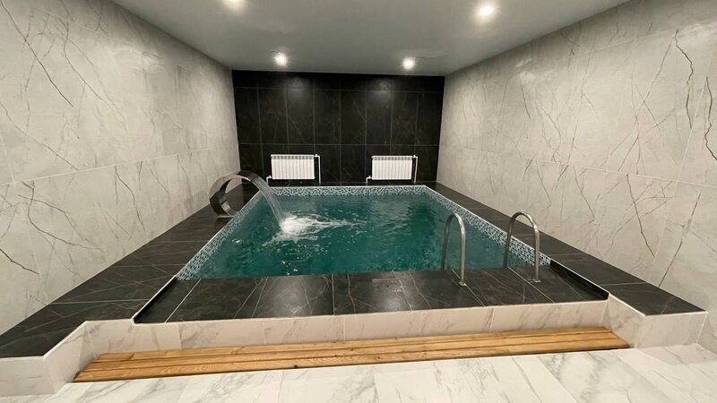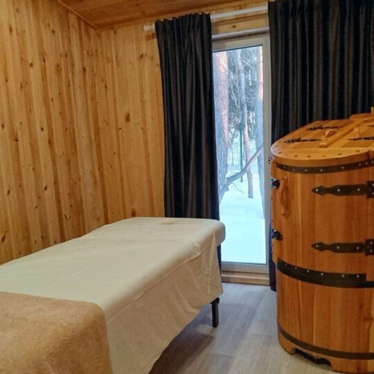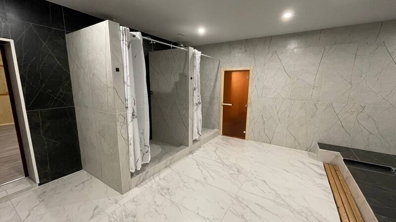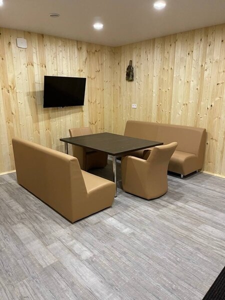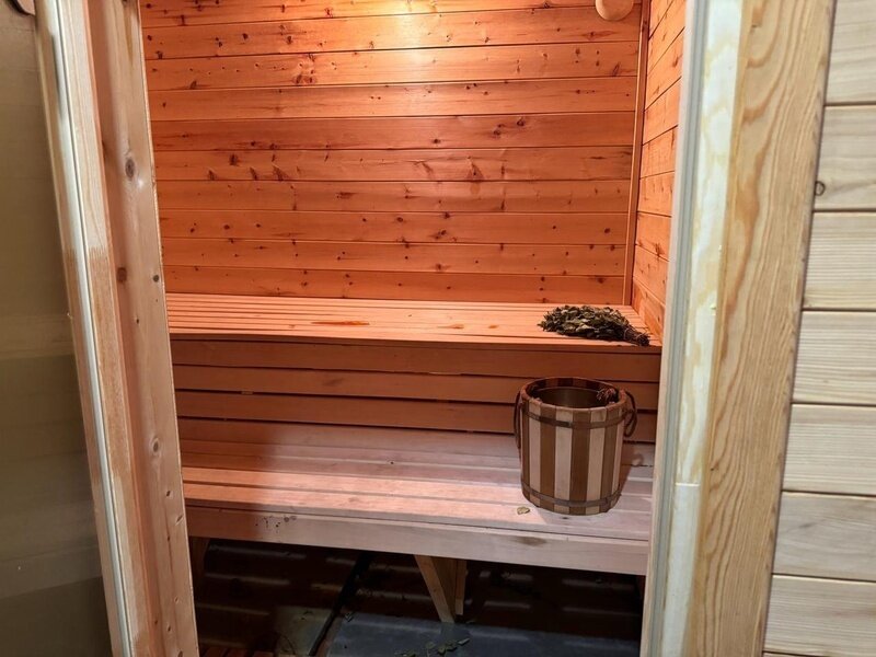 Сауна оборудована большим бассейном, душевыми с обливным устройством, просторной комнатой отдыха с мягкими диванами и столиком для приятного времяпровождения.