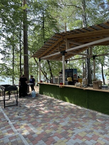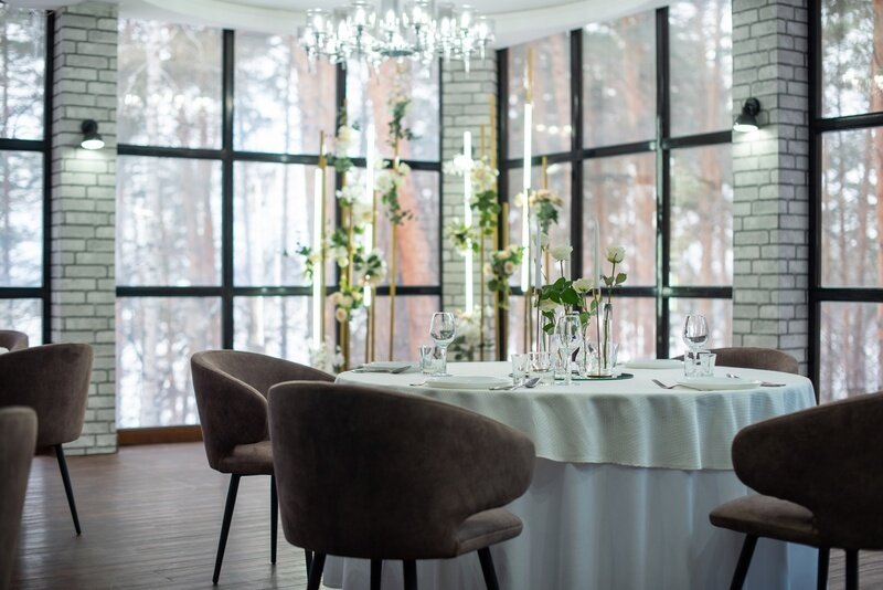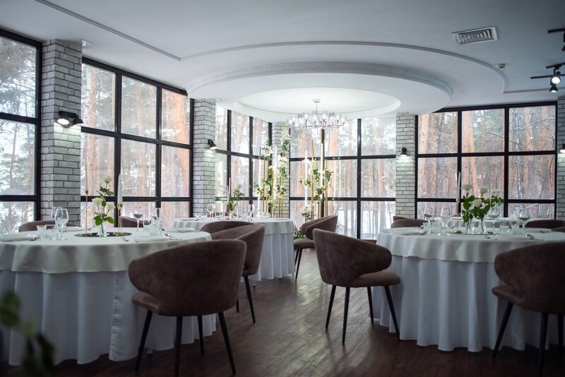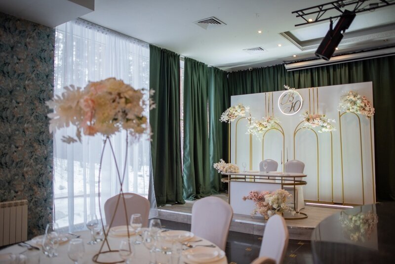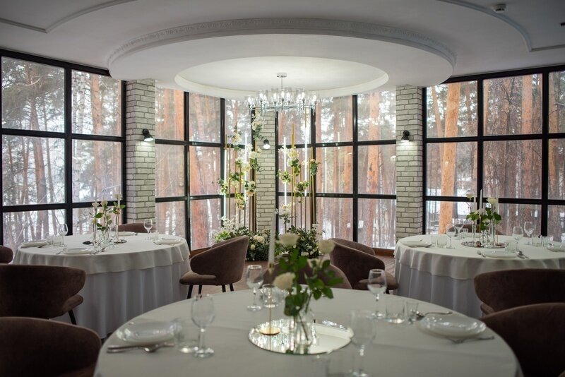 Вместимость до 80 гостей банкетной рассадки. Панорамные окна, вид на закаты озера Еловое.