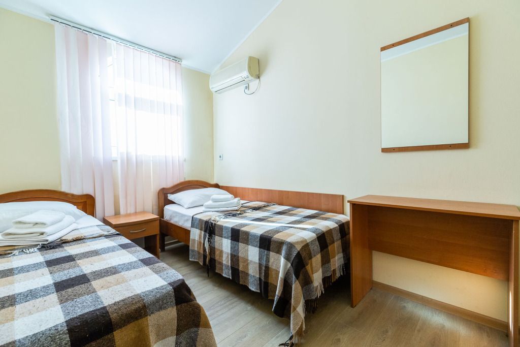 Wi-Fi, кондиционер, светильник, фен, ванна или душевая кабина, банные полотенца, тапочки, две односпальные кровати, тумбы, шкаф для одежды, вешалки, багажная тумба, зеркало, унитаз, раковина, кулер на этаже, вид во двор, стул, цифровое тв, телевизор с плоским экраном, мини-холодильник, москитная сетка, номер для некурящихВ гостиничном номере