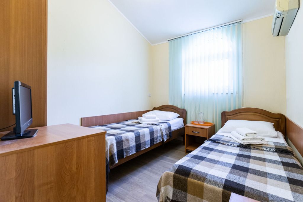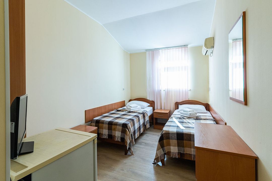 Wi-Fi, кондиционер, ванна или душевая кабина, банные полотенца, две односпальные кровати, тумбы, шкаф для одежды, вешалки, зеркало, унитаз, раковина, кулер на этаже, вид во двор, цифровое тв, телевизор с плоским экраном, мини-холодильник, номер для некурящихВ гостиничном номере