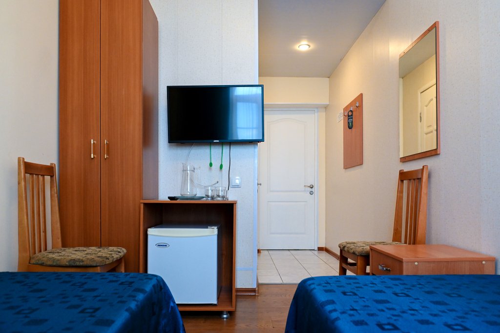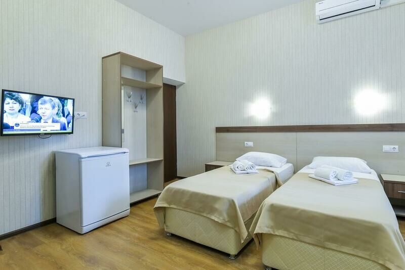 Wi-Fi, кондиционер, ванна или душевая кабина, банные полотенца, две односпальные кровати, тумбы, шкаф для одежды, вешалки, зеркало, унитаз, раковина, кулер на этаже, вид во двор, цифровое тв, телевизор с плоским экраном, мини-холодильник, номер для некурящихВ номере