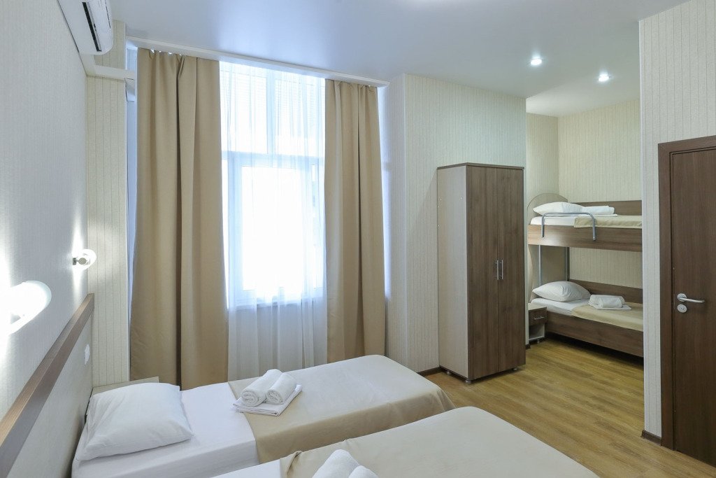 Wi-Fi, кондиционер, светильник, фен, ванна или душевая кабина, банные полотенца, тапочки, шкаф для одежды, вешалки, багажная тумба, зеркало, унитаз, раковина, вид на город, кулер на этаже, три односпальные кровати, вид во двор, цифровое тв, телевизор с плоским экраном, мини-холодильник, москитная сетка, номер для некурящихВ номере