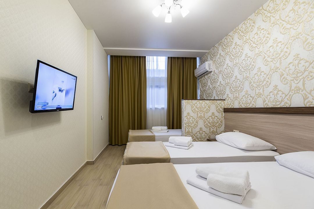 Wi-Fi, кондиционер, светильник, фен, ванна или душевая кабина, банные полотенца, тапочки, шкаф для одежды, вешалки, багажная тумба, зеркало, унитаз, раковина, вид на город, кулер на этаже, три односпальные кровати, вид во двор, цифровое тв, телевизор с плоским экраном, мини-холодильник, москитная сетка, номер для некурящихВ гостиничном номере