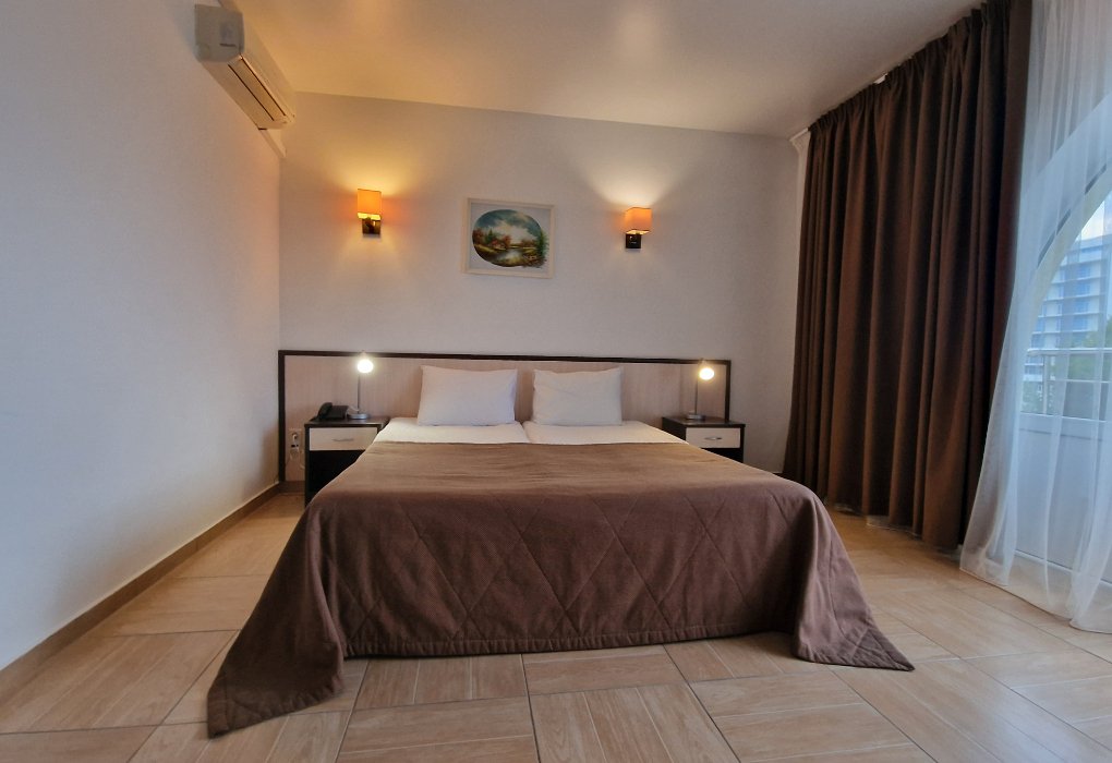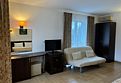 Территория этого пансионата круглосуточно охраняется и находится под видеонаблюдением. Для доступа в номер нужна электронная карта-ключ. Оформление всех номеров классическое. В них есть сейфы, беспроводной интернет, ванная с душем, холодильник, кондиционер. На этажах предусмотрены кулеры с горячей и холодной водой.