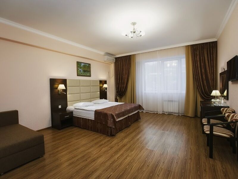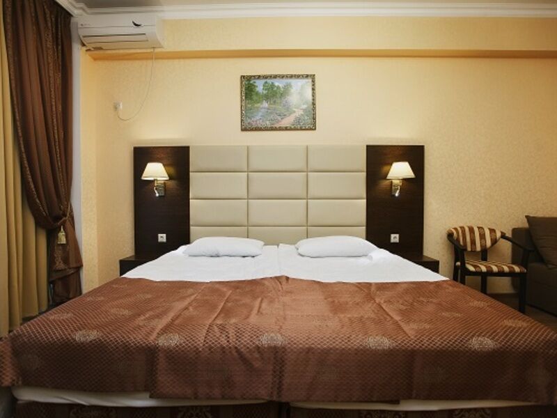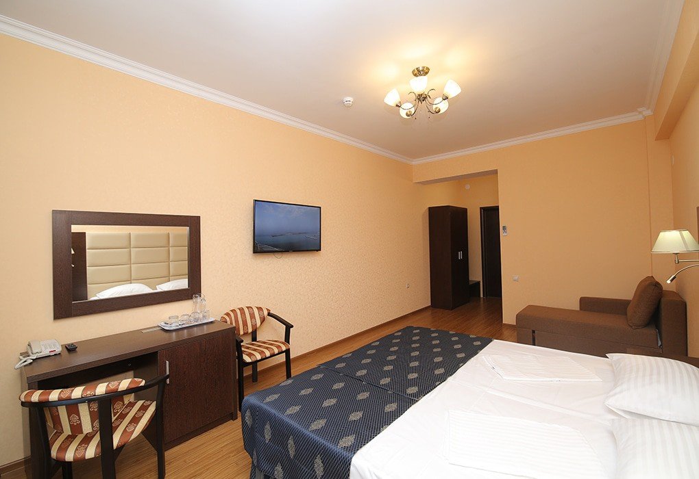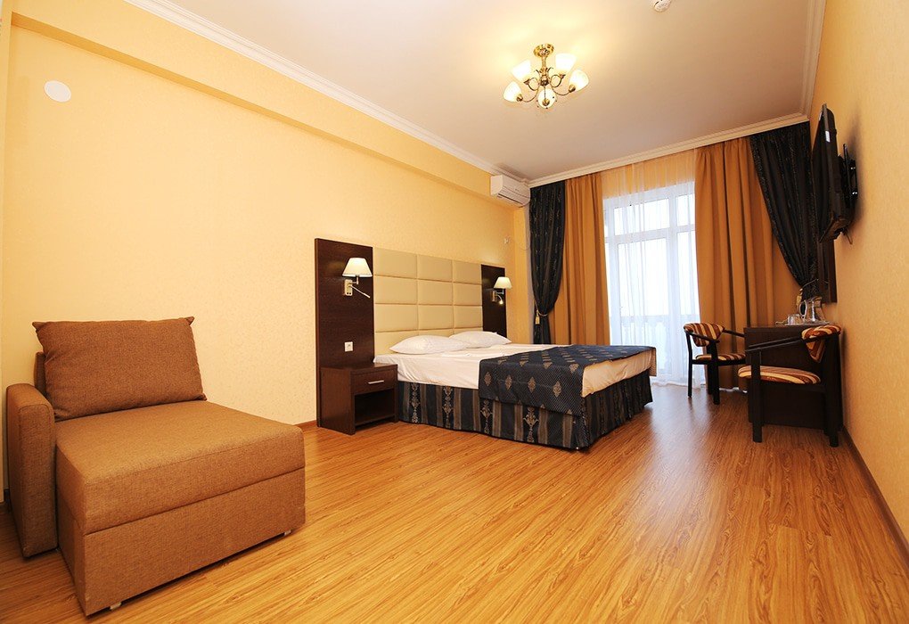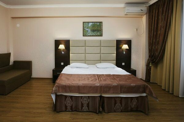 Пансионат имеет собственную парковку, здание отеля располагает солидным номерным фондом. Все номера оборудованы удобной мебелью и необходимой техникой, создающей максимальное удобство. На этажах есть меблированные террасы с прекрасным панорамным видом на округу.