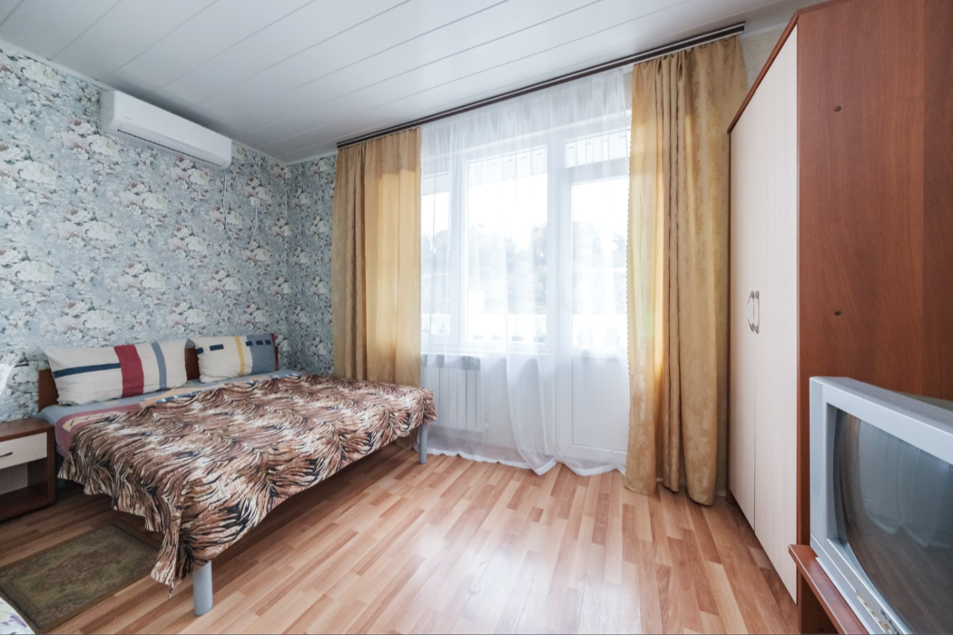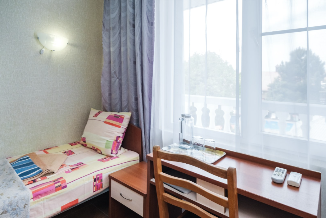 Уютный однокомнатный номер с балконом со всем необходимым для комфортного проживания 2-х человек. Все номера данной категории находятся на 1 этаже, на солнечной стороне. В номере допускается дополнительное спальное место — евро раскладушка. Проживание детей от 0 до 12 лет (включительно) на дополнительном спальном месте возможно при его наличии и по действующим тарифам. Проживание с животными возможно только по согласованию с администрацией пансионата.