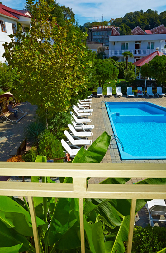 Территория пансионата небольшая,но очень зеленая.Много цветов.Красиво.Возле бассейна лежаки и столики.Негромко играет музыка.Ровно в 22.00 её выключают.