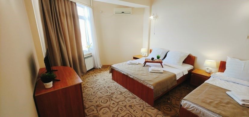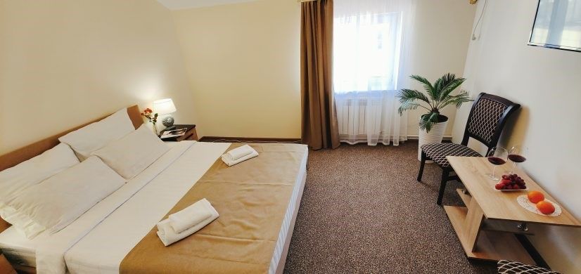 Номер оснащен: большая двуспальная кровать или две односпальные кровати, прикроватные тумбочки, журнальный столик, шкаф, зеркало, вешалка, ТВ, мини-холодильник, сплит-система.