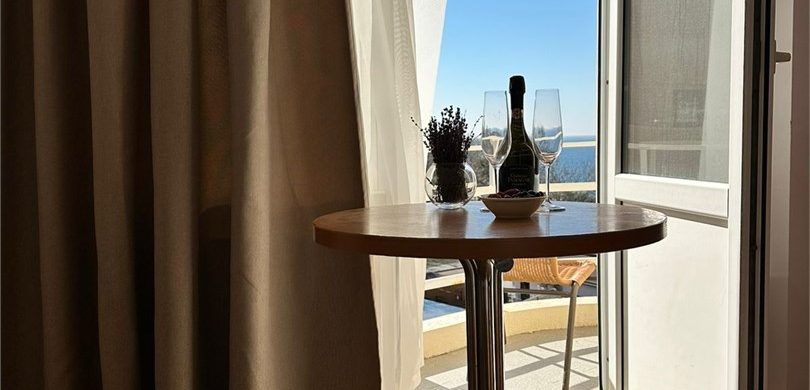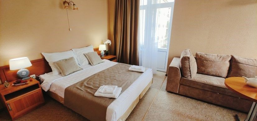 Номер оснащен: большая двуспальная кровать или две односпальные кровати, прикроватные тумбочки, журнальный столик, шкаф, зеркало, вешалка, ТВ, мини-холодильник, сплит-система. В номере имеется небольшой балкончик, с которого видно море.