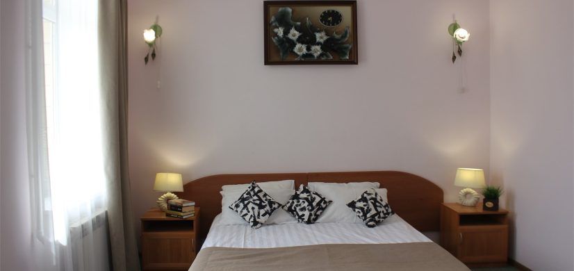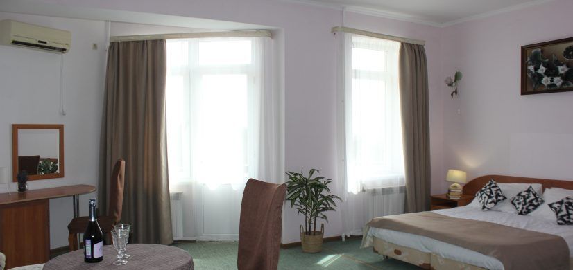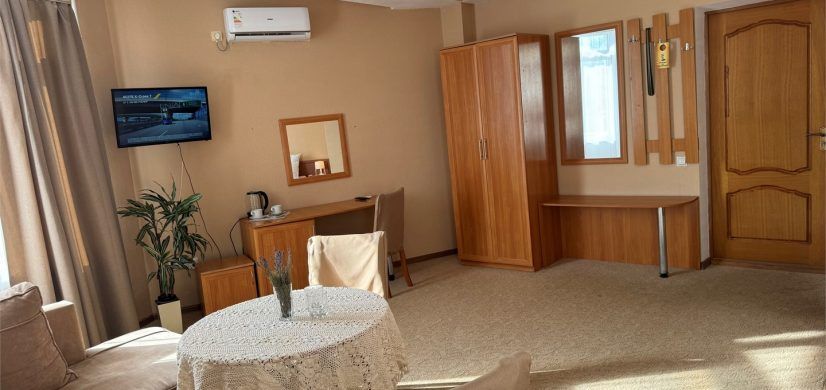 Номер оснащен: большая двуспальная кровать, прикроватные тумбочки, журнальный столик, шкаф, зеркало, вешалка, ТВ, мини-холодильник, сплит-система