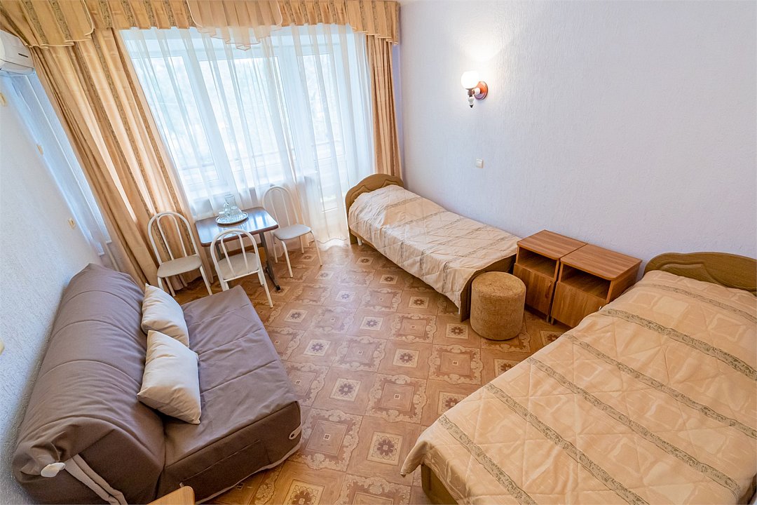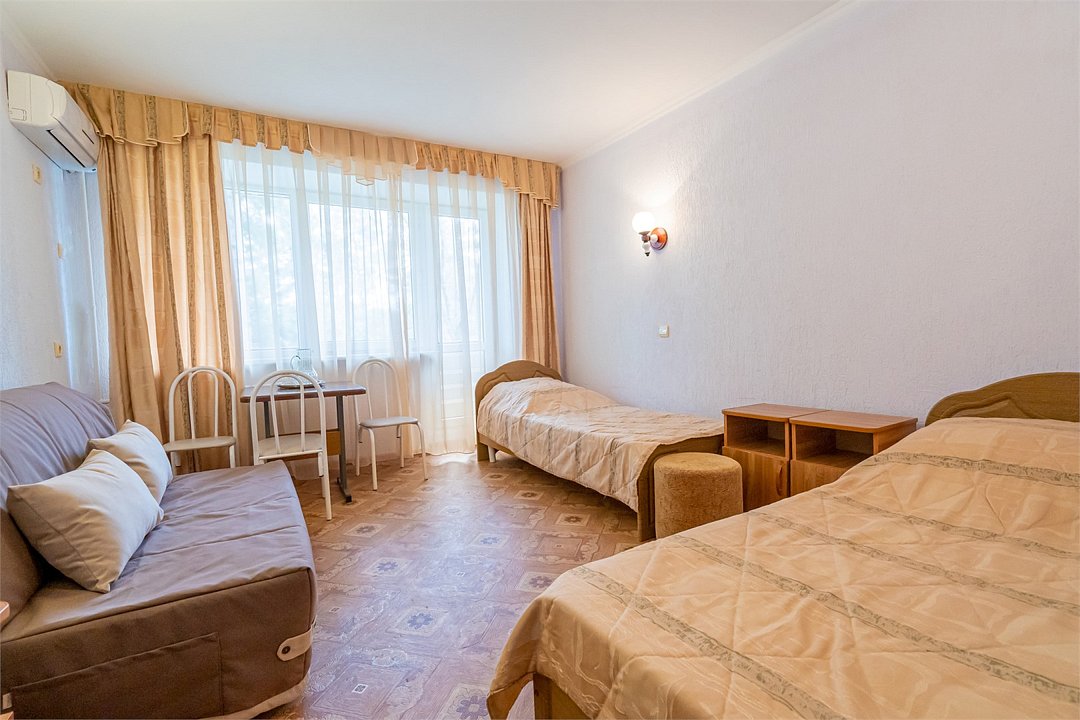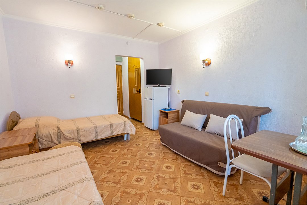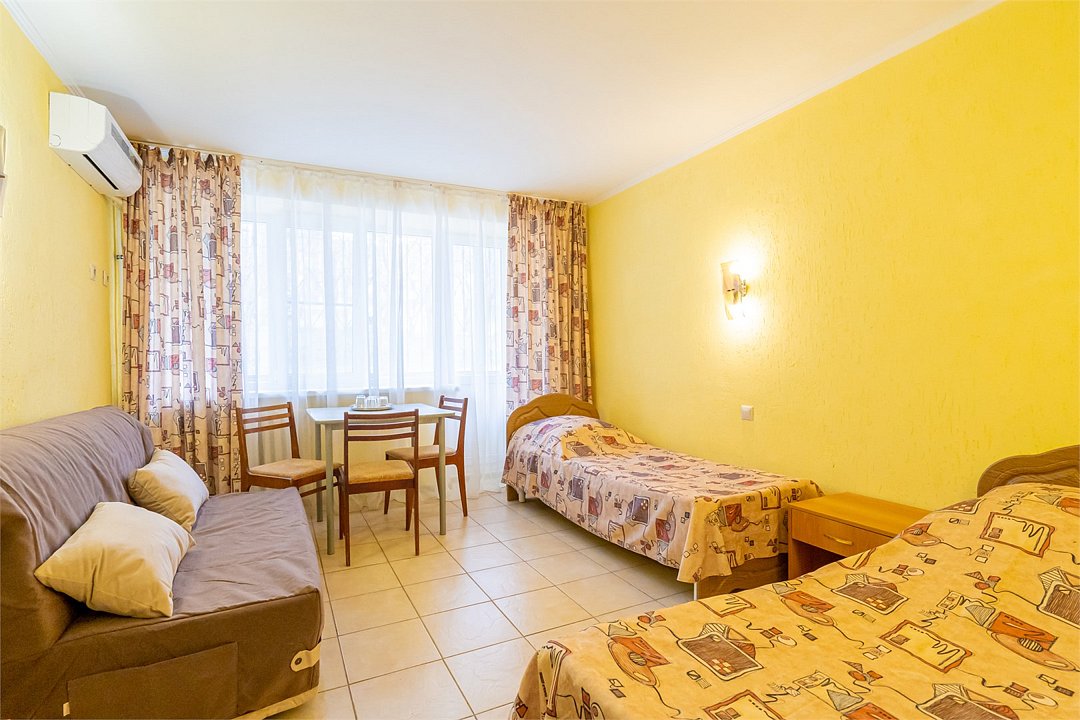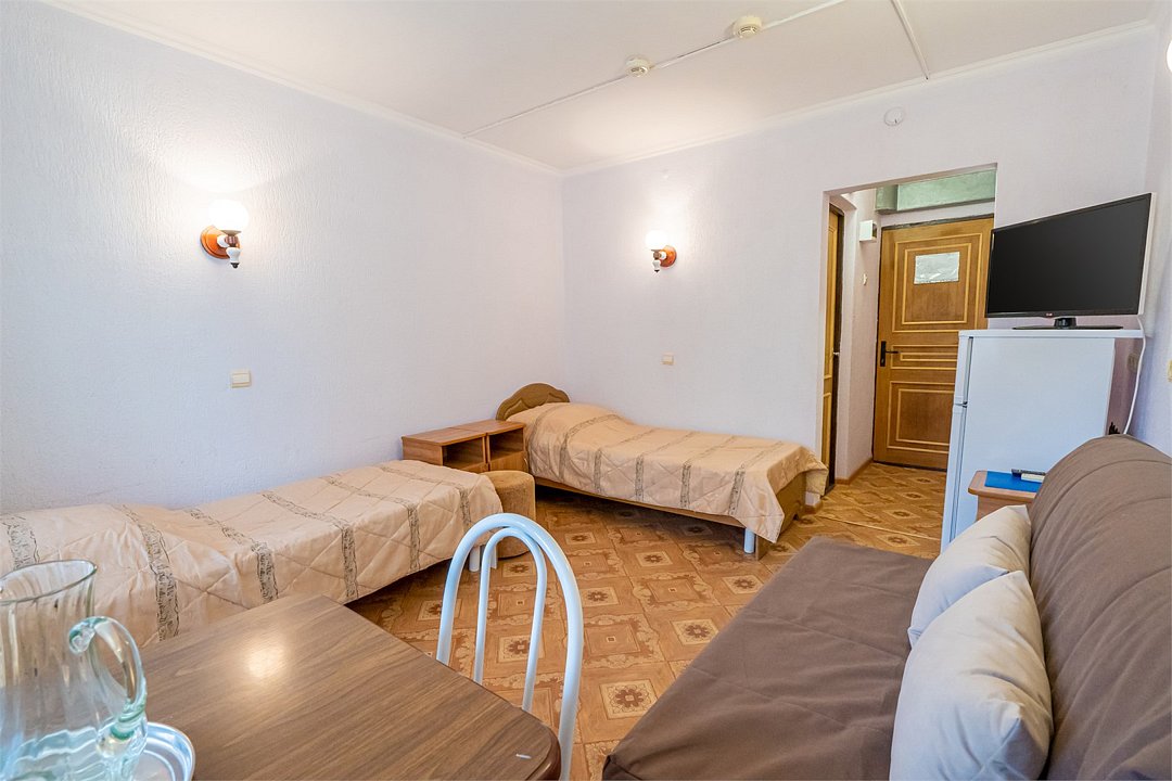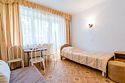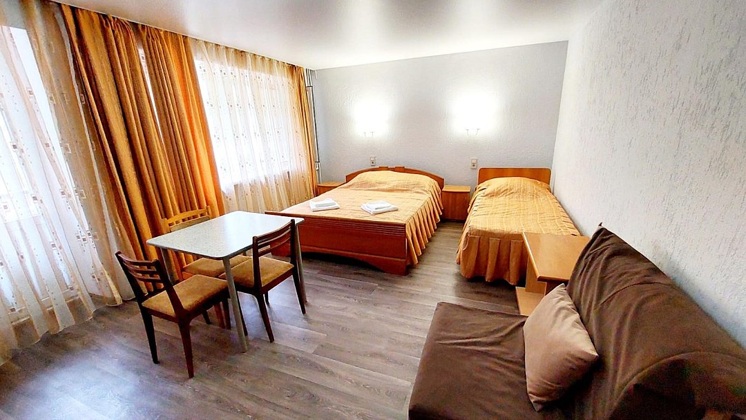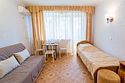 Однокомнатный номер с двумя раздельными кроватями и раскладным диваном (размер спального места 140*195), площадь номера 14 кв.м. В каждом номере лоджия, с которой открывается красивый вид.Услуги и удобства