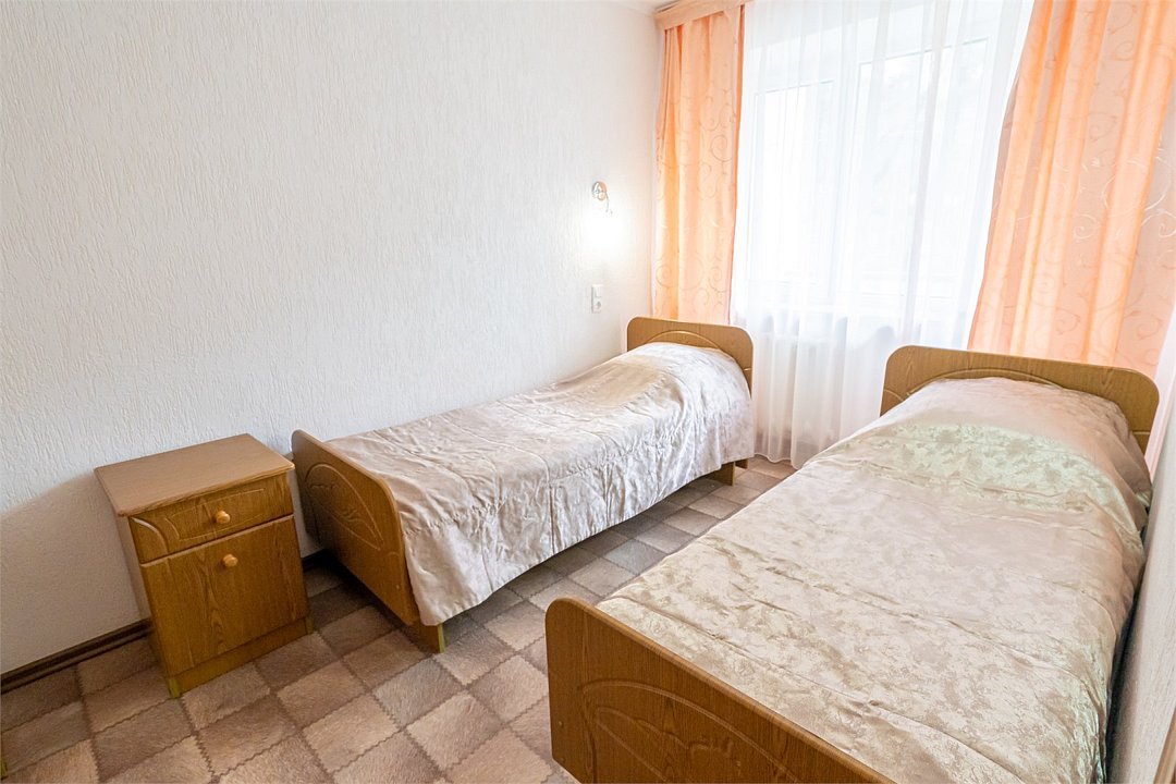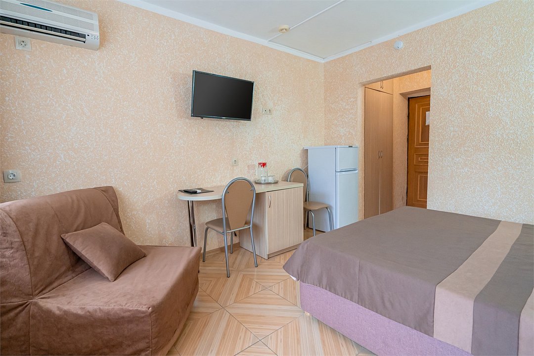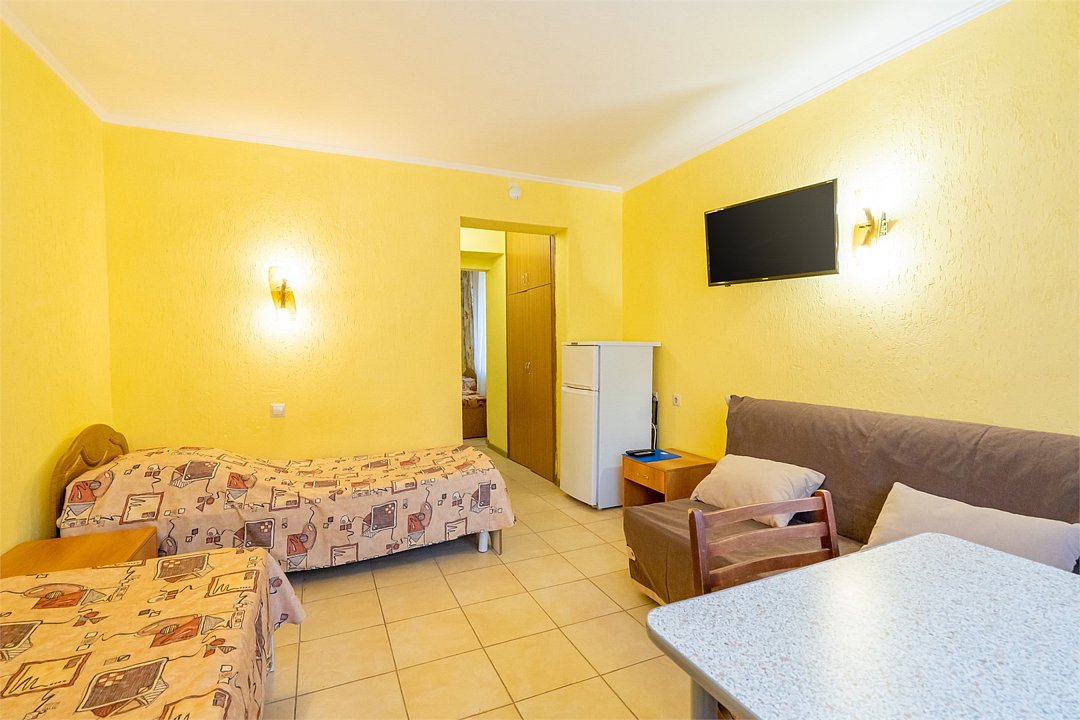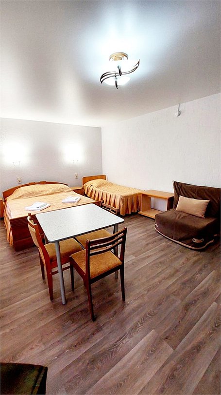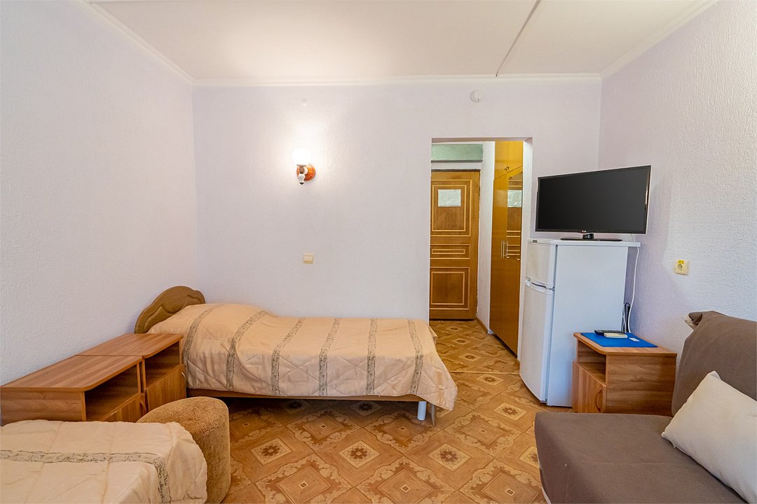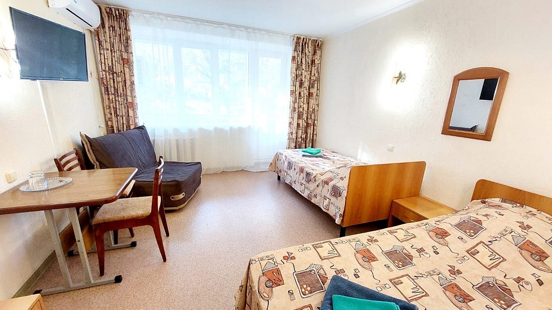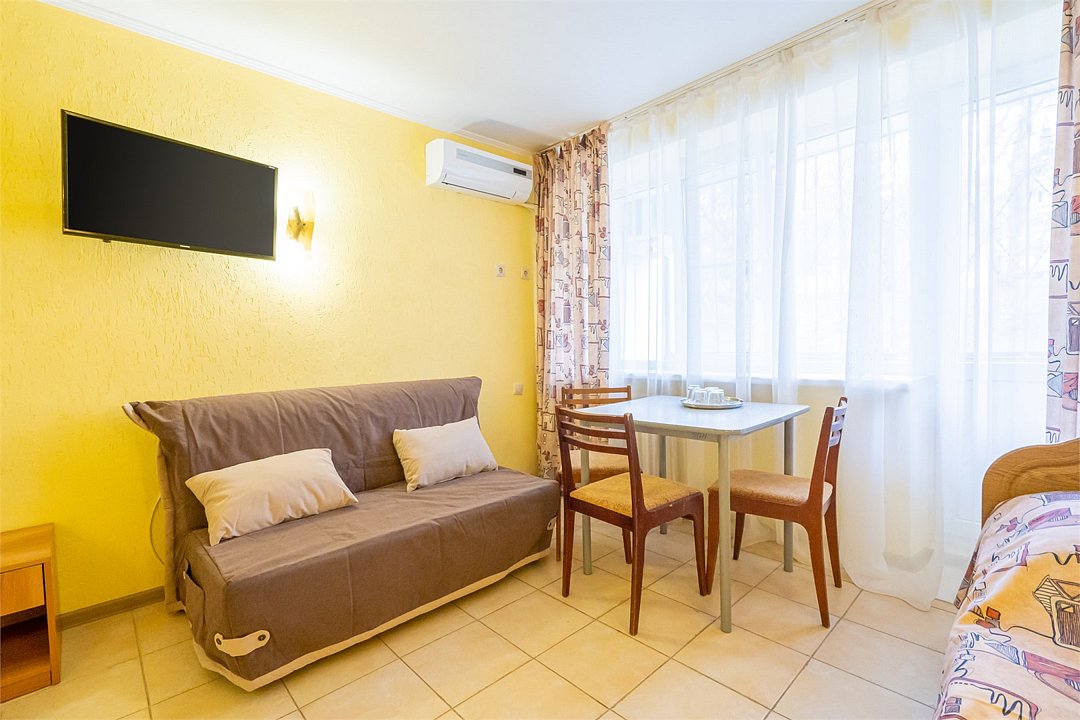 Однокомнатный номер с двумя раздельными кроватями и раскладным диваном (размер спального места 140*195), площадь номера 14 кв.м. В каждом номере лоджия, с которой открывается красивый вид.Услуги и удобства