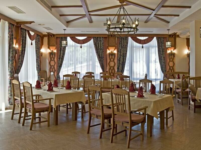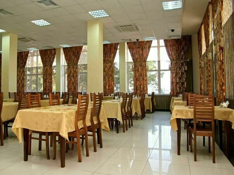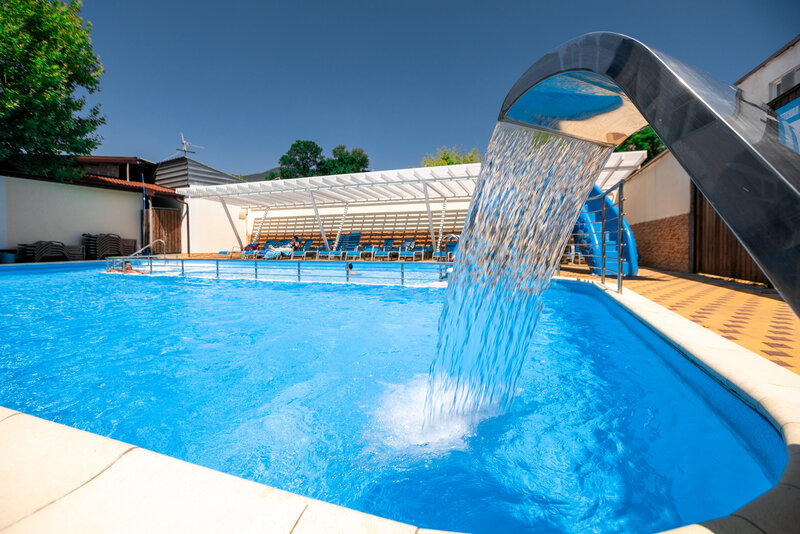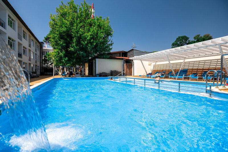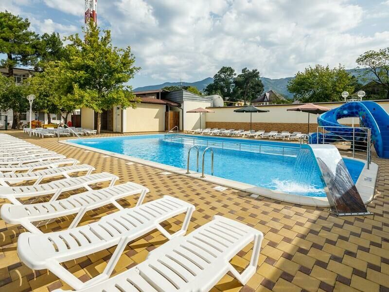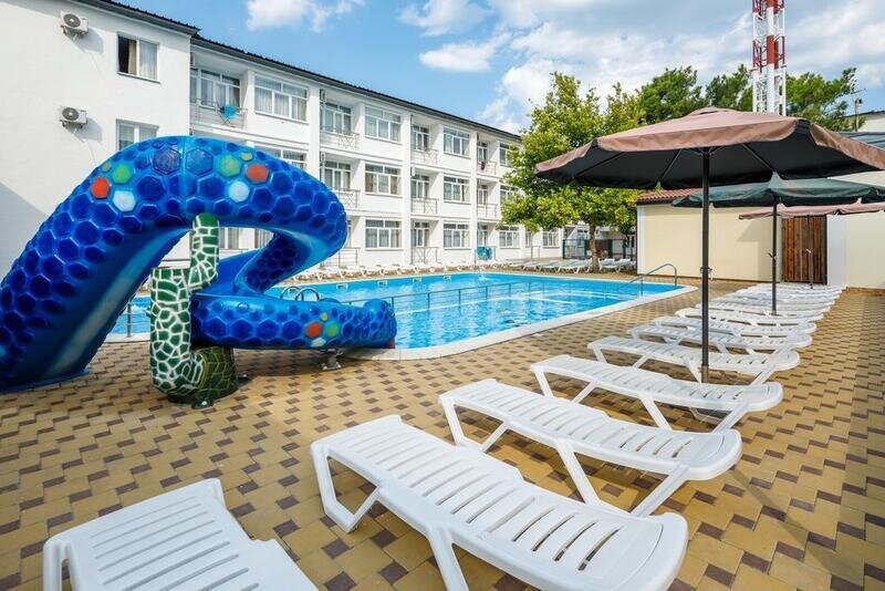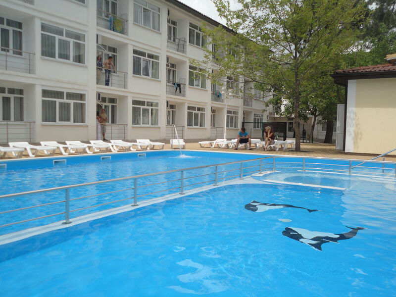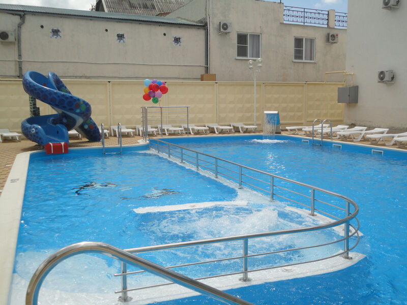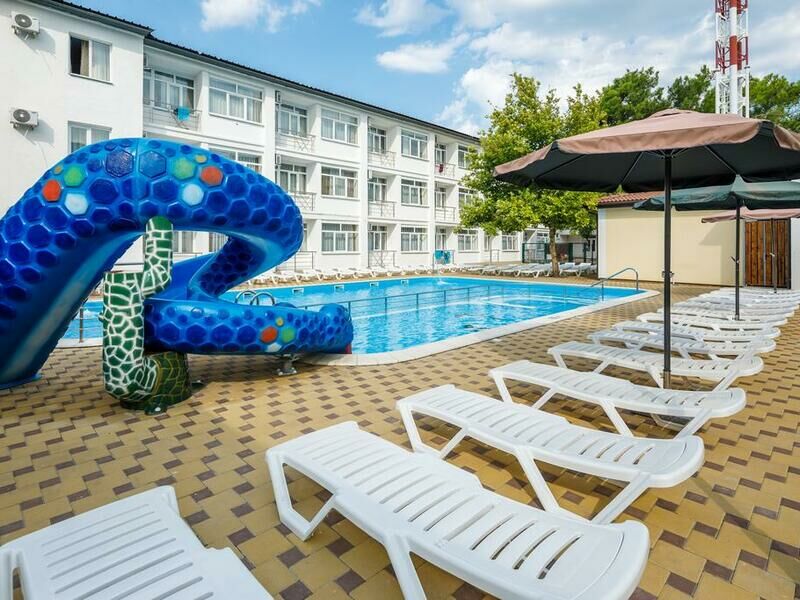 Тип бассейна: открытый бассейнРядом с бассейном: шезлонги, зонтикиТемпература в бассейне: 24 °CРазмеры: 9 x 15 мПлощадь: 135 м²Глубина: 140 смБассейн разделен на две зоны: плавательная зона и детская зона. Зона у бассейна выложена противоскользящей плиткой, по которой удобно ходить даже босиком. Здесь же можно позагорать на лежаке. Лежаков у бассейна хватает на всех постояльцев пансионата. Для тех, кто предпочитает избегать солнечные ванны, есть лежаки в теньке.