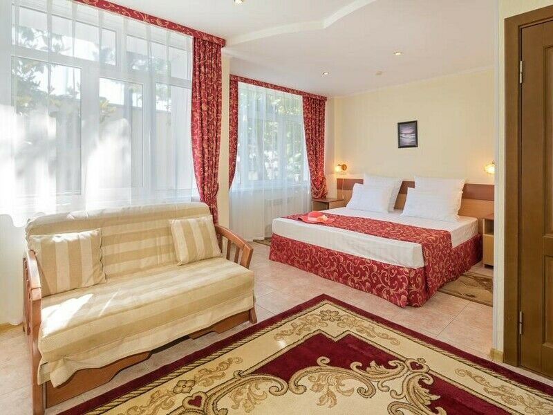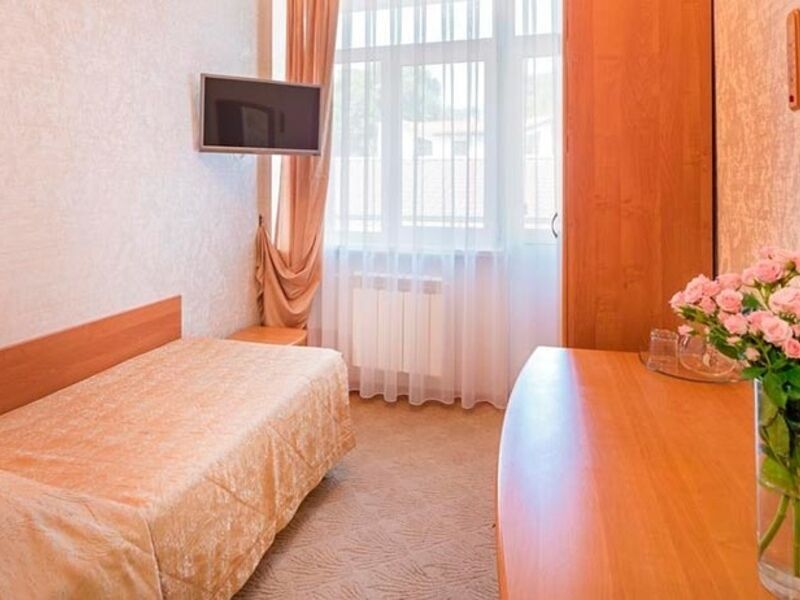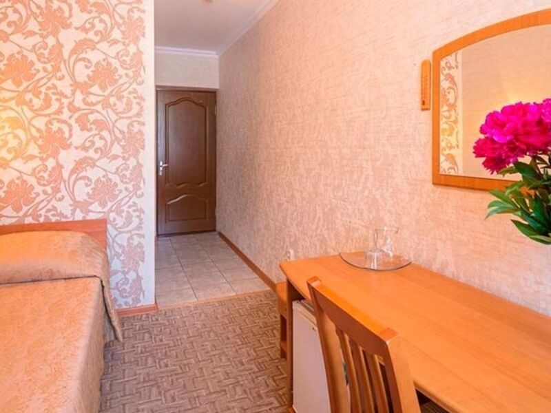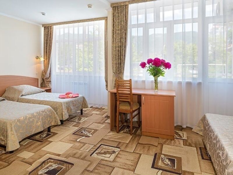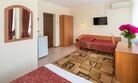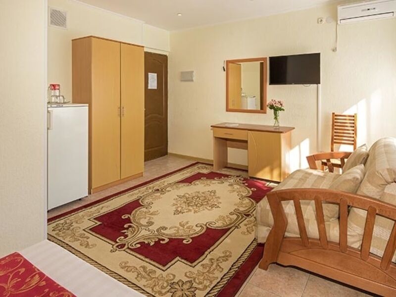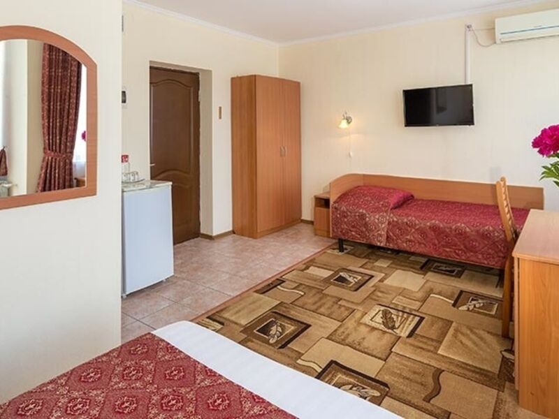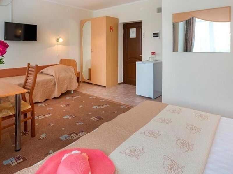 Плюсы: понравилось все!!! В номере большие кровати, удобные матрасы и подушки, чистое белое белье, холодильник, сейф, кондиционер, большой телевизор, телефон для связи с администратором, на этаже гладильная доска и утюг. Убирали каждый день, всегда было чисто. На первом этаже кулер с водой (холодной и горячей), столовая. Кормили по системе "шведский стол". У нас был полный пансион. Меню достаточно разнообразное, все фантастически вкусное. Во дворе хороший бассейн, за которым всегда следит сотрудник. Можно было даже оставить детей ненадолго. Пансион находится в самом центре набережной. Все самое интересное тут! И при этом в самом пансионе тихо и спокойно. Персонал отличный!