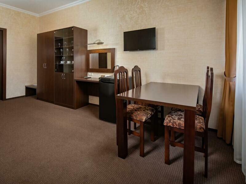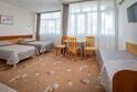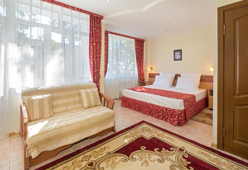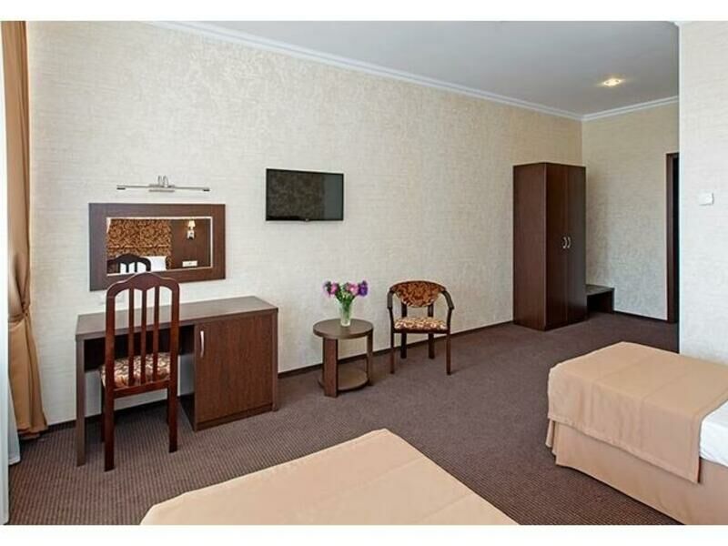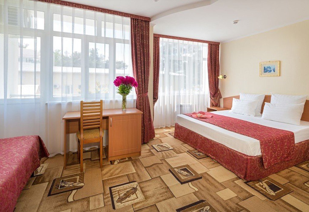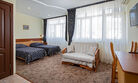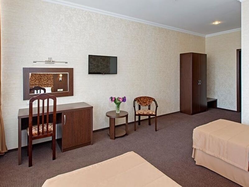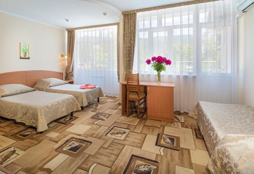 Плюсы: понравилось все!!! В номере большие кровати, удобные матрасы и подушки, чистое белое белье, холодильник, сейф, кондиционер, большой телевизор, телефон для связи с администратором, на этаже гладильная доска и утюг. Убирали каждый день, всегда было чисто. На первом этаже кулер с водой (холодной и горячей), столовая. Кормили по системе "шведский стол". У нас был полный пансион. Меню достаточно разнообразное, все фантастически вкусное. Во дворе хороший бассейн, за которым всегда следит сотрудник. Можно было даже оставить детей ненадолго. Пансион находится в самом центре набережной. Все самое интересное тут! И при этом в самом пансионе тихо и спокойно. Персонал отличный!