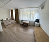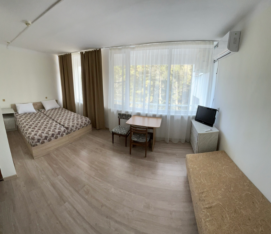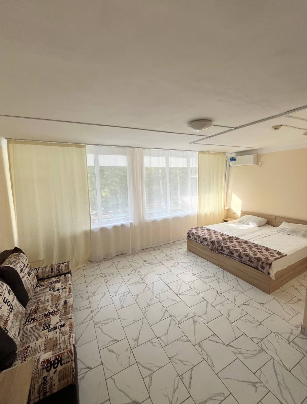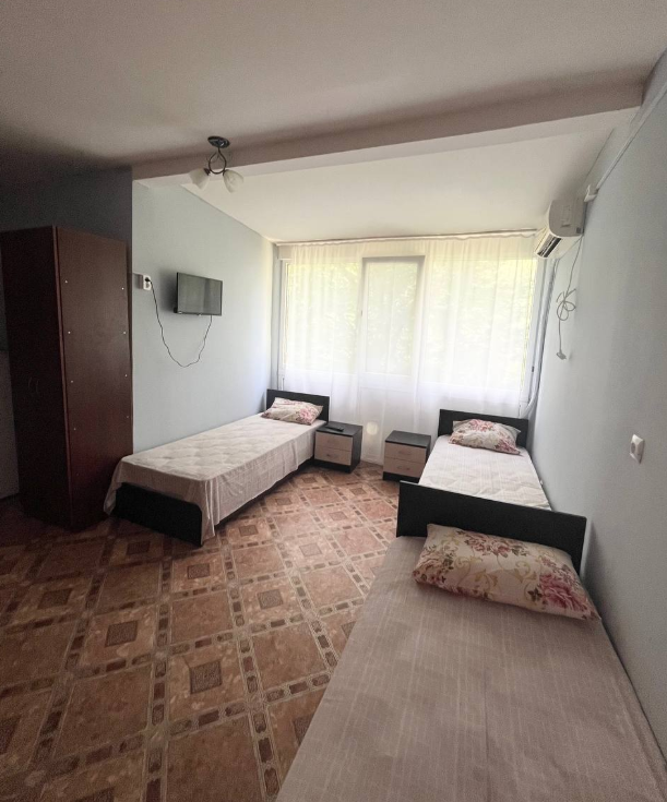 Номер оборудован 2 односпальными кроватями + диван, 2 тумбочки, шифоньер, стол, стулья, зеркало. Удобства в номере: душ, туалет, умывальник, холодильник, телевизор, кондиционер, балкон.