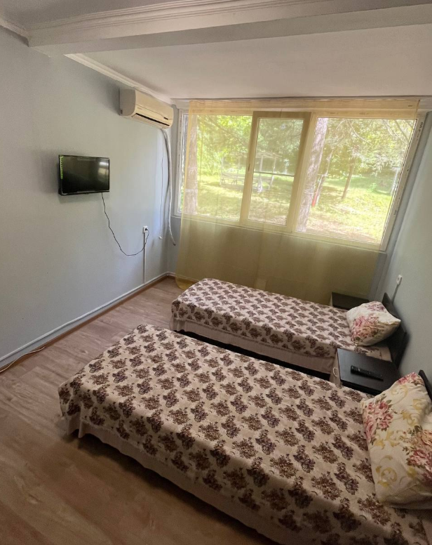Номер оборудован 2 односпальными кроватями, 2 тумбочки, шифоньер, стол, табуреты. Удобства в номере: туалет, умывальник, душ, кондиционер, холодильник, телевизор.