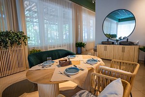 - гостиная с эксклюзивной, дизайнерской мебелью и полным набором посуды на компанию до 9-ти гостей;