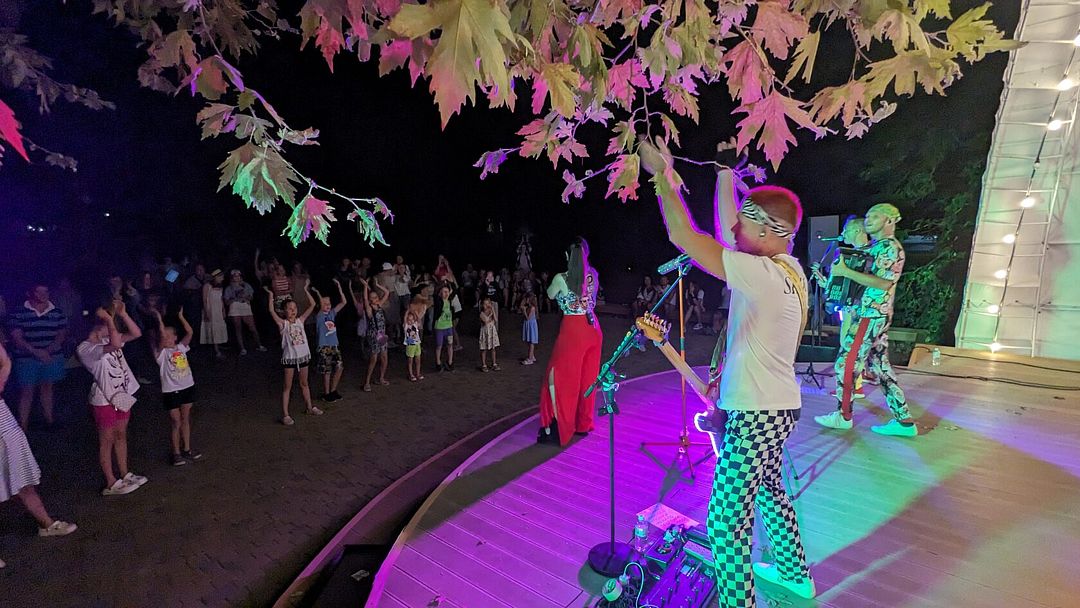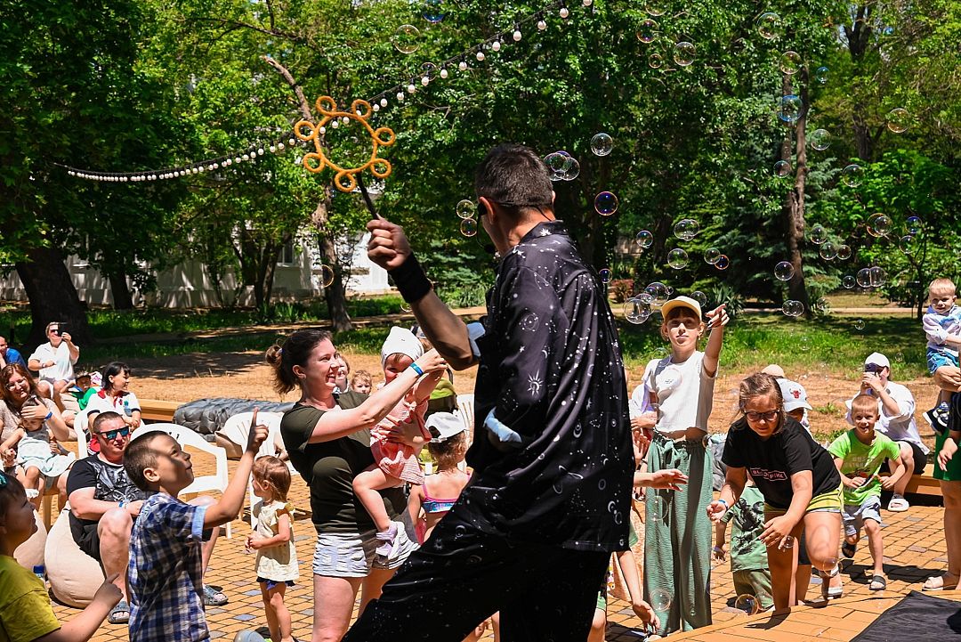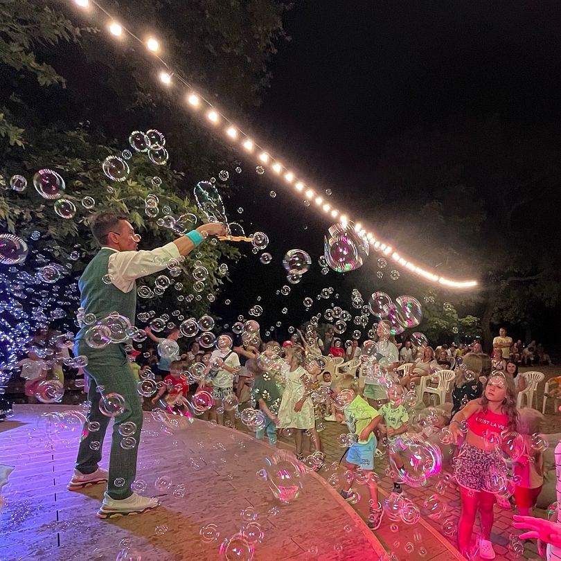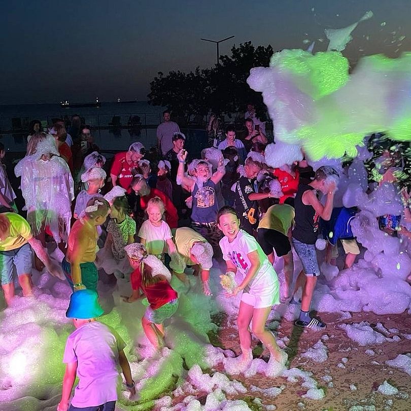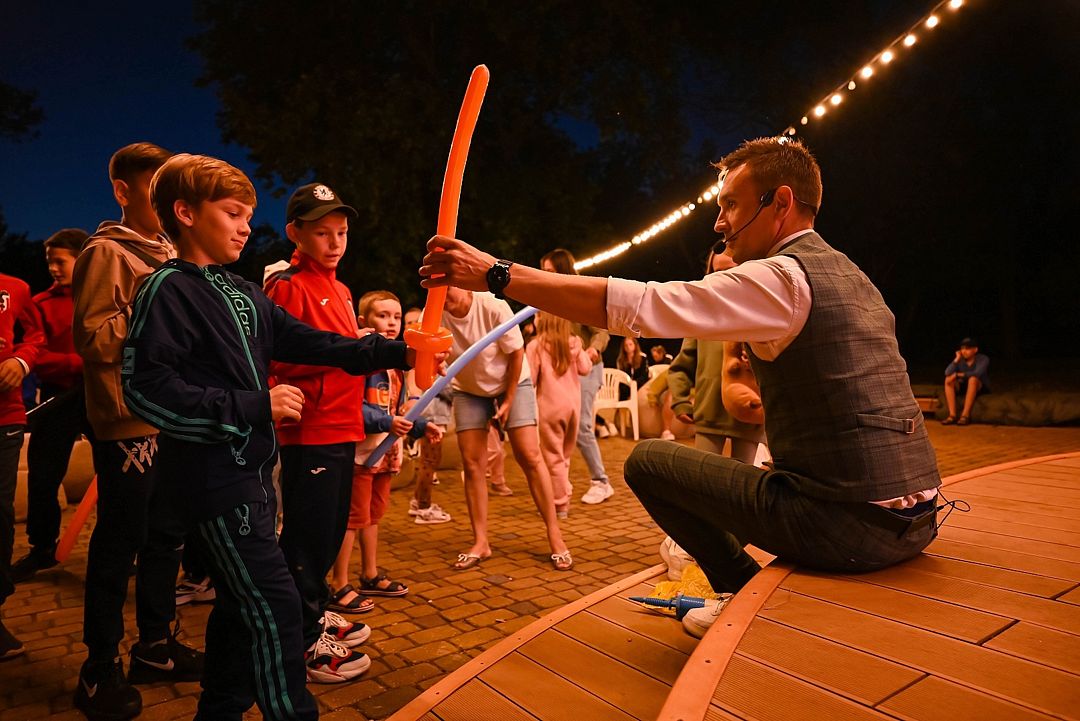 Детей ждёт специальная детская анимация, где юные гости смогут поучаствовать в разнообразных квестах, спортивных мероприятиях, творческих мастер-классах. А по вечерам мы смотрим кино под открытым небом и проводим шоу талантов!