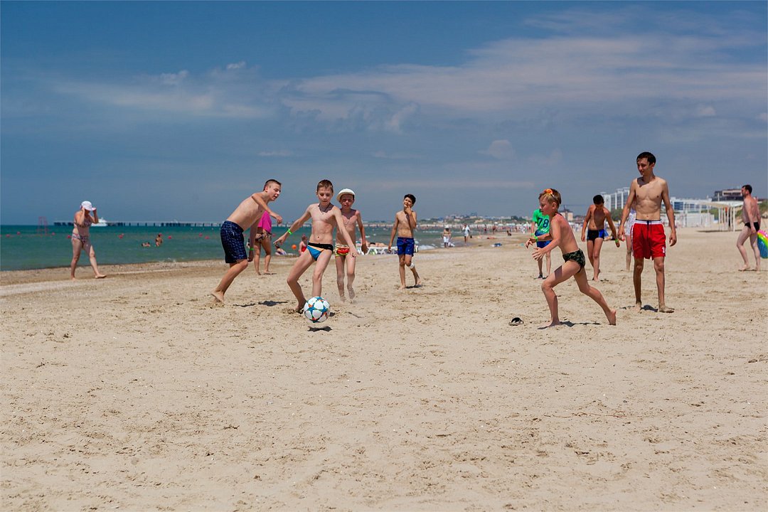 Пляж у пансионата свой. Находится он рядом с корпусами. На нем есть клуб спасателей, раздевалка, удобные лежаки, площадка для игры в пляжный волейбол.