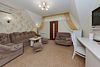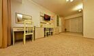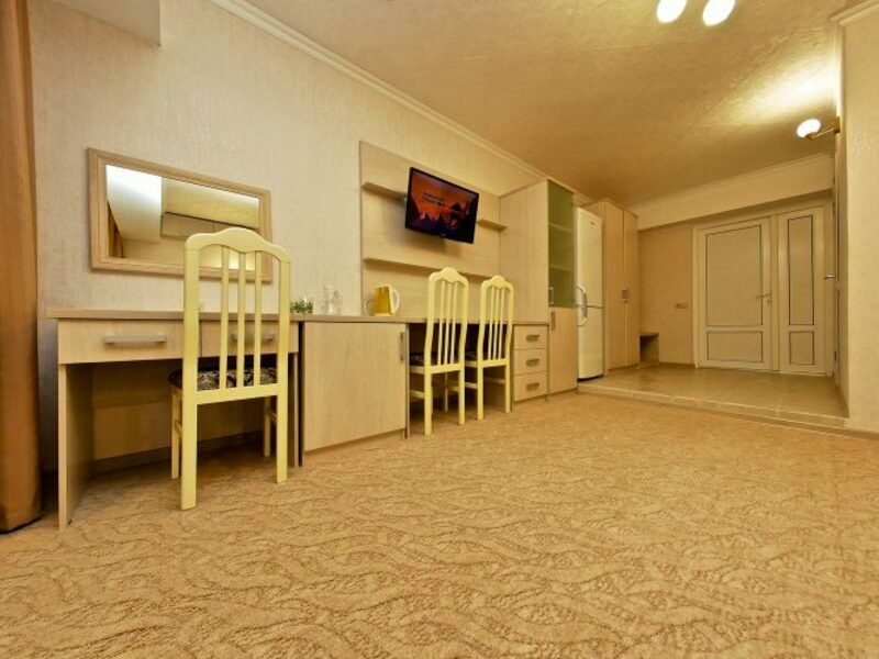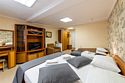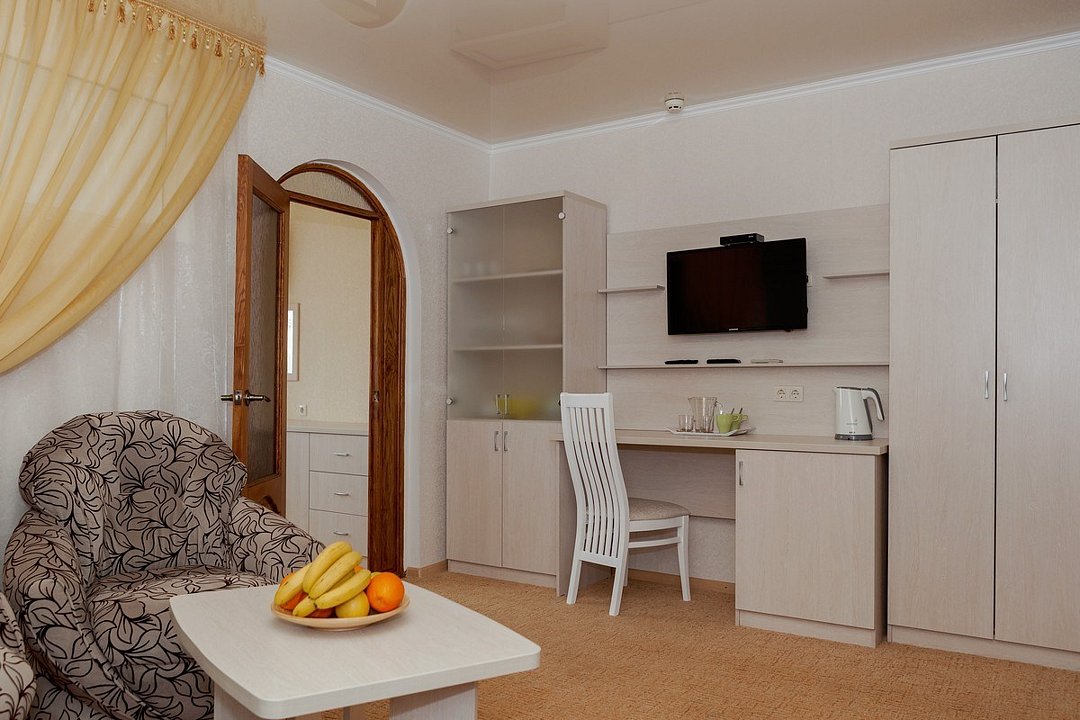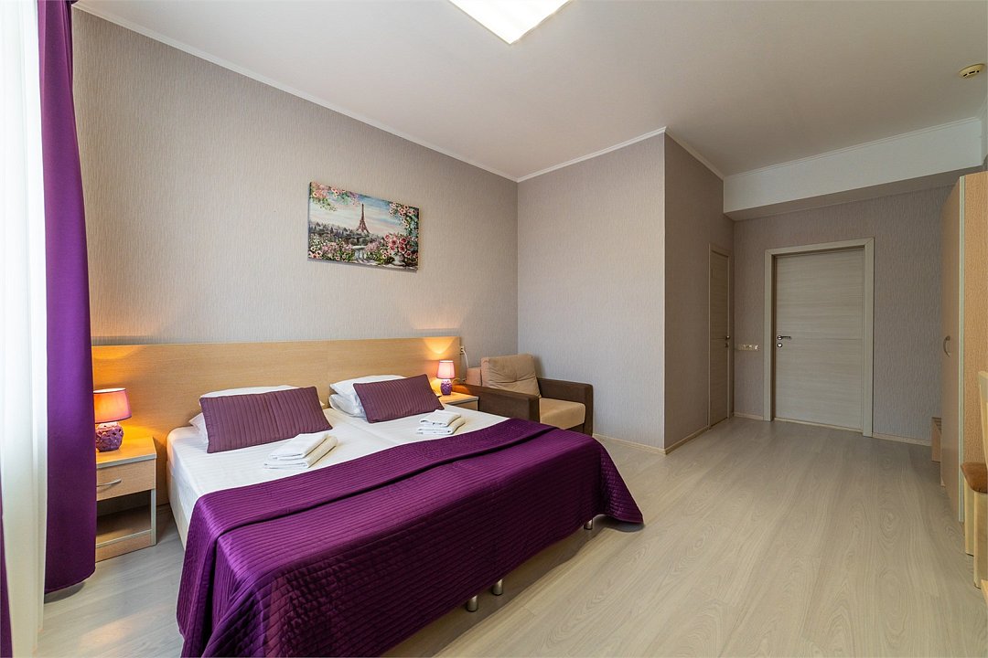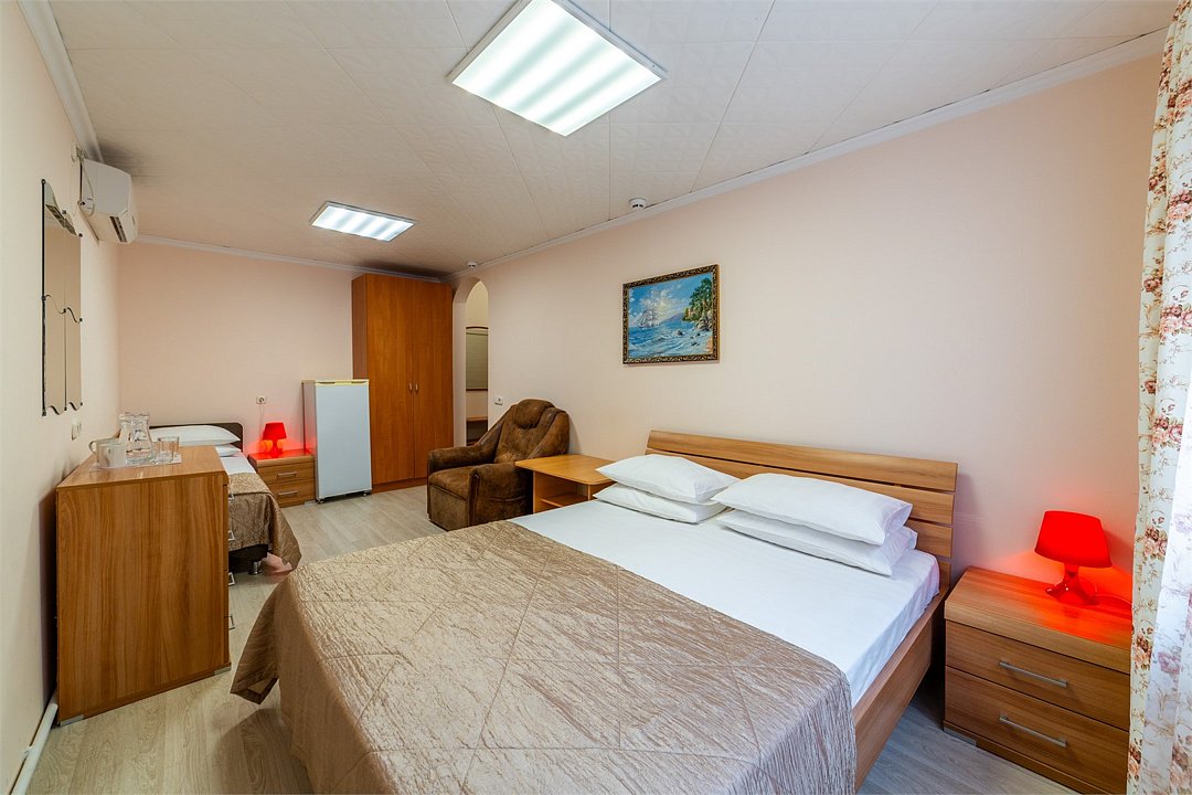Комфортный двухкомнатный семейный номер с балконом с возможностью размещения до 5 человек. Расположен номер в 4 корпусе на 2,3,4 этажах (имеется лифт). Оптимально для отдыха большой семьей с размещением гостей на дополнительном месте. Спальная комната: двуспальная кровать, сплит-система, телевизор. Гостиная комната: раскладной диван (для 2-х человек), кресло-кровать, сплит-система, холодильник, спутниковое телевидение, набор посуды, телефон, сейф. Санузел: душевая кабина, косметические принадлежности, фен, халаты, тапочки.Услуги и удобства