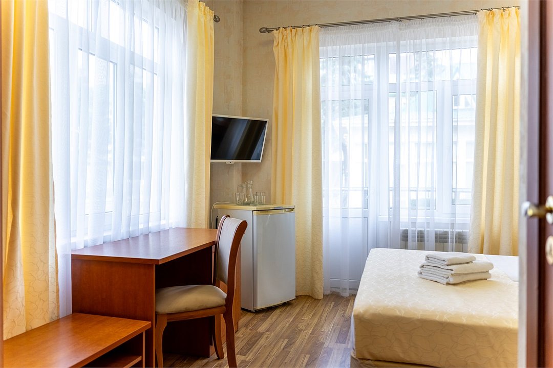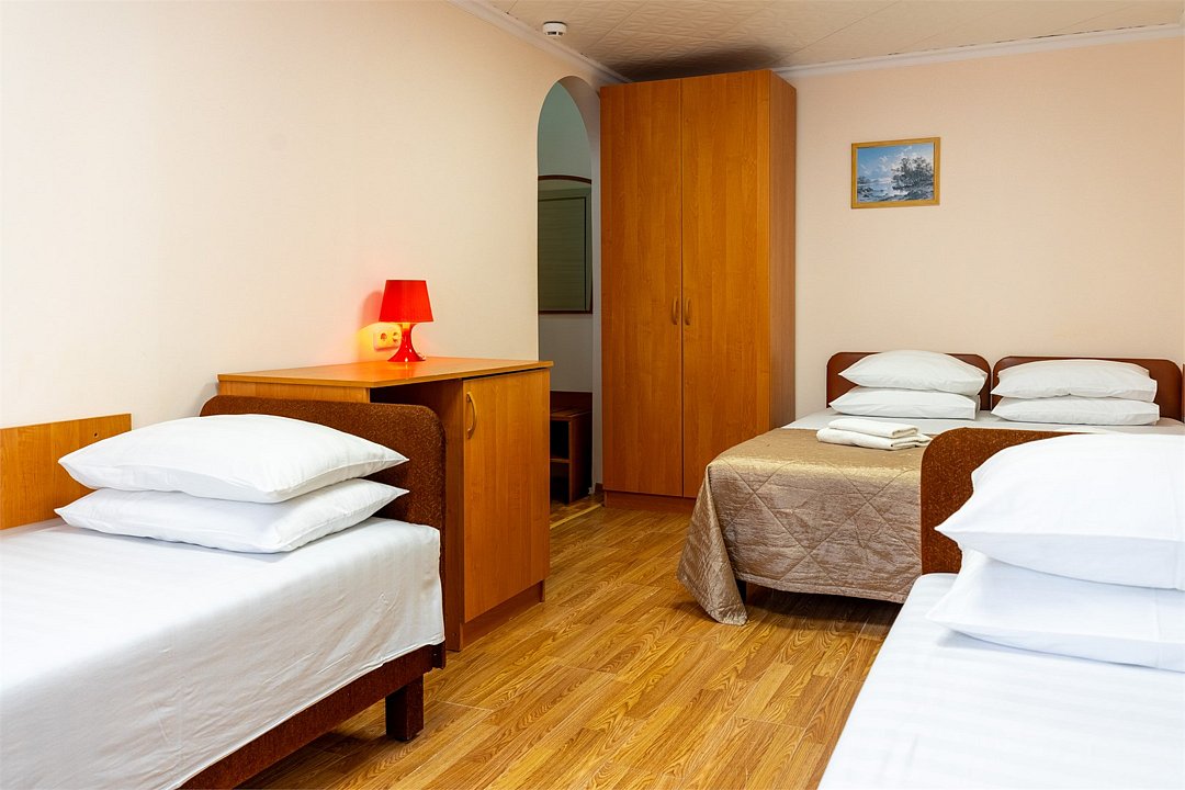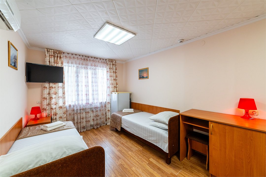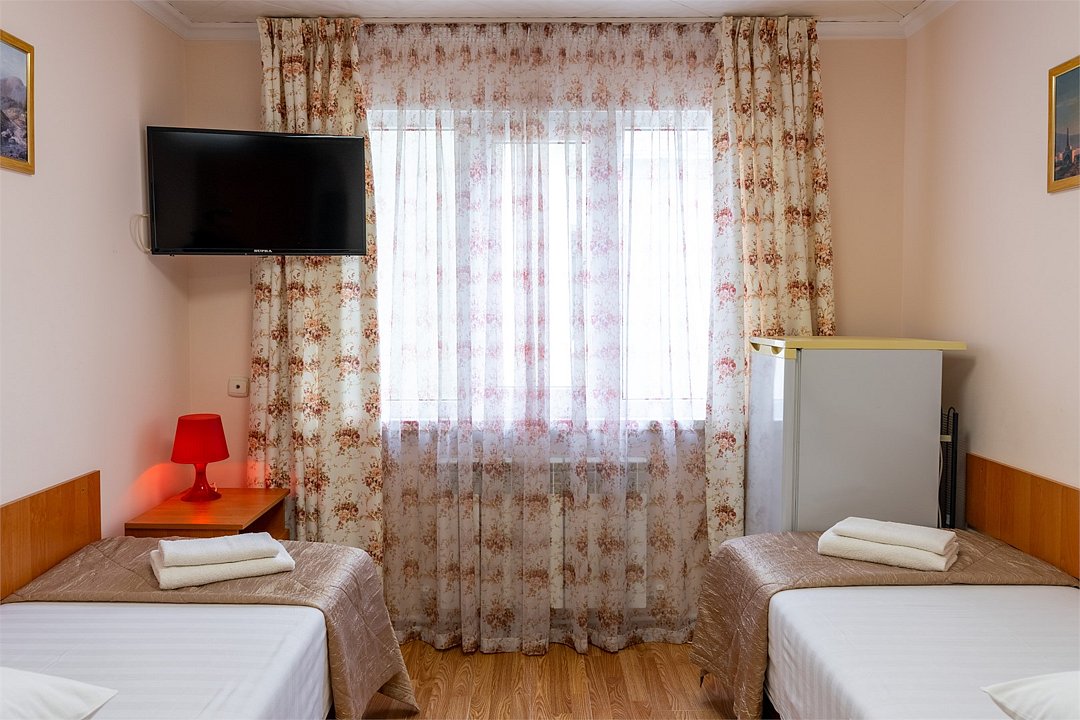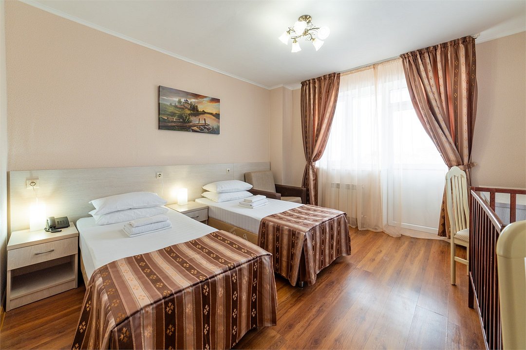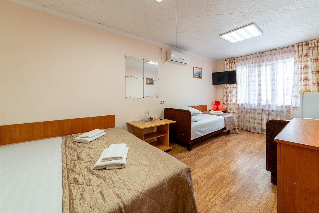 Комфортный однокомнатный стандартный номер без балкона с возможностью размещения до 3-4 человек. Расположены номера в 4 корпусе на цокольном этаже (есть отдельный вход), на мансардном этаже (5 этаж, имеется лифт). Оптимально для отдыха семьи с размещением 1 гостя на кресло-кровати и 4-е дополнительное место на еврораскладушке или детской кроватки. Комплектация номера: две односпальные кровати, кресло-кровать, детская кроватка, сплит-система, холодильник, телевизор, телефон. Санузел: душевая кабина, косметические принадлежности, фен.Услуги и удобства