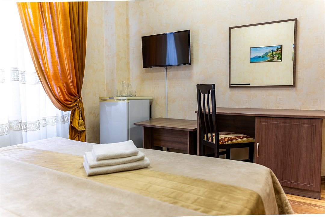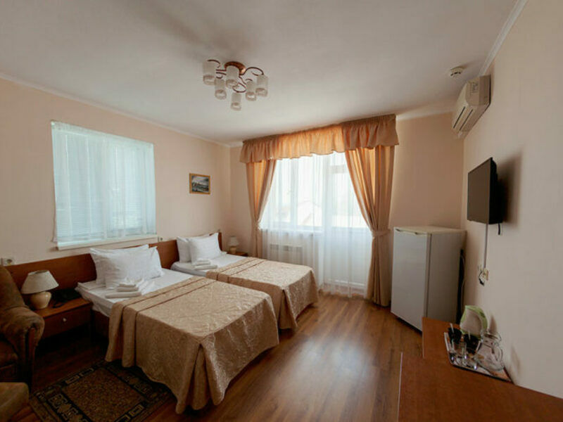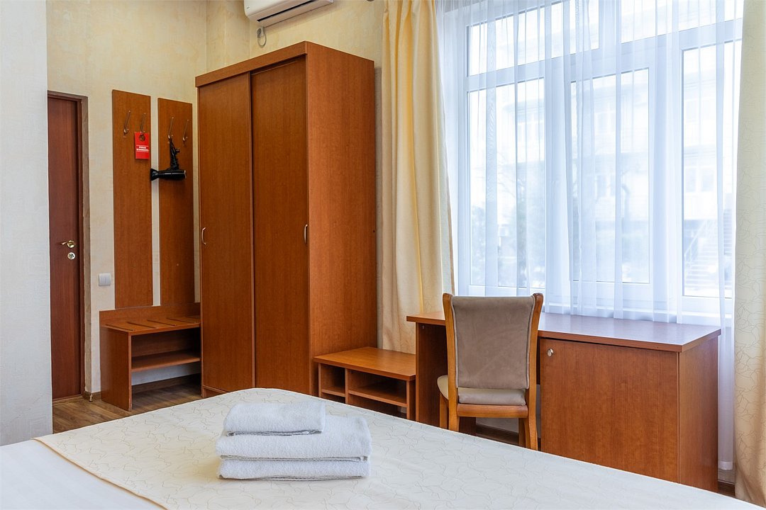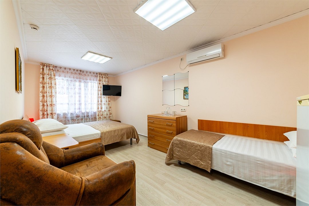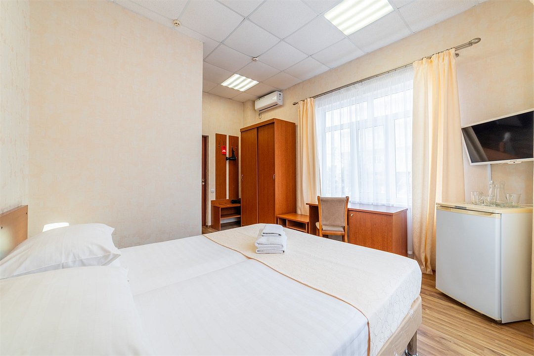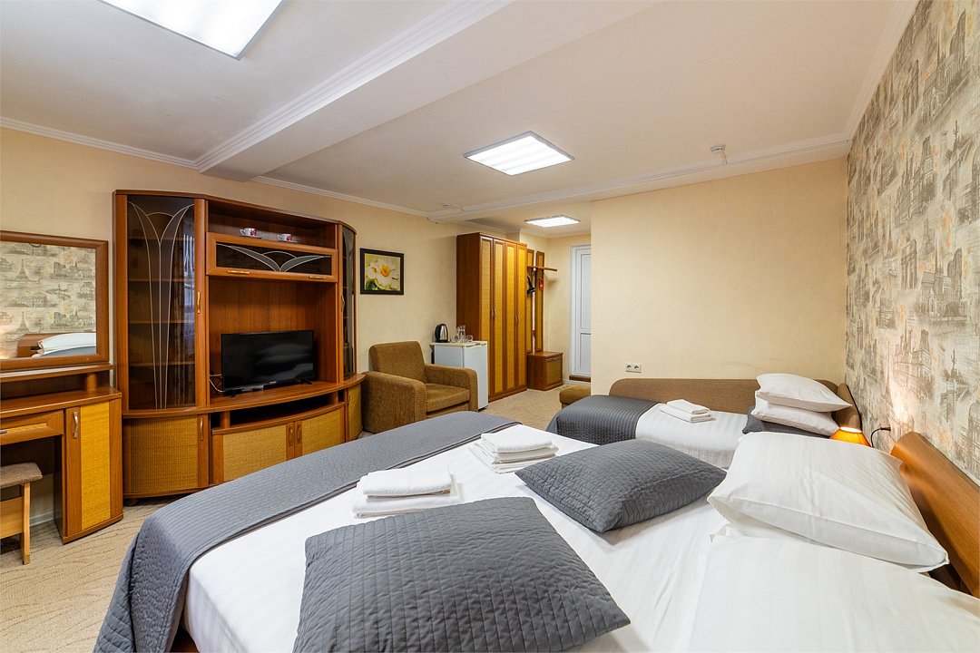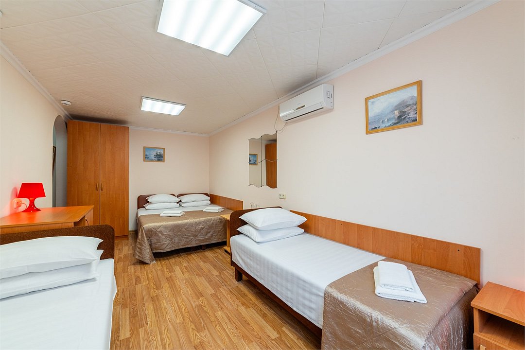 Комфортный однокомнатный стандартный номер без балкона с возможностью размещения до 3-4 человек. Расположены номера в 4 корпусе на цокольном этаже (есть отдельный вход), на мансардном этаже (5 этаж, имеется лифт). Оптимально для отдыха семьи с размещением 1 гостя на кресло-кровати и 4-е дополнительное место на еврораскладушке или детской кроватки. Комплектация номера: две односпальные кровати, кресло-кровать, детская кроватка, сплит-система, холодильник, телевизор, телефон. Санузел: душевая кабина, косметические принадлежности, фен.Услуги и удобства