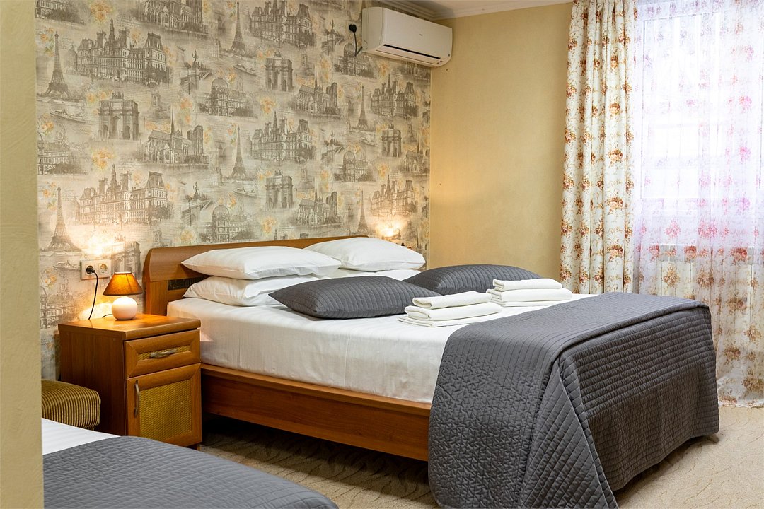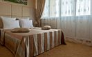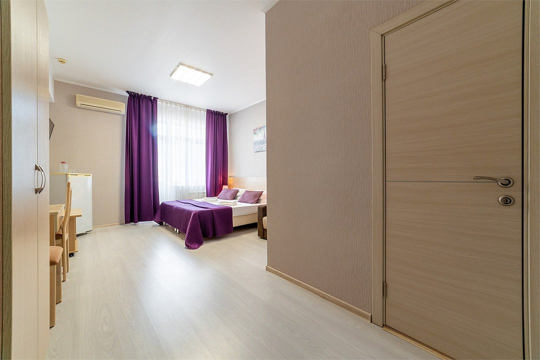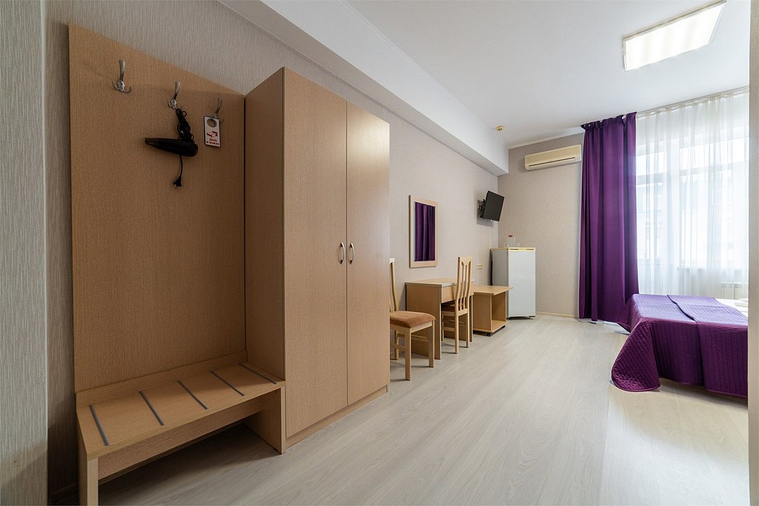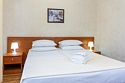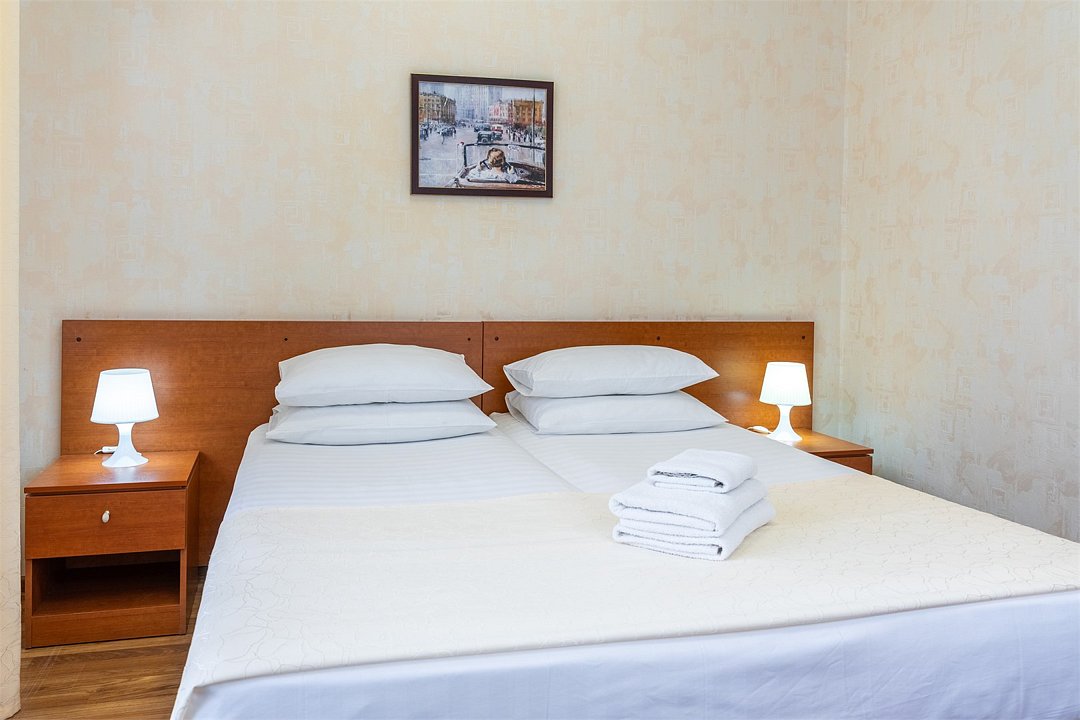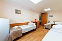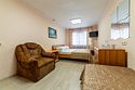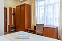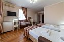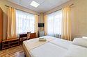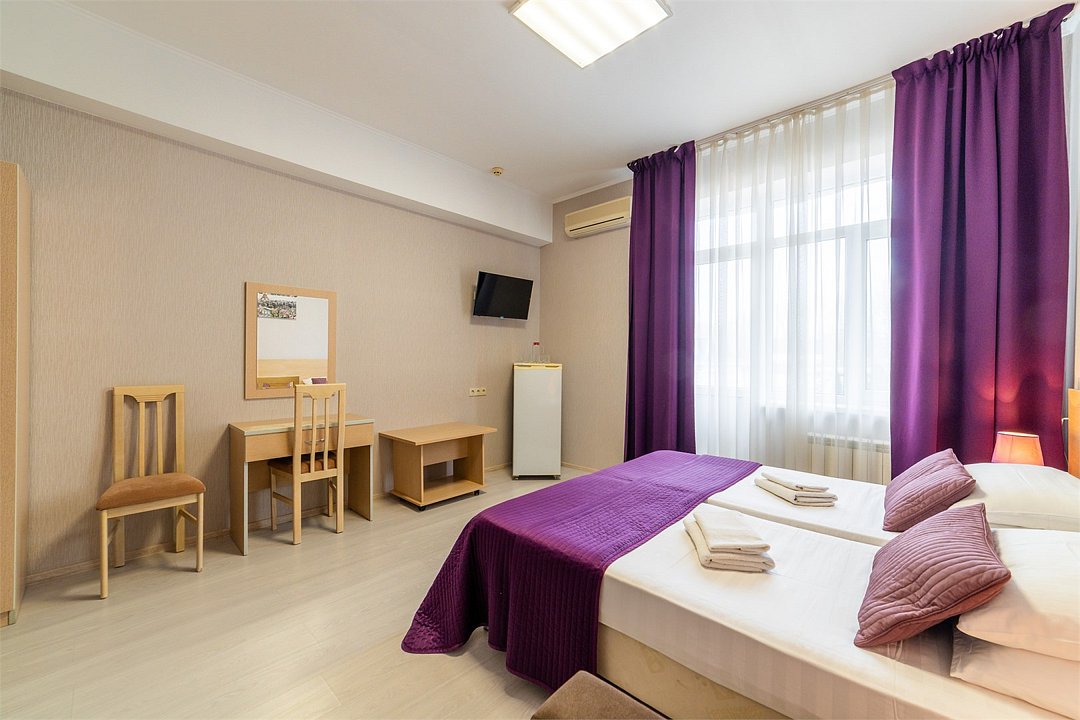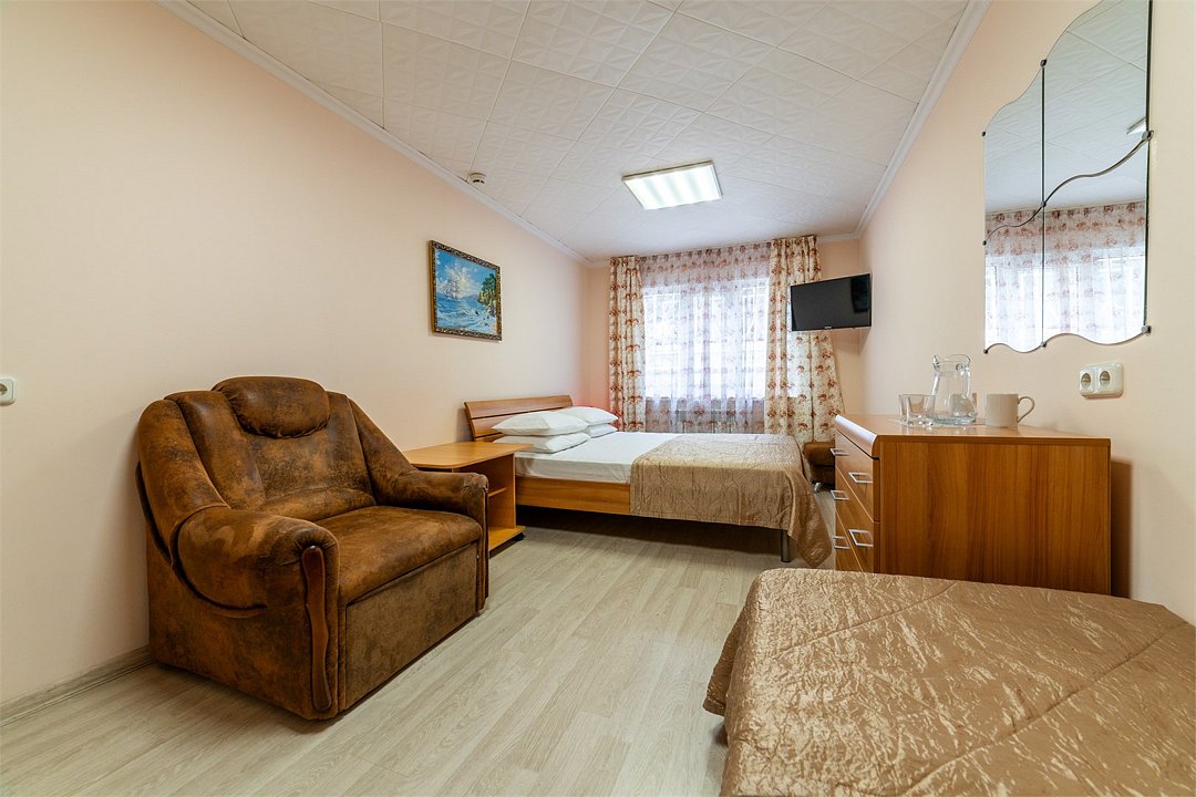 Комфортный однокомнатный стандартный номер без балкона с возможностью размещения до 3-4 человек. Расположены номера в 4 корпусе на цокольном этаже (есть отдельный вход), на мансардном этаже (5 этаж, имеется лифт). Оптимально для отдыха семьи с размещением 1 гостя на кресло-кровати и 4-е дополнительное место на еврораскладушке или детской кроватки. Комплектация номера: две односпальные кровати, кресло-кровать, детская кроватка, сплит-система, холодильник, телевизор, телефон. Санузел: душевая кабина, косметические принадлежности, фен.Услуги и удобства