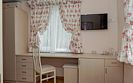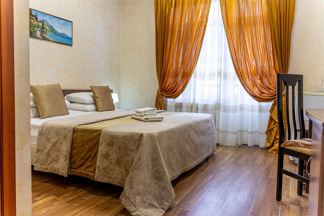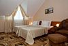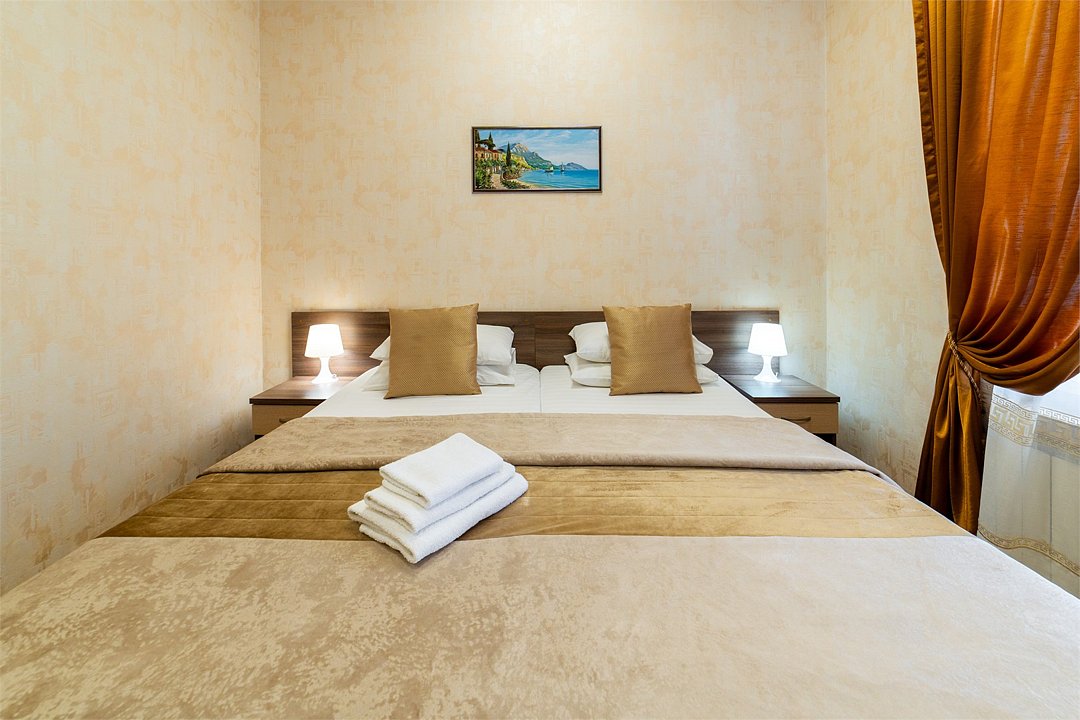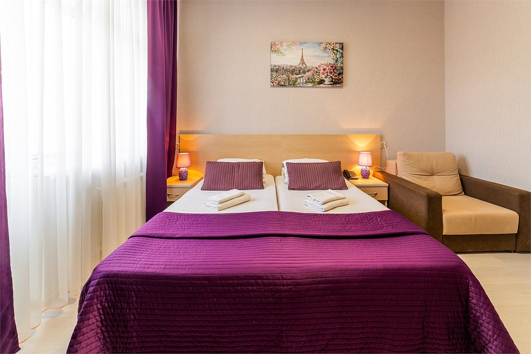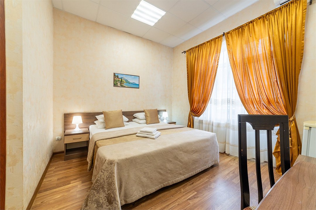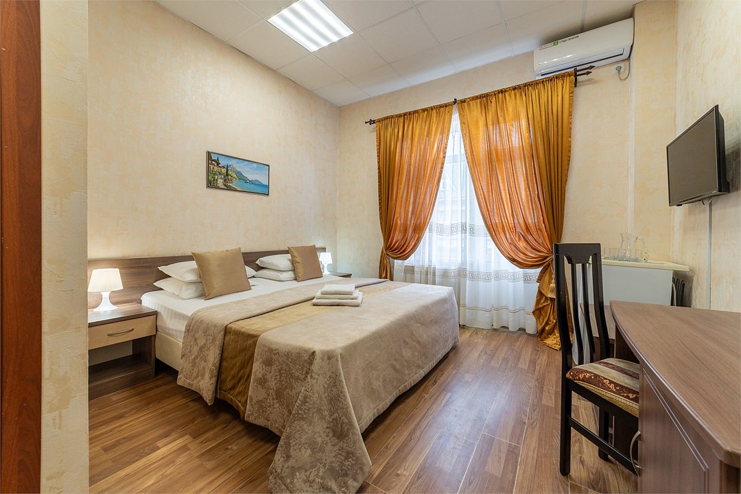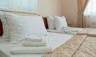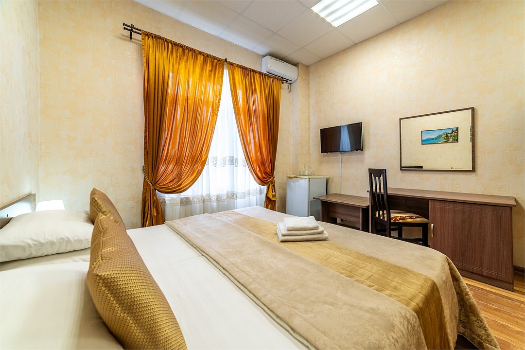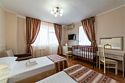 Комфортный однокомнатный стандартный номер без балкона с возможностью размещения до 3-4 человек. Расположены номера в 4 корпусе на цокольном этаже (есть отдельный вход), на мансардном этаже (5 этаж, имеется лифт). Оптимально для отдыха семьи с размещением 1 гостя на кресло-кровати и 4-е дополнительное место на еврораскладушке или детской кроватки. Комплектация номера: две односпальные кровати, кресло-кровать, детская кроватка, сплит-система, холодильник, телевизор, телефон. Санузел: душевая кабина, косметические принадлежности, фен.Услуги и удобства