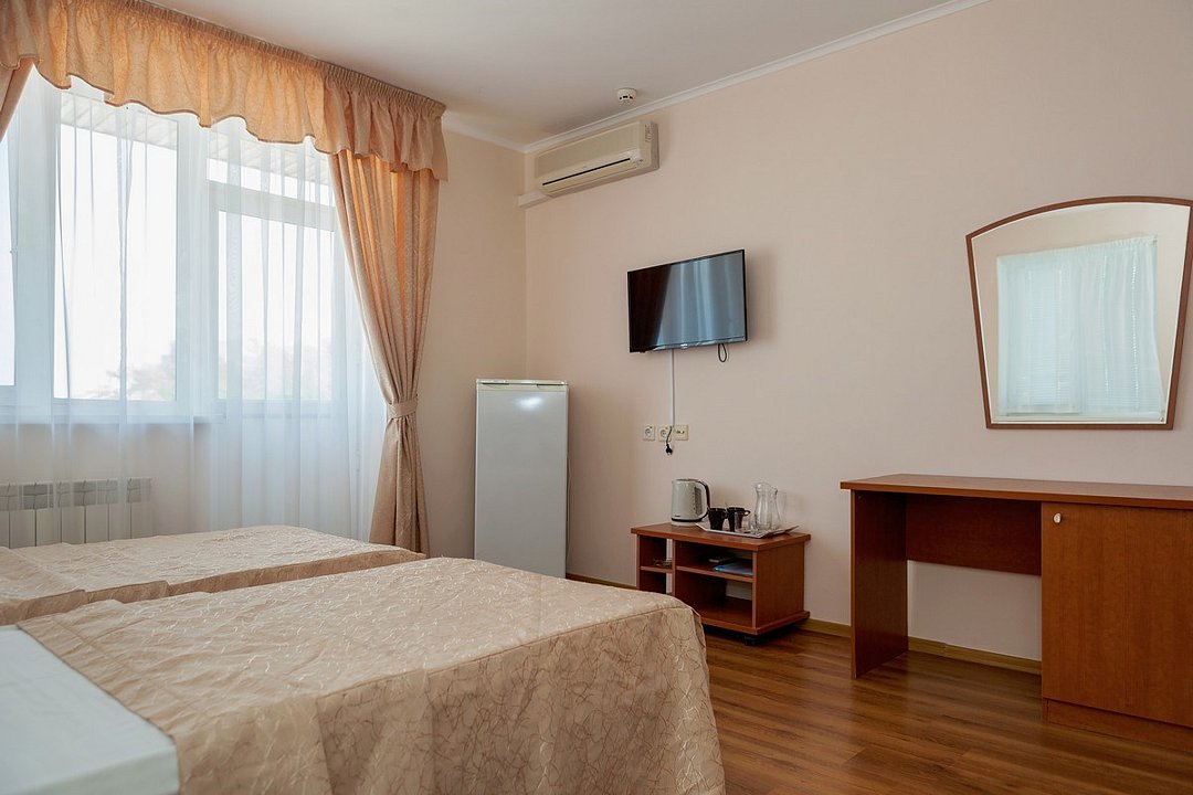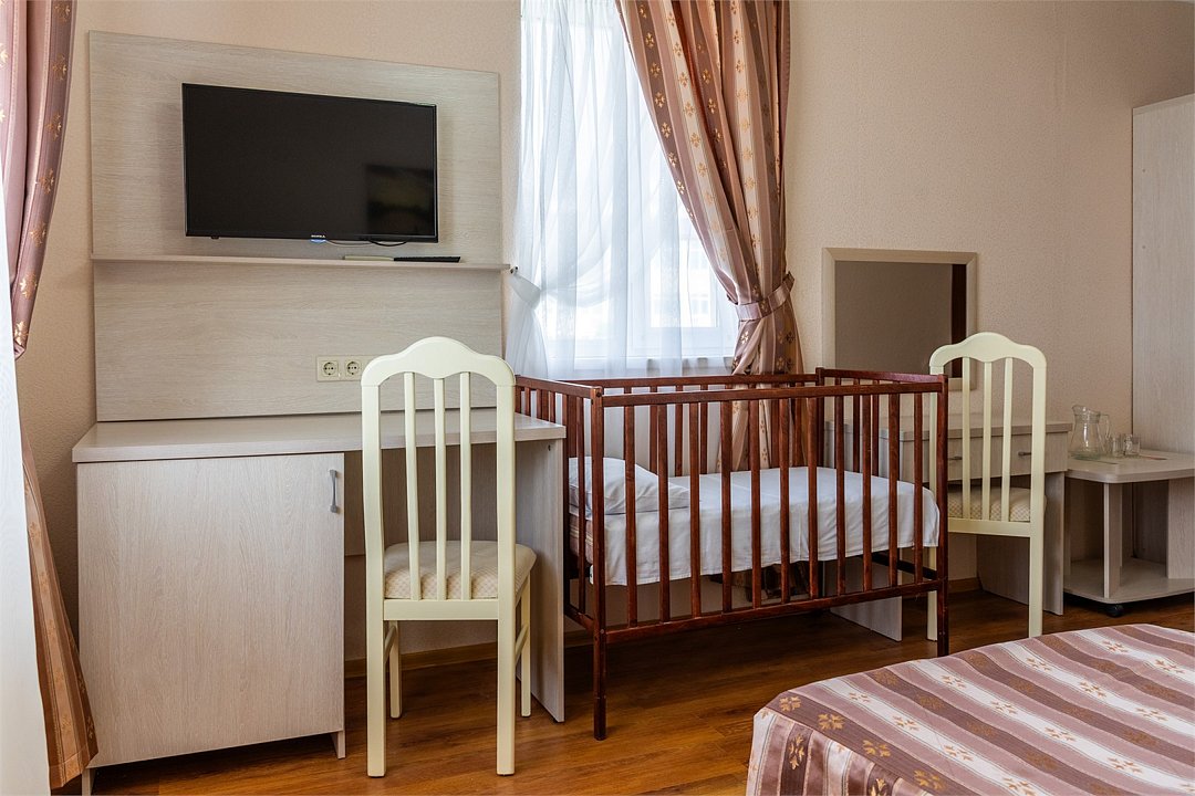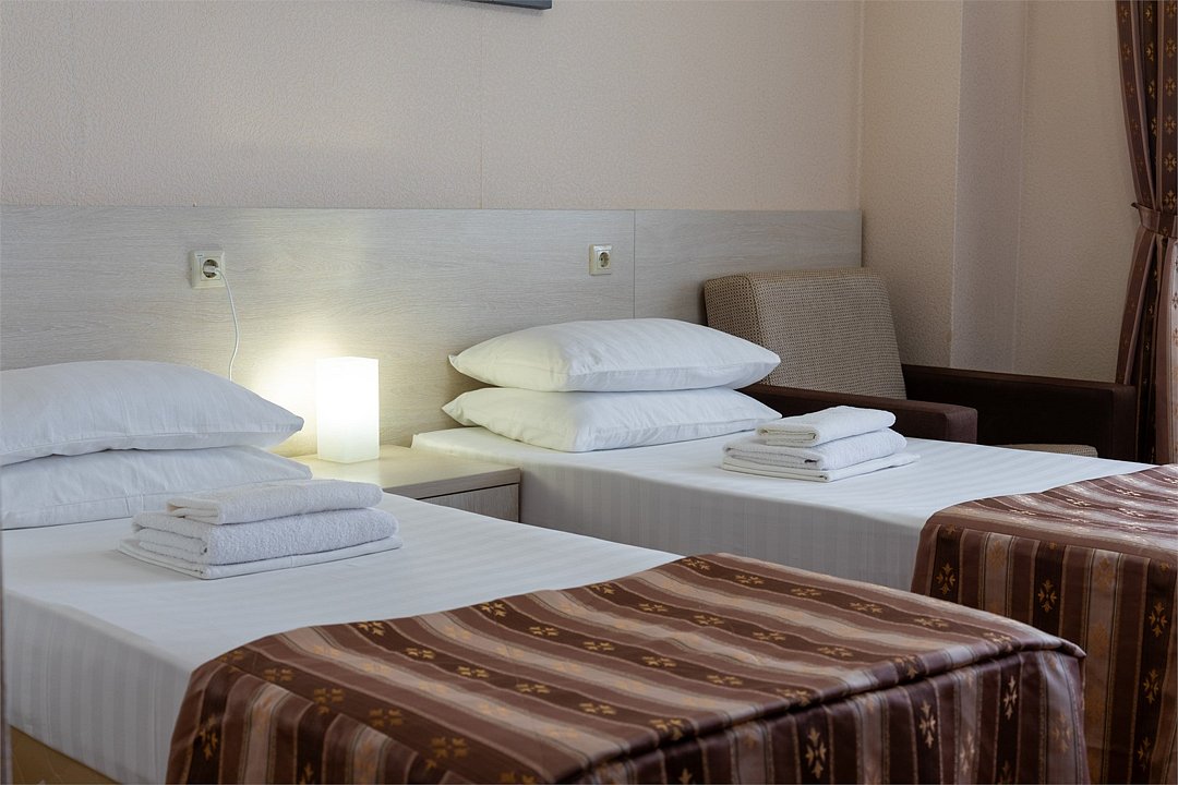 Комфортный однокомнатный стандартный номер с балконом с возможностью размещения до 2 человек. Расположены номера в 5 корпусе с 1 по 3 этаж (лифта нет). Оптимально для отдыха семьи с размещением 1 ребенка на дополнительном месте до 5 лет. Комплектация номера: две односпальные кровати, детская кроватка, сплит-система, холодильник, телевизор, телефон. Санузел: душевая кабина, косметические принадлежности, фен.Услуги и удобства