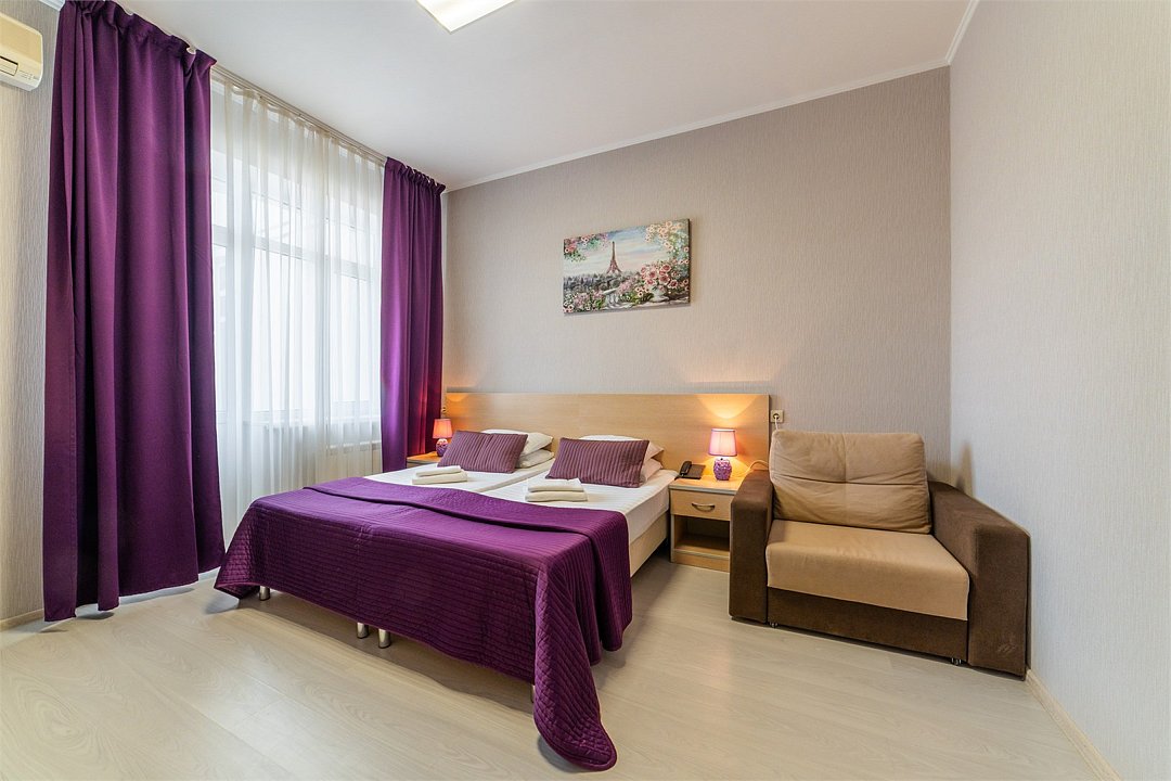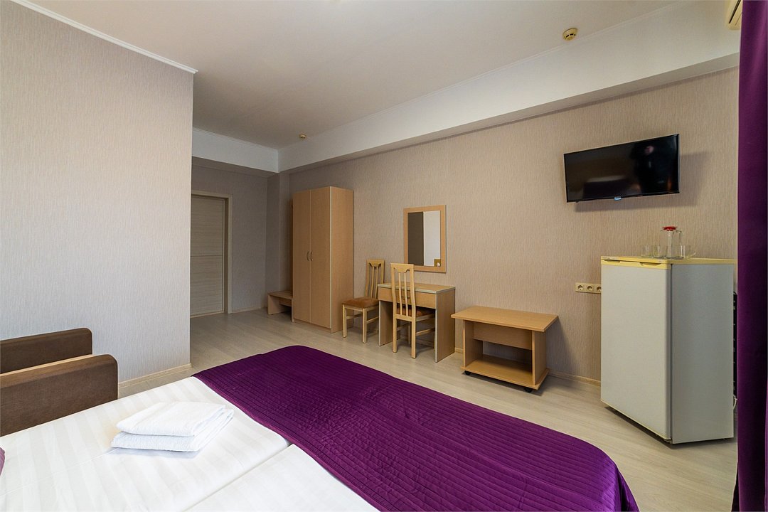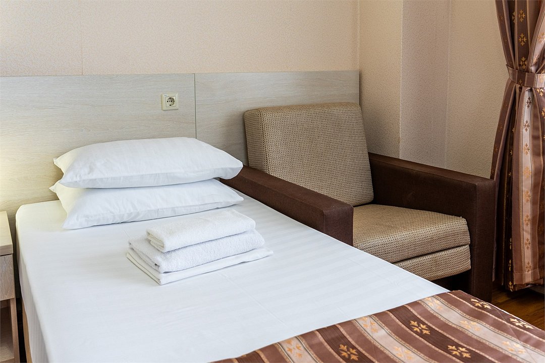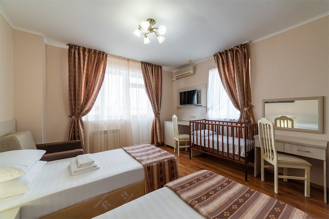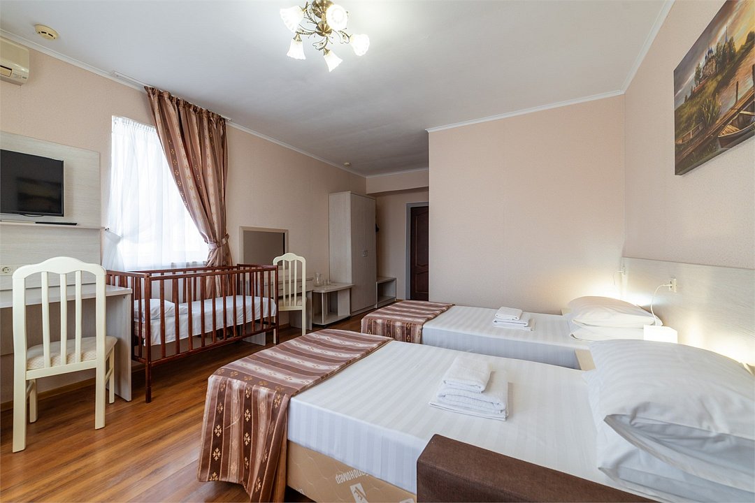 Комфортный однокомнатный стандартный номер с балконом с возможностью размещения до 3-4 человек. Расположены номера в 4 корпусе с 3 по 4 этаж (имеется лифт). Оптимально для отдыха семьи с размещением 1 гостя на кресло-кровати и 4-е дополнительное место на еврораскладушке или детской кроватки. Комплектация номера: две односпальные кровати, кресло-кровать, детская кроватка, сплит-система, холодильник, телевизор, телефон. Санузел: душевая кабина, косметические принадлежности, фен.Услуги и удобства