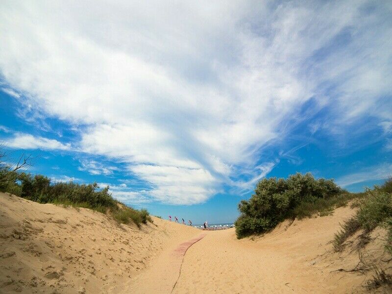 Песчаный пляж для гостей пансионата буквально рядом. Вход в море пологий и неглубокий, удобный для детского купания.