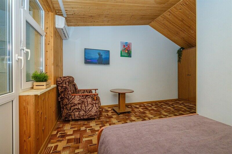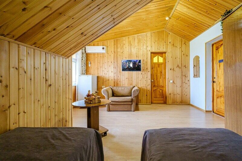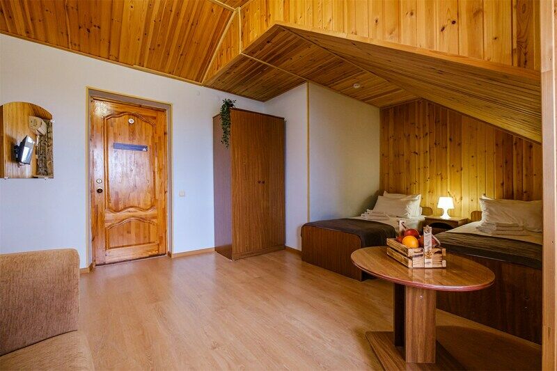 Номер предусматривает трехместное размещение. В номере две односпальных кровати. Предусмотрено 1 дополнительное место. Стены номера покрыты деревом, что создает особый уют. Вид из окна открывает панораму зеленной улицы.