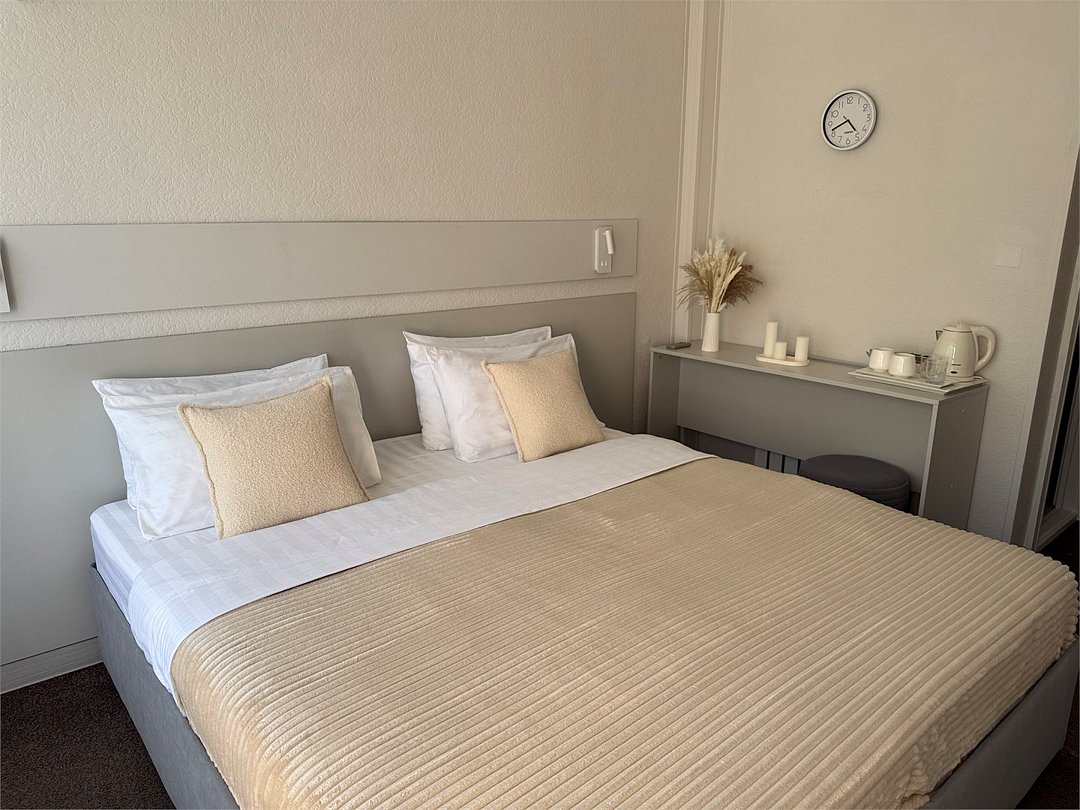 Улучшенный номер — идеальный выбор для тех, кто ценит повышенный комфорт. Этот номер отличается большим пространством и современным интерьером. В номере: большая двуспальная кровать, телевизор, холодильник, фен, чайный набор, а также ванная комната с душем. Это отличный вариант как для кратковременного, так и для более длительного проживания.Услуги и удобства