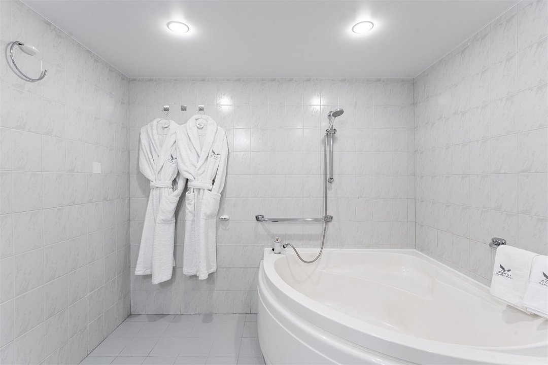 Wi-Fi, интернет, кондиционер, светильник, фен, санузел, банные принадлежности, халаты, банные полотенца, пляжные полотенца, тапочки, балкон, две односпальные или большая двуспальная кровать, тумбы, шкаф для одежды, чайный набор, чайник, ковровое покрытие, душ, стол, панорамные окна, телевизор с плоским экраном, мини-холодильник, пуфик, туалетные принадлежности премиум-класса, вешалки-плечики, мыло, затемняющая штораВ номере