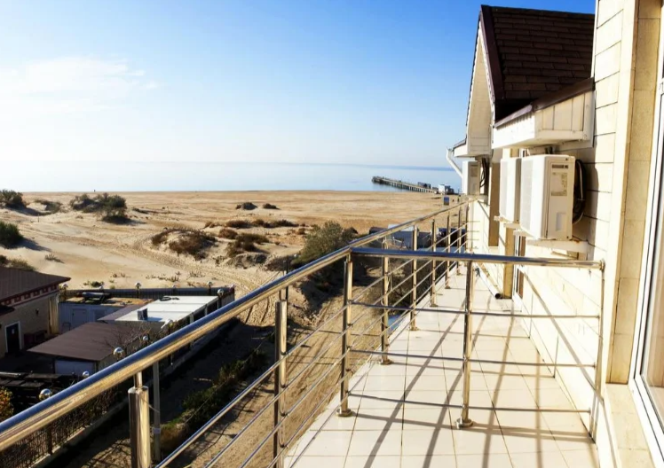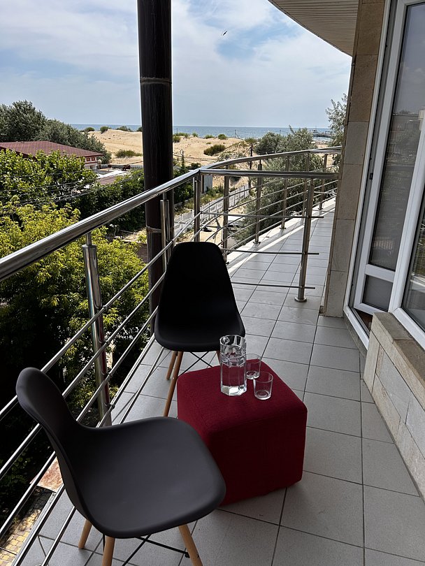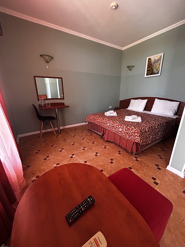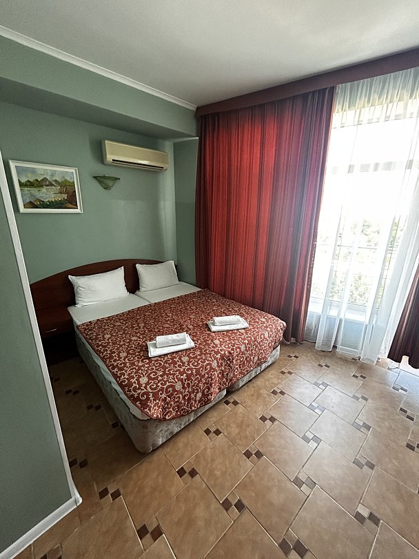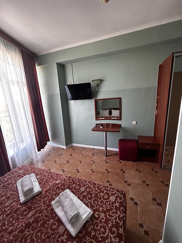 Пятиэтажный корпус отеля возвышается на первой береговой линии в 30 метрах от морского побережья. В распоряжении отдыхающих двух и трехместные номера с балконами. В каждом номере есть автономный санузел, небольшой холодильник, ЖК-телевизор и сплит-система.