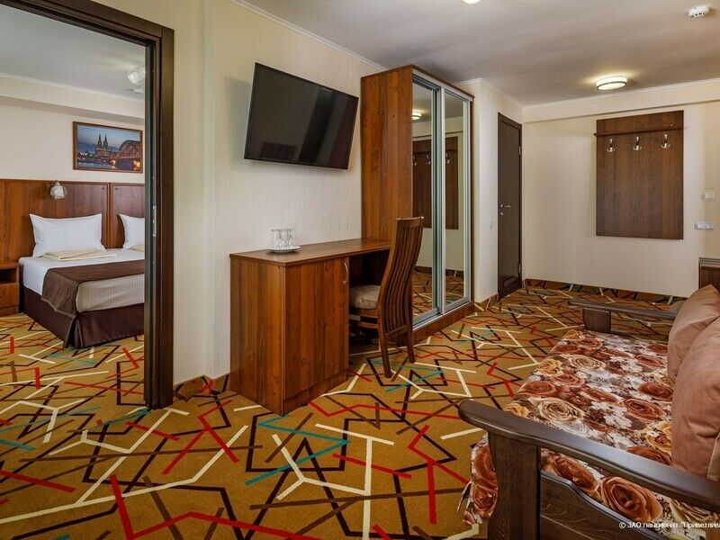 НОМЕР: У нас был стандартный номер. Шкаф, тумбочка, двухспальная кровать, раскладушка, телевизор, зеркало и под ним узенький столик (крайне не хватает освещения у зеркала), балкон с веревками и прищепками. В целом хороший номер. Душевая кабина просторная, комфортная, также есть фен, вся сантехника и электрика исправна. Убирались отлично каждой день, всегда чисто, полотенца и белье меняли часто. Мини-холодильник есть, но при заезде был пустой, пришлось просить воды, затем докладывали. Также на этаже есть гладильная доска с утюгом.