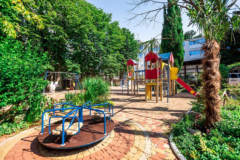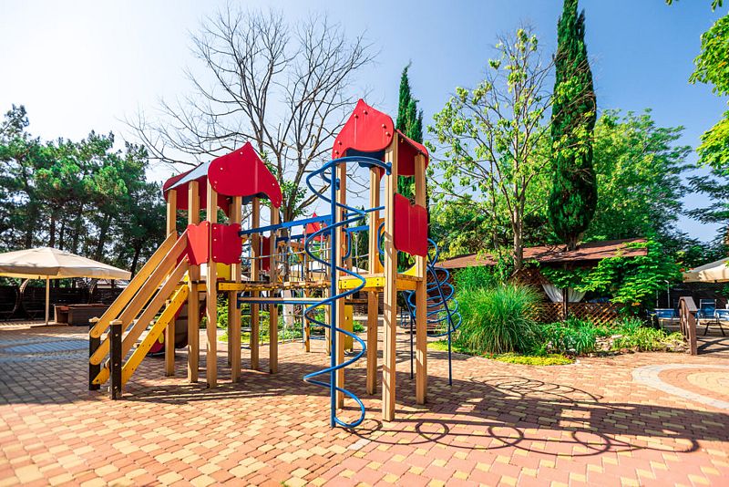 Современный детский игровой комплекс пансионата — это не просто детский игровой лабиринт. Это целый комплекс детского спортивного оборудования. Он состоит из песочницы, качелей для малышей и детей постарше, каруселей.