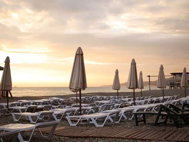 На территории галечного пляжа работает пункт аренды шезлонгов и зонтиков.