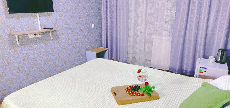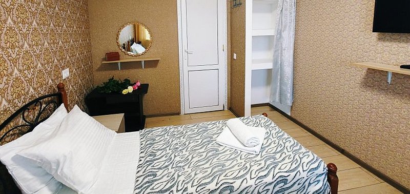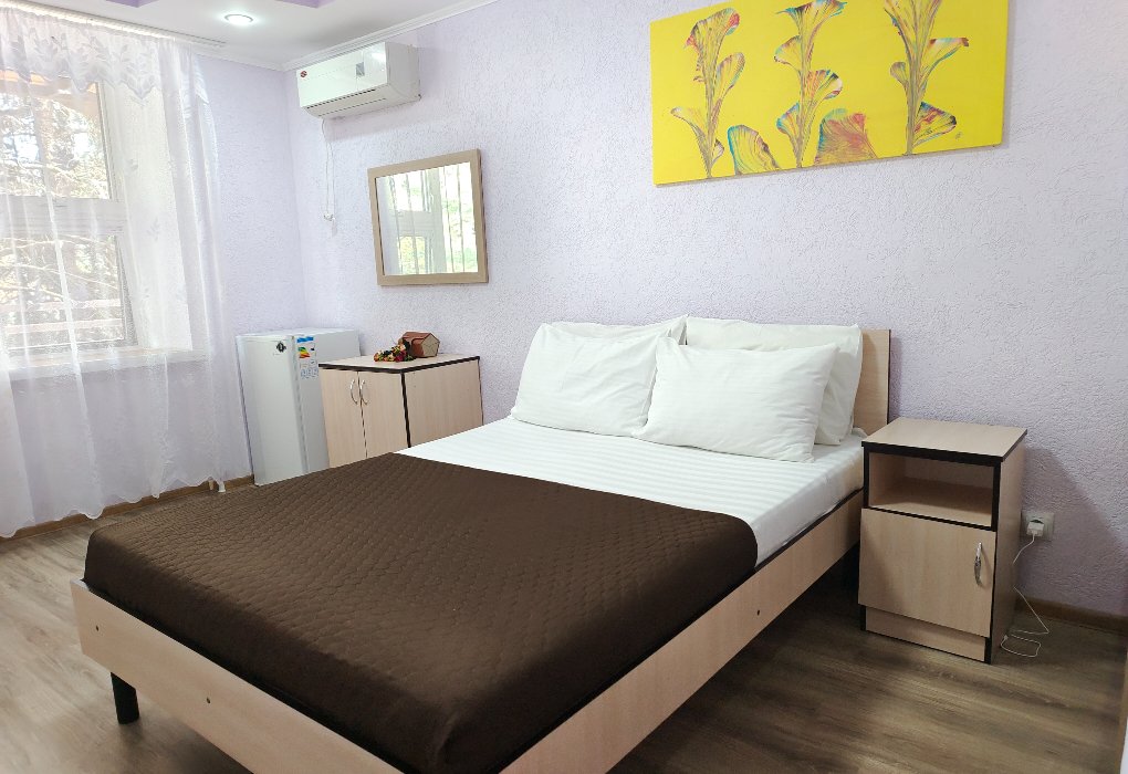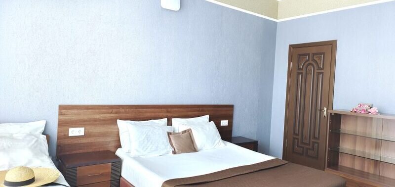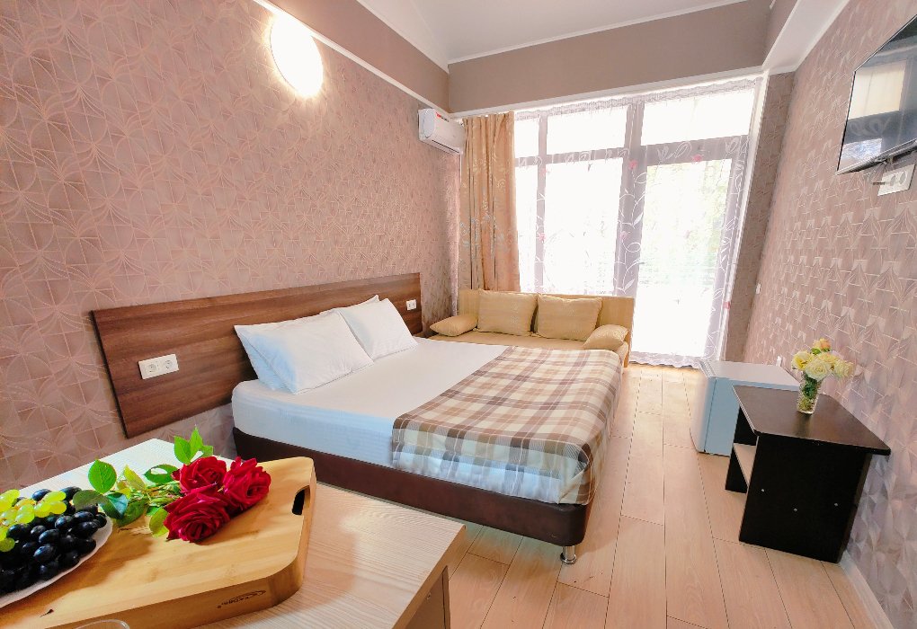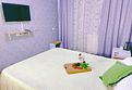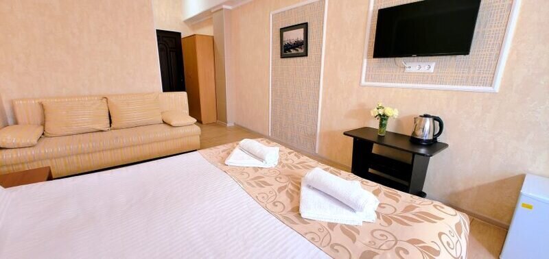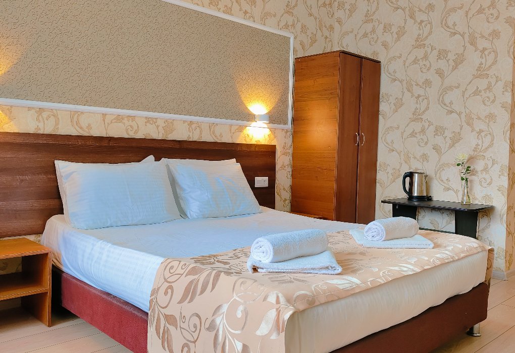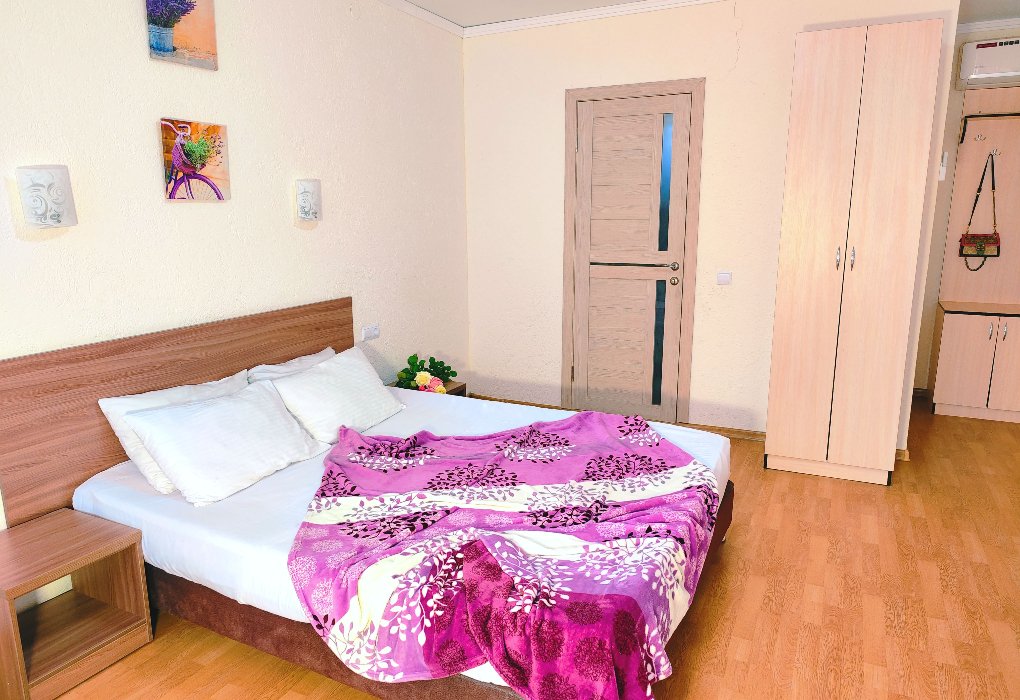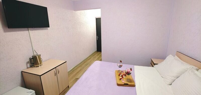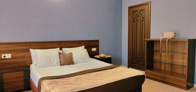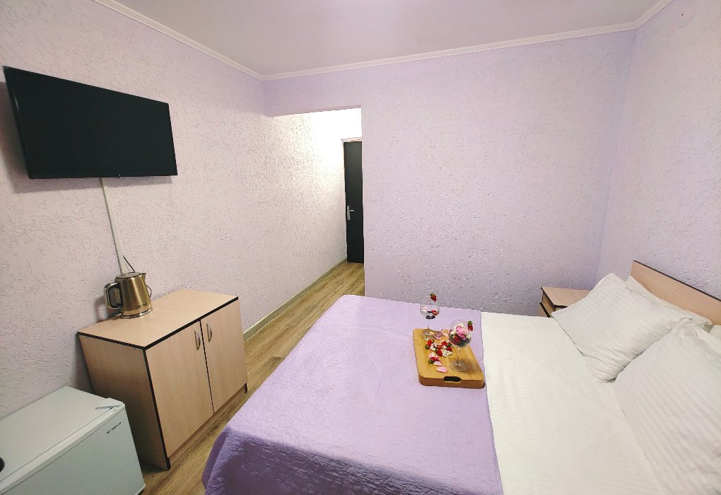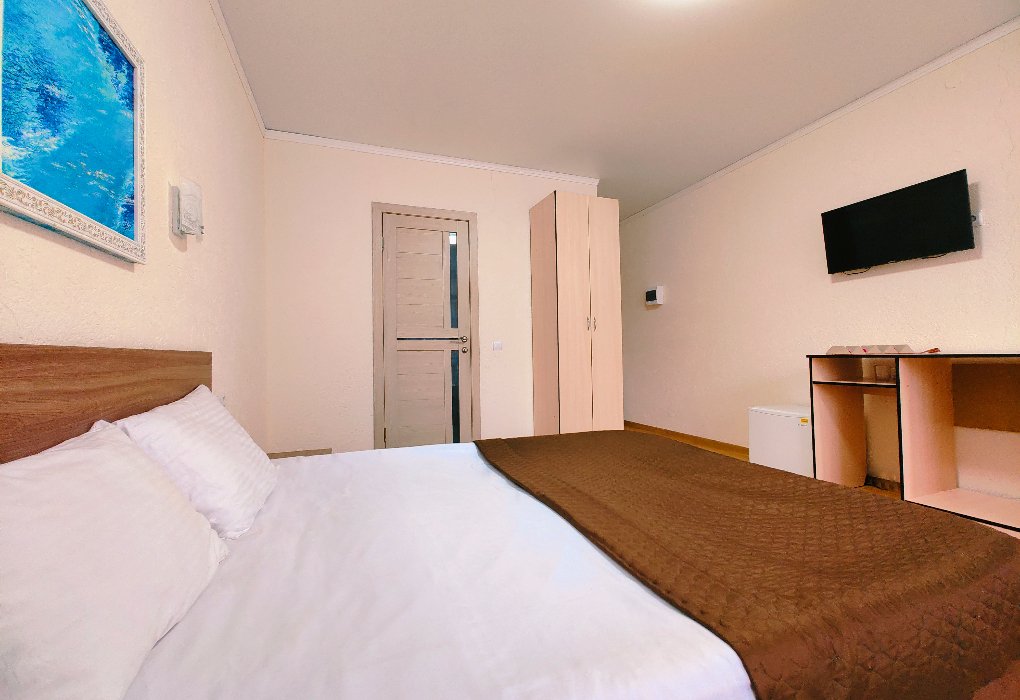 Двуспальная кровать, тв, сплит-система, мини холодильник, шкаф для одежды, тумбочки, журнальный столик, стол, зеркало, чайник, кружки, летняя мебель, набор одноразовой косметики (гель, шампунь, мыло)