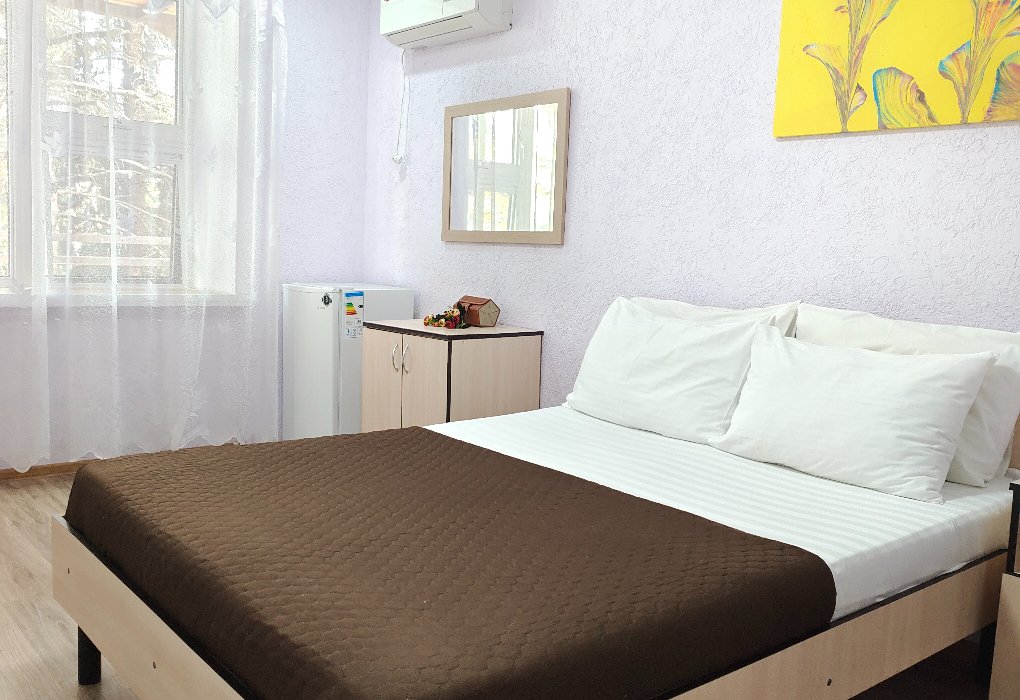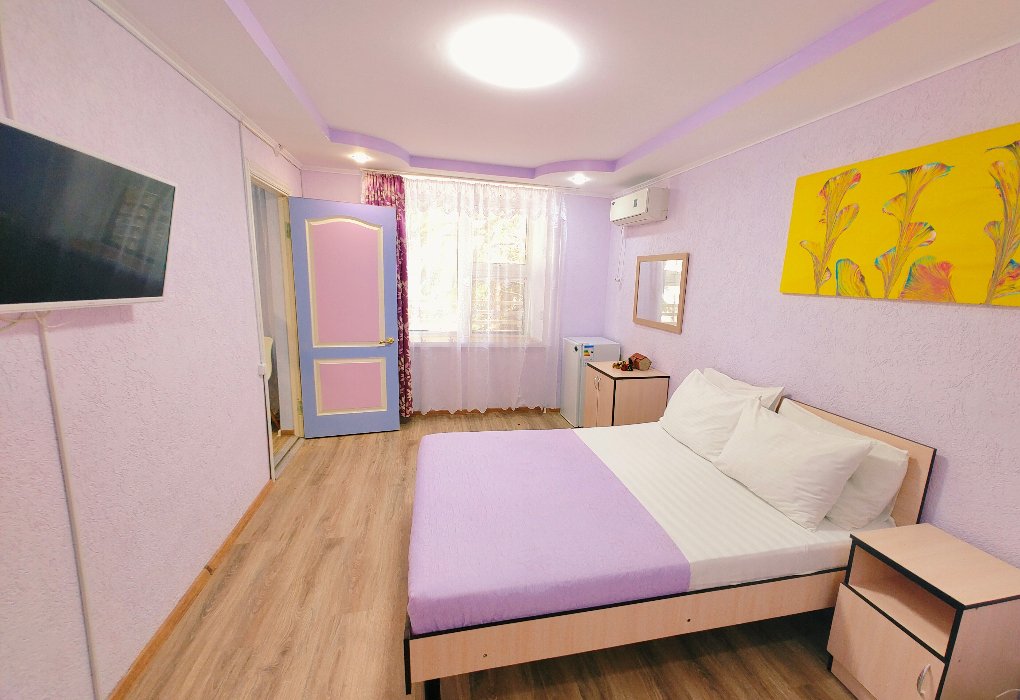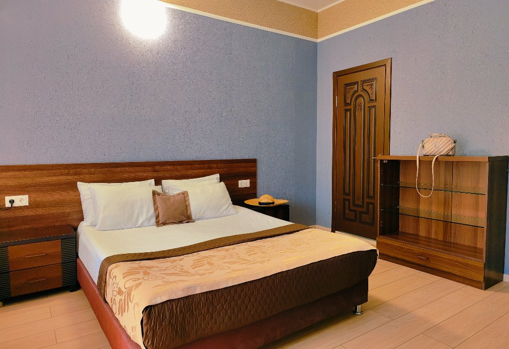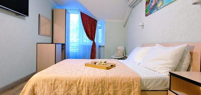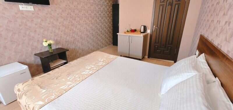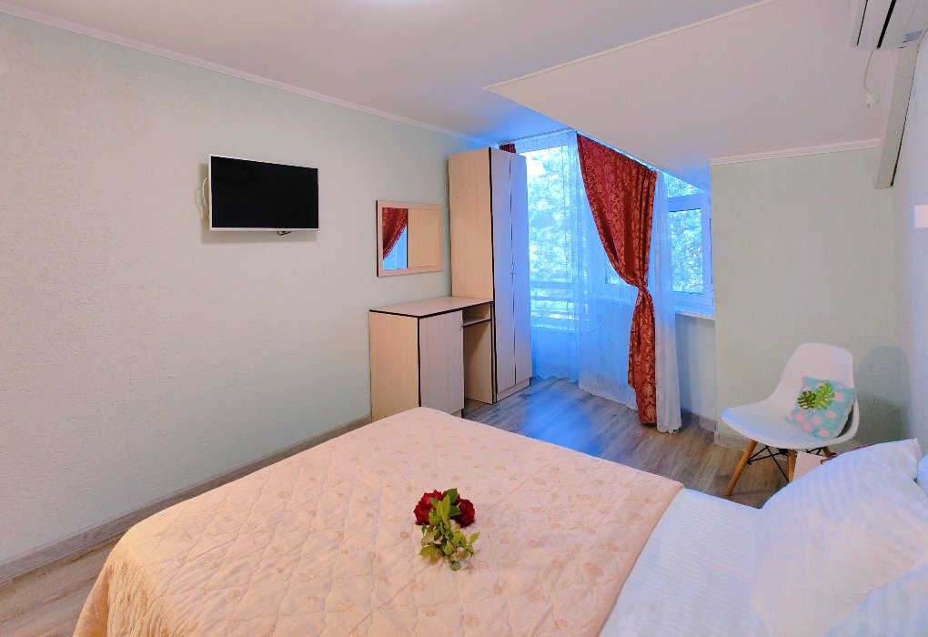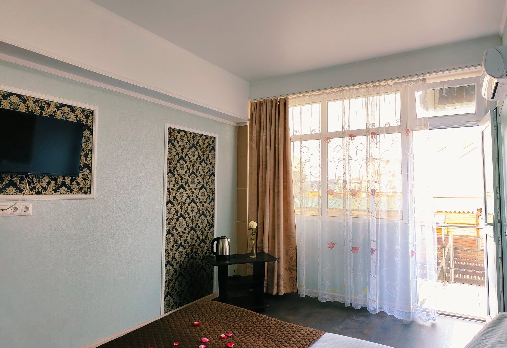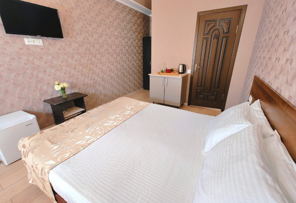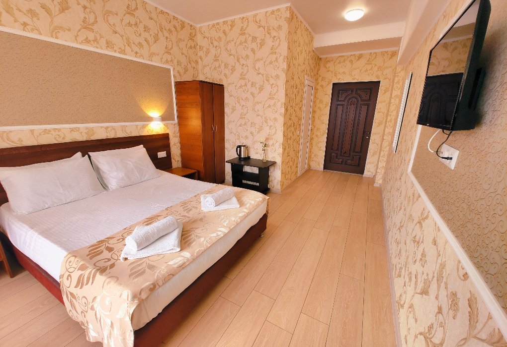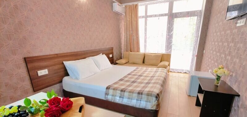Двуспальная кровать, тв, сплит-система, мини холодильник, шкаф для одежды, тумбочки, журнальный столик, стол, зеркало, чайник, кружки, летняя мебель, набор одноразовой косметики (гель, шампунь, мыло)