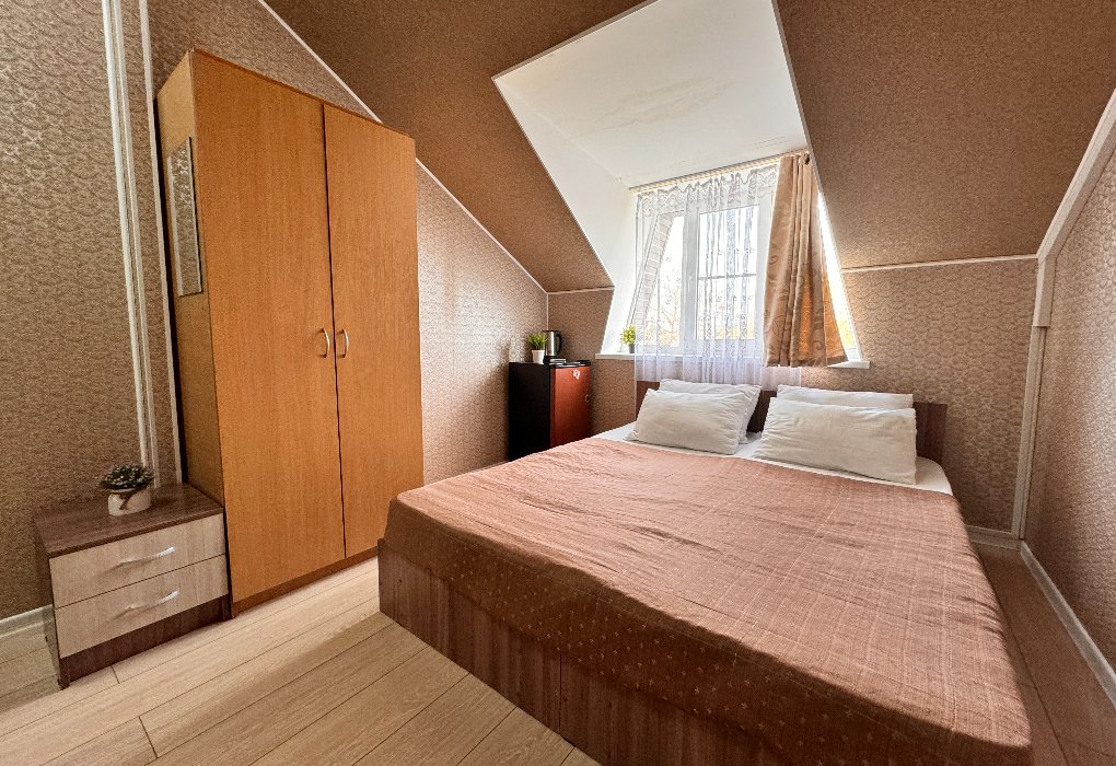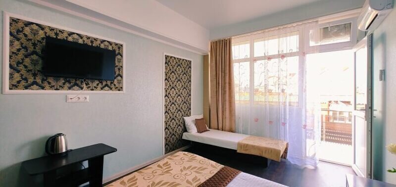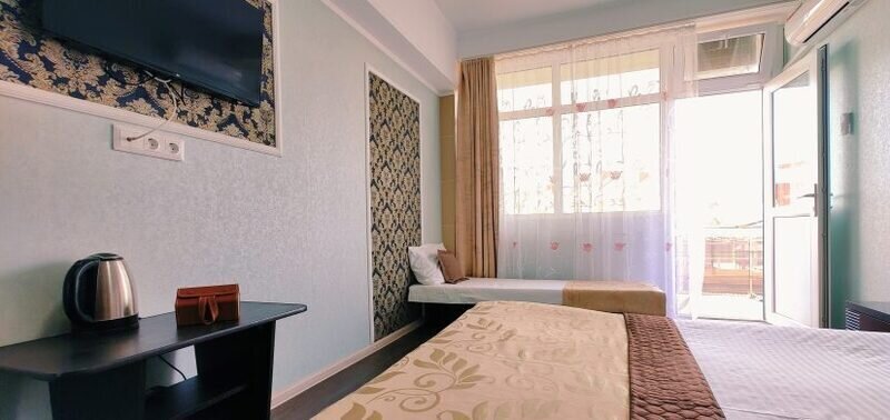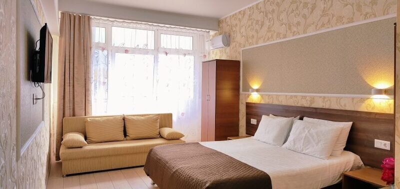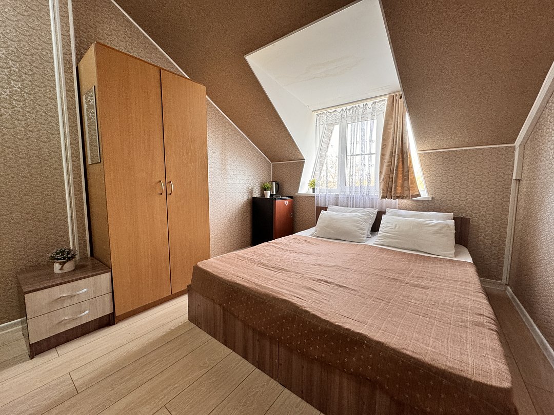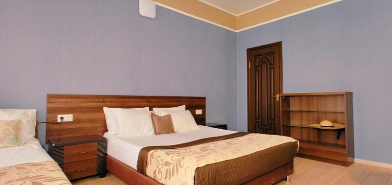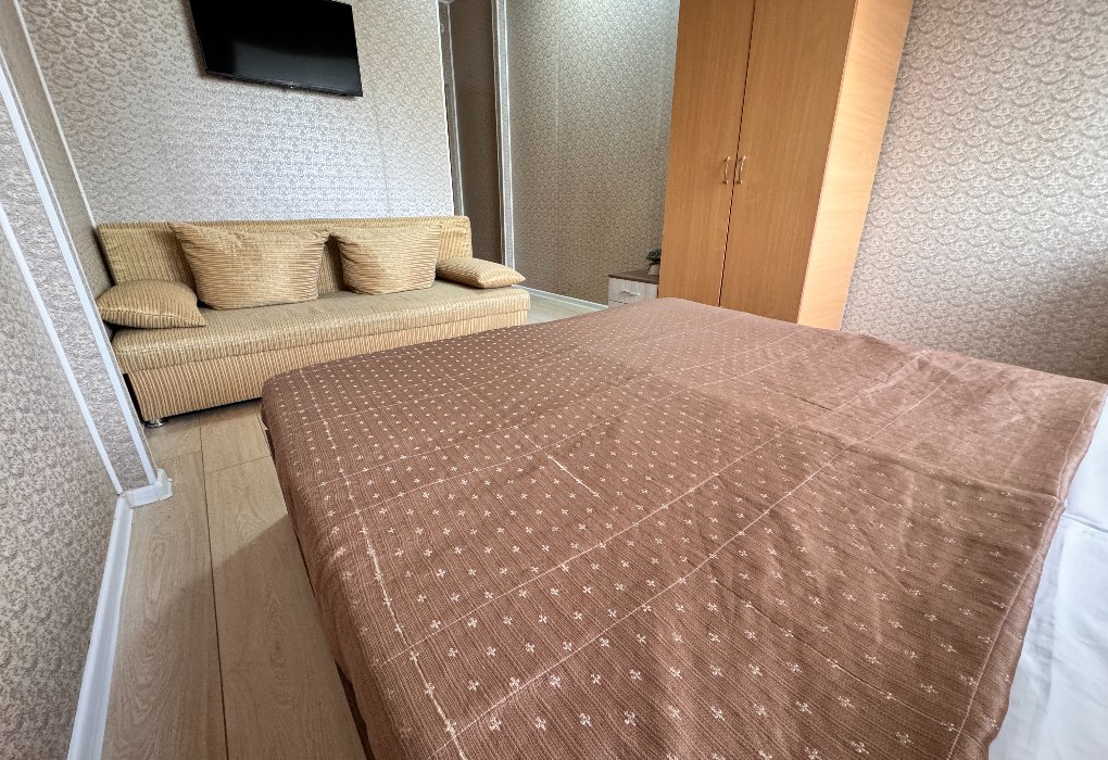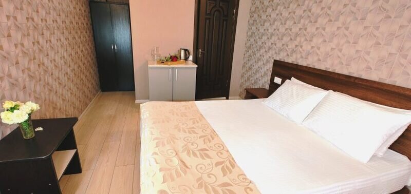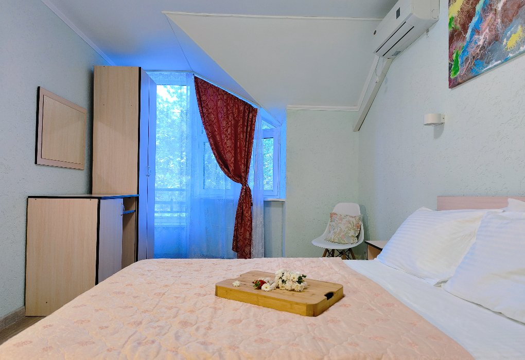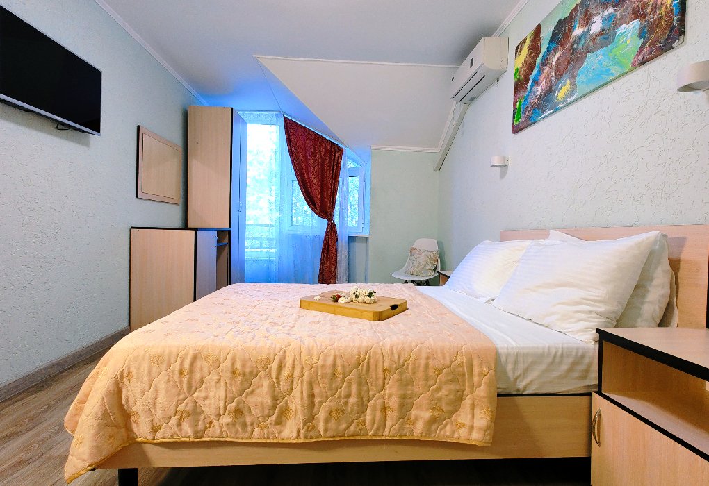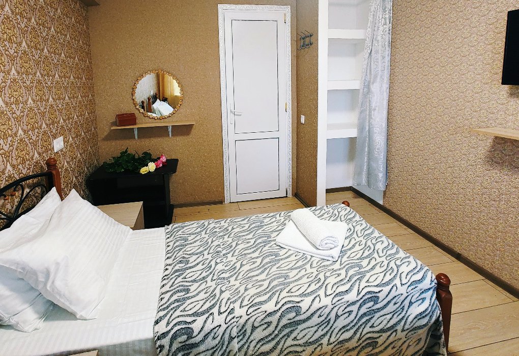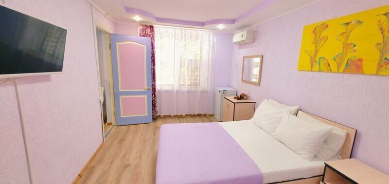 Двуспальная кровать, тв, сплит-система, мини холодильник, шкаф для одежды, тумбочки, журнальный столик, стол, зеркало, чайник, кружки, летняя мебель, набор одноразовой косметики (гель, шампунь, мыло)