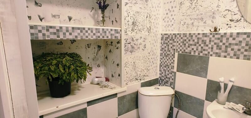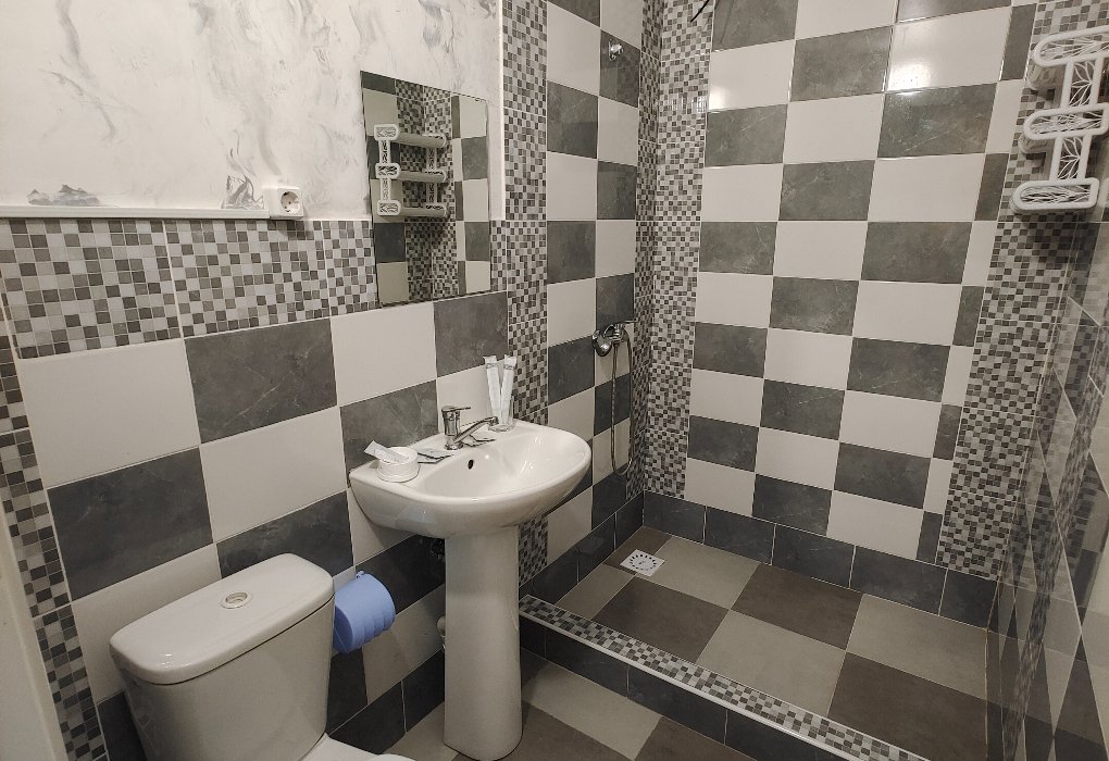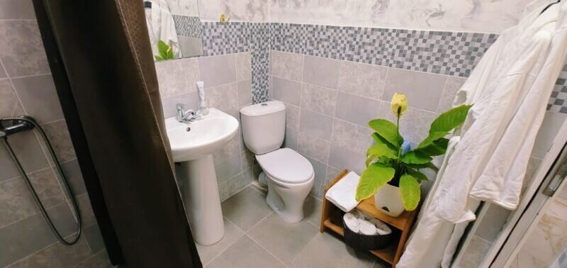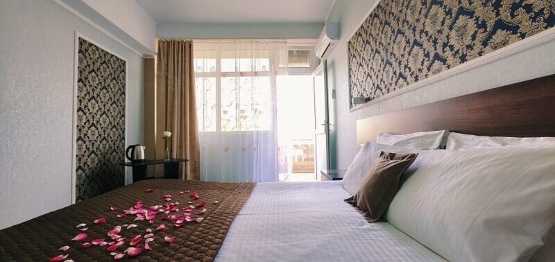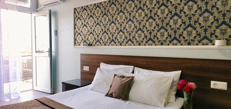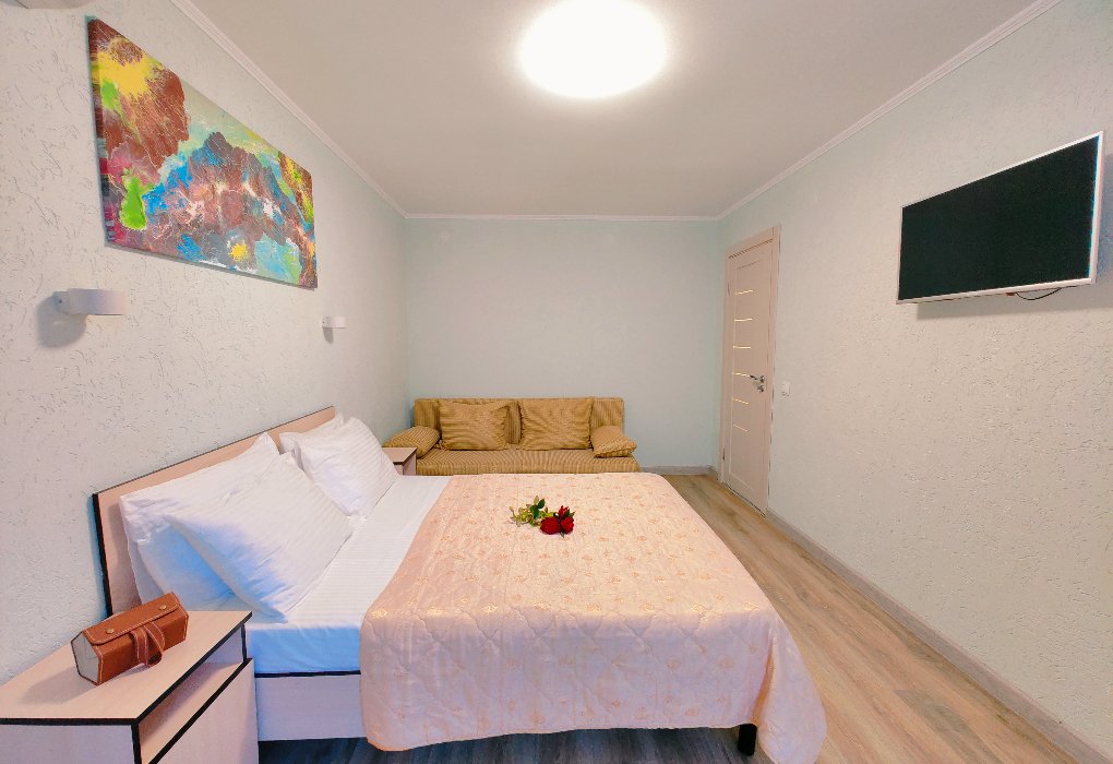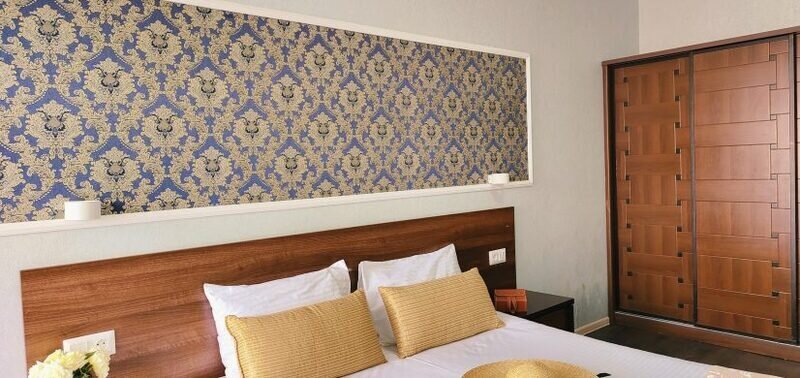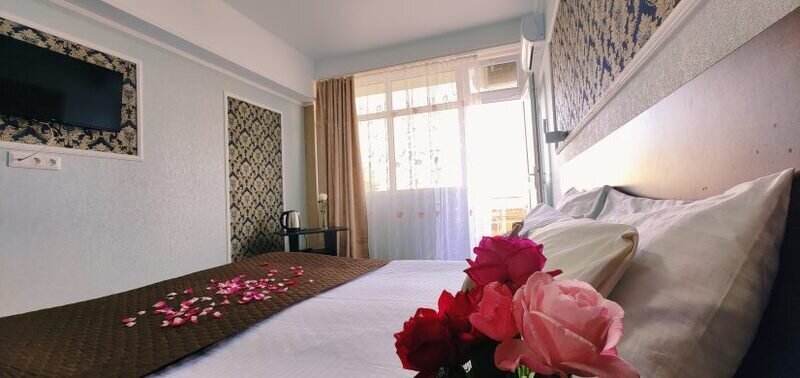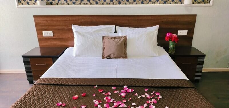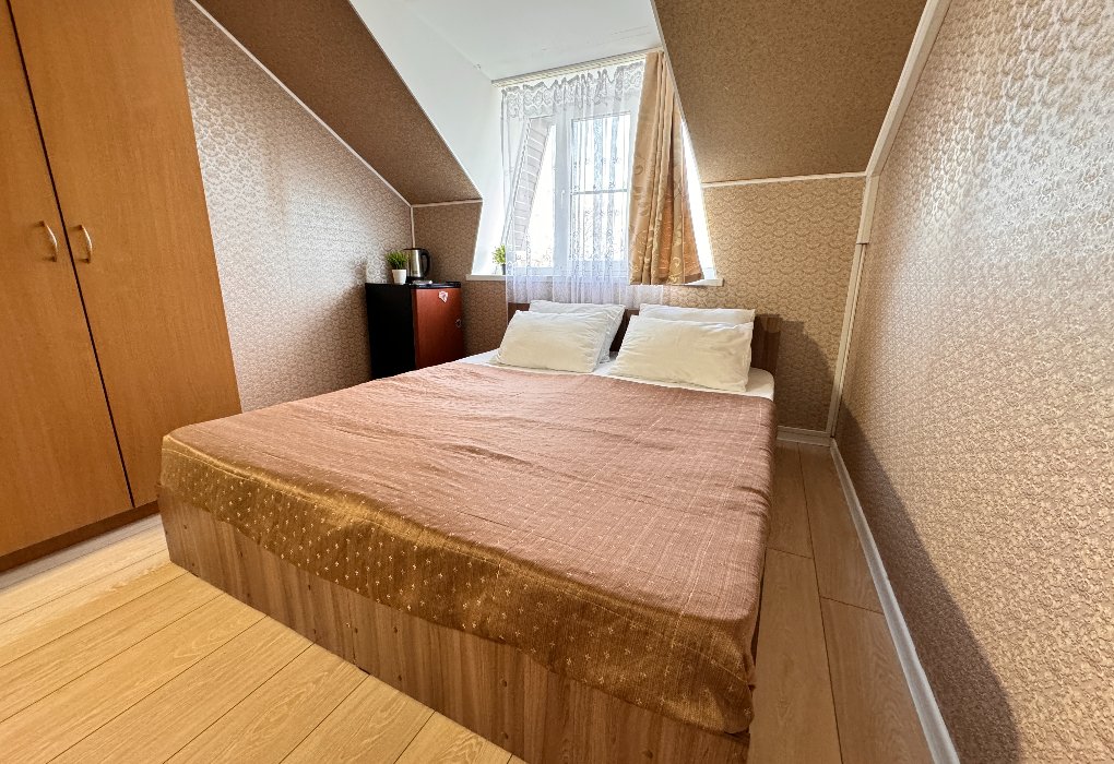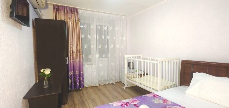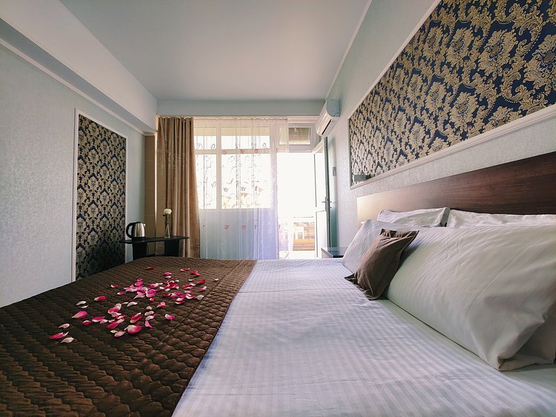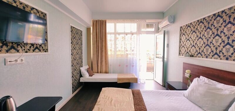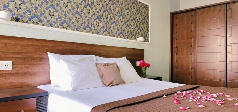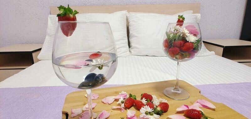 Двуспальная кровать, тв, сплит-система, мини холодильник, шкаф для одежды, тумбочки, журнальный столик, стол, зеркало, чайник, кружки, летняя мебель, набор одноразовой косметики (гель, шампунь, мыло)