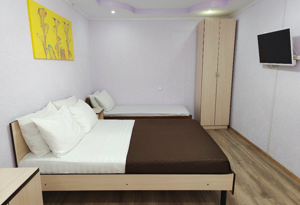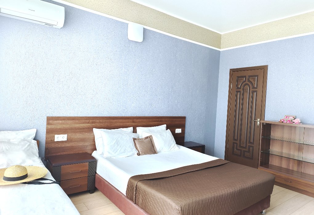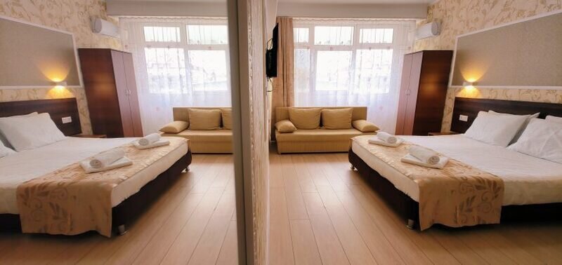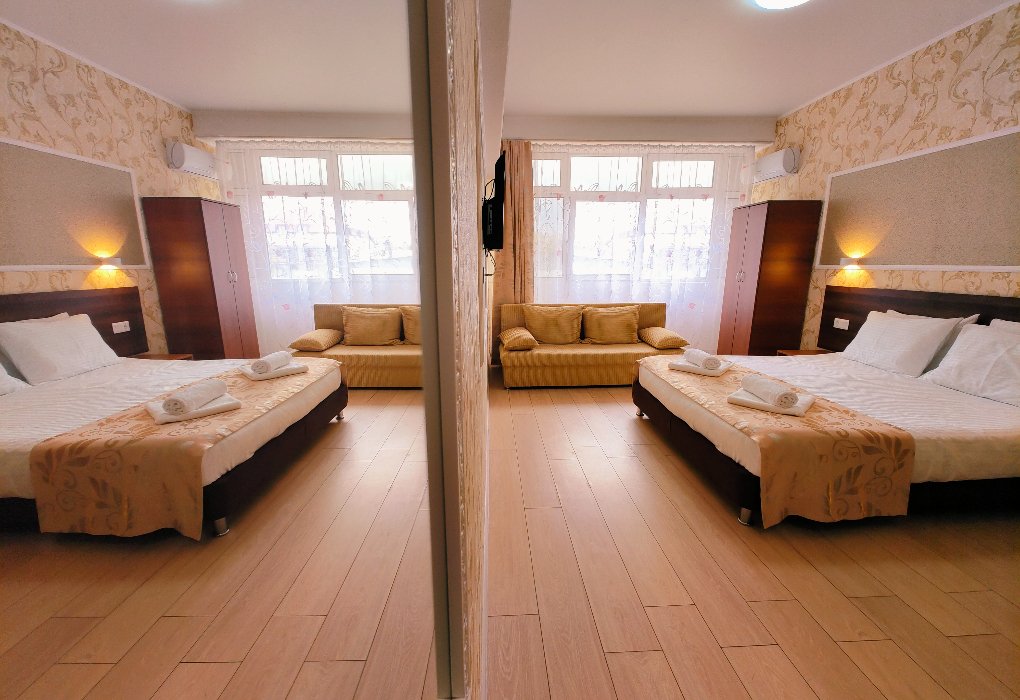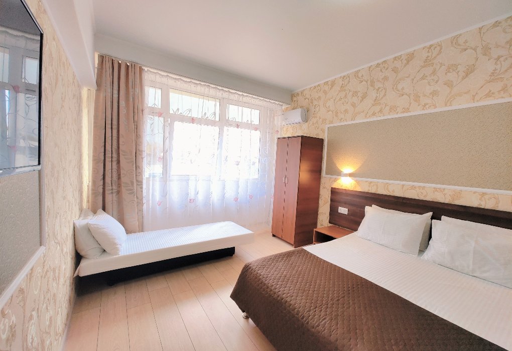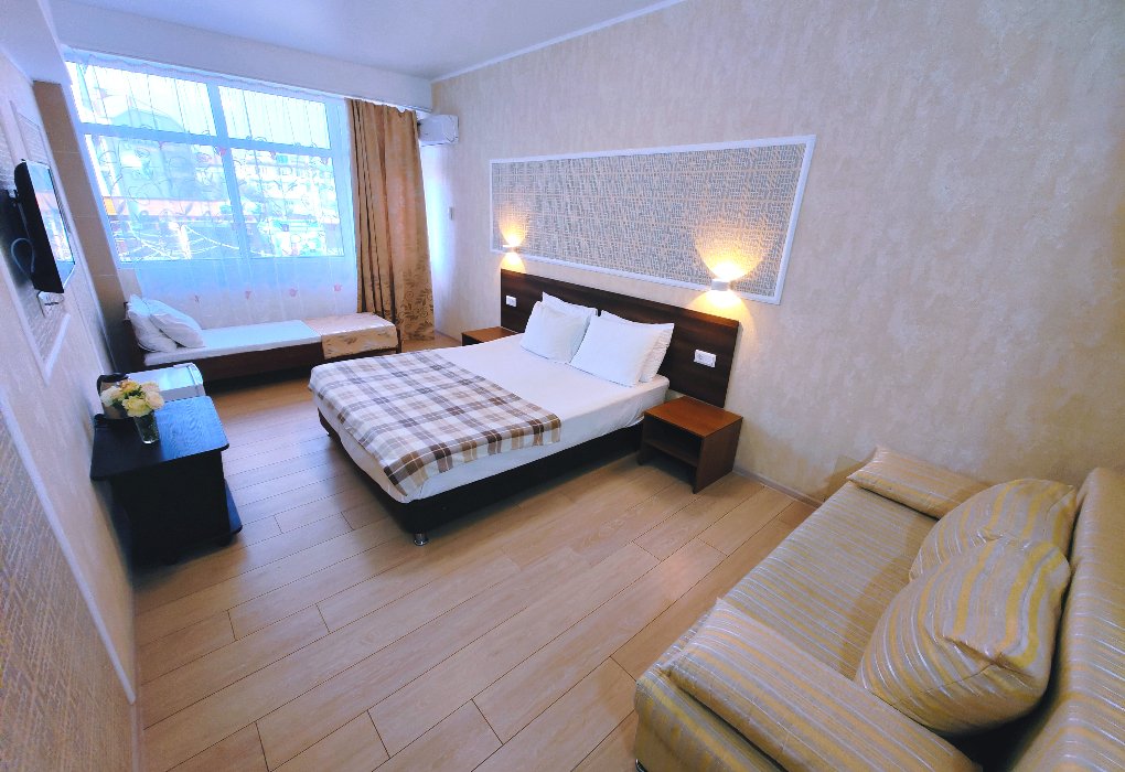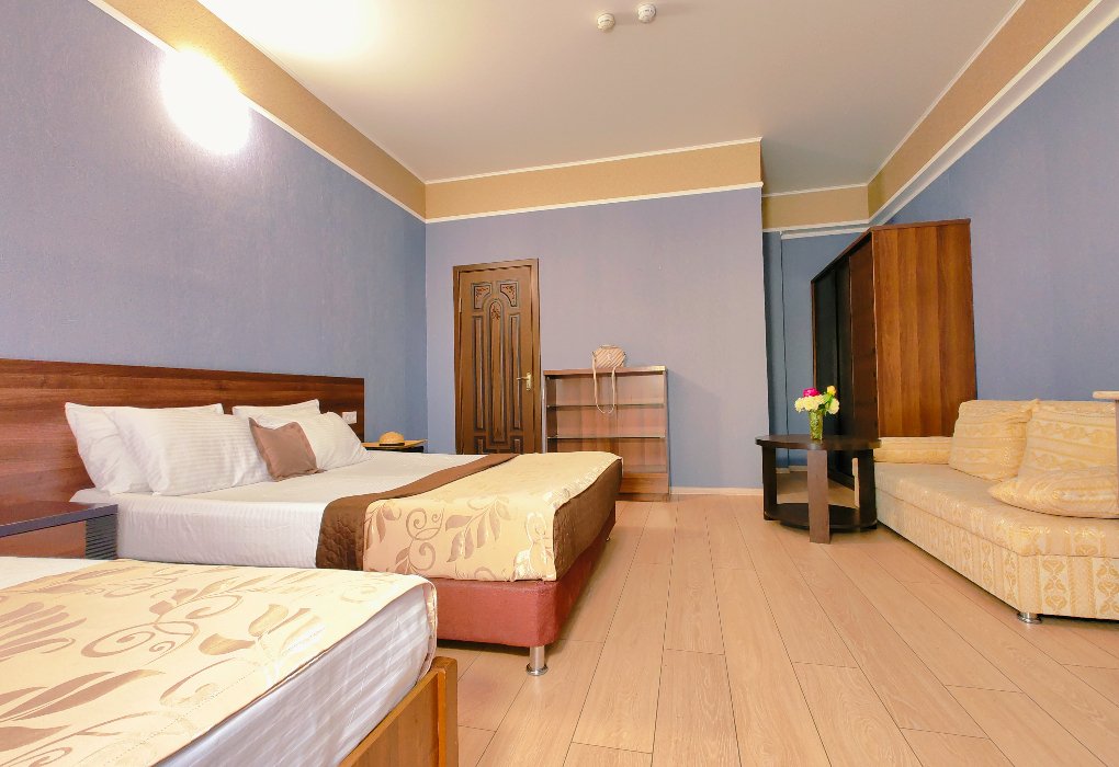 2-спальная кровать и 1-спальная кровать или 2-спальная кровать и 1-спальный диван, встроенный шкаф для одежды, тумбочки или журнальный столик, сплит система, мини холодильник, тв, чайник, кружки, набор одноразовой косметики (гель, шампунь, мыло).